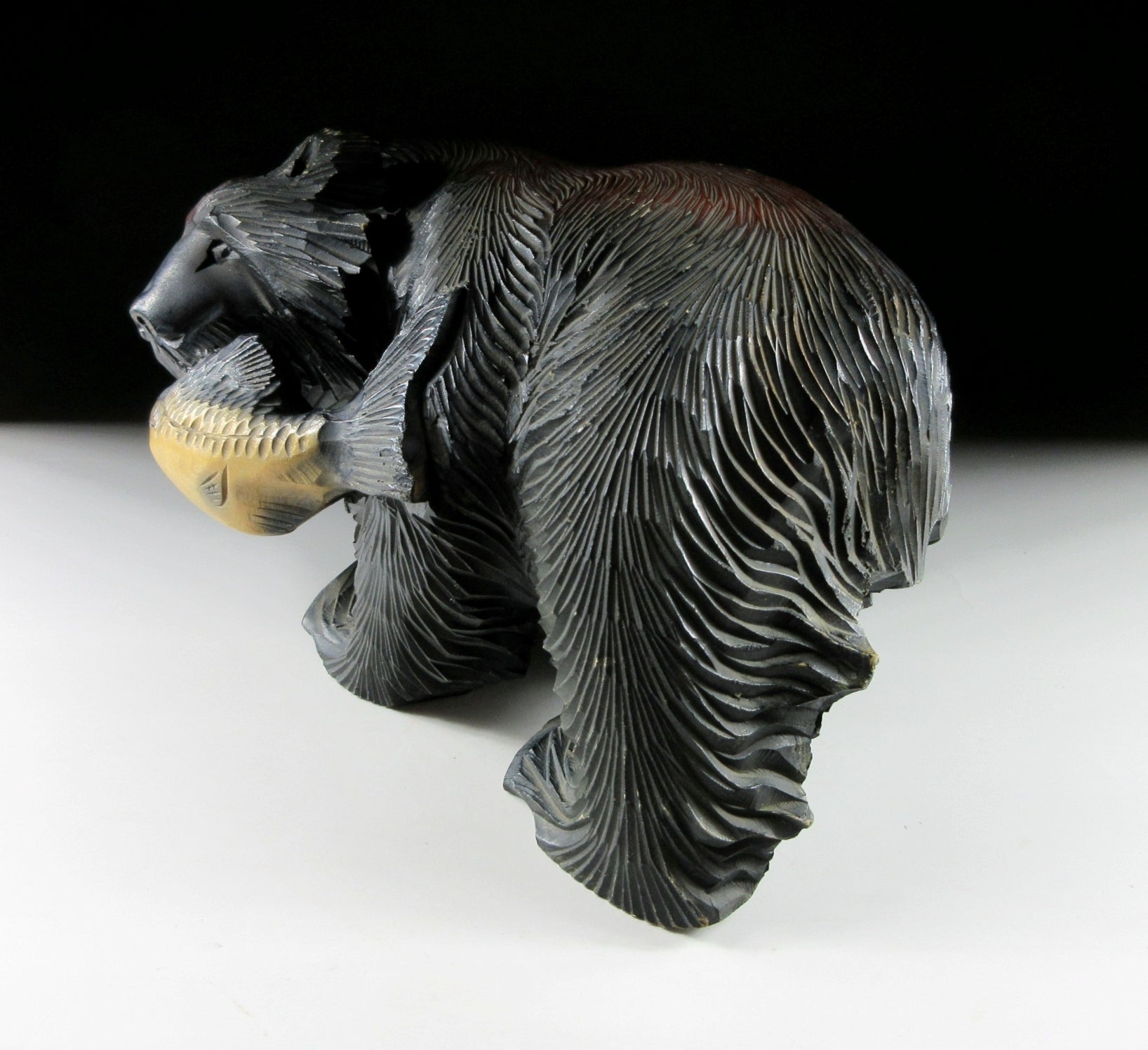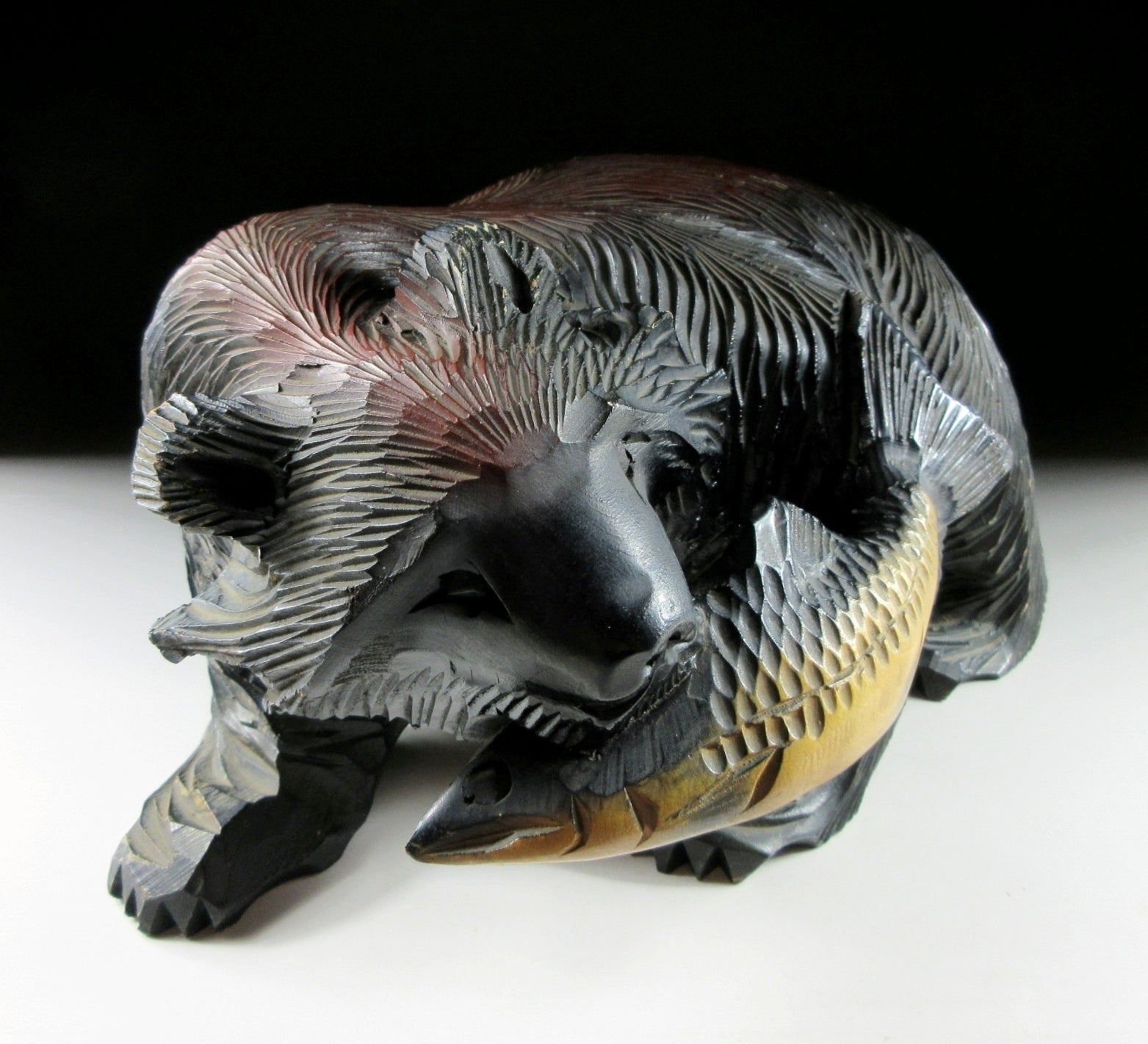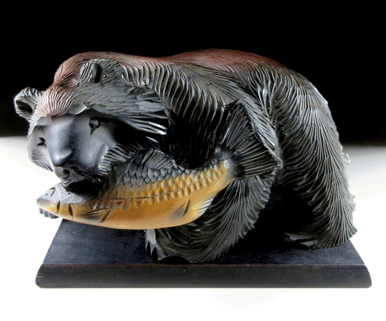 The Ainu people of Japan first started commercial wood carving back in the 1920s. Traditionally their carvings consisted of religious objects, however dire economic circumstances forced them to turn to wood carving for tourists. Their wares, particularly the Higuma bear carvings, became very popular as souvenirs due to their very realistic appearance. The Emperor himself acquired a Higuma bear made by a highly talented carver named Umetaro Matsui in 1938. Following this Matsui won many awards for his work, and gradually these ornate carvings became recognised as beautiful works of art.
