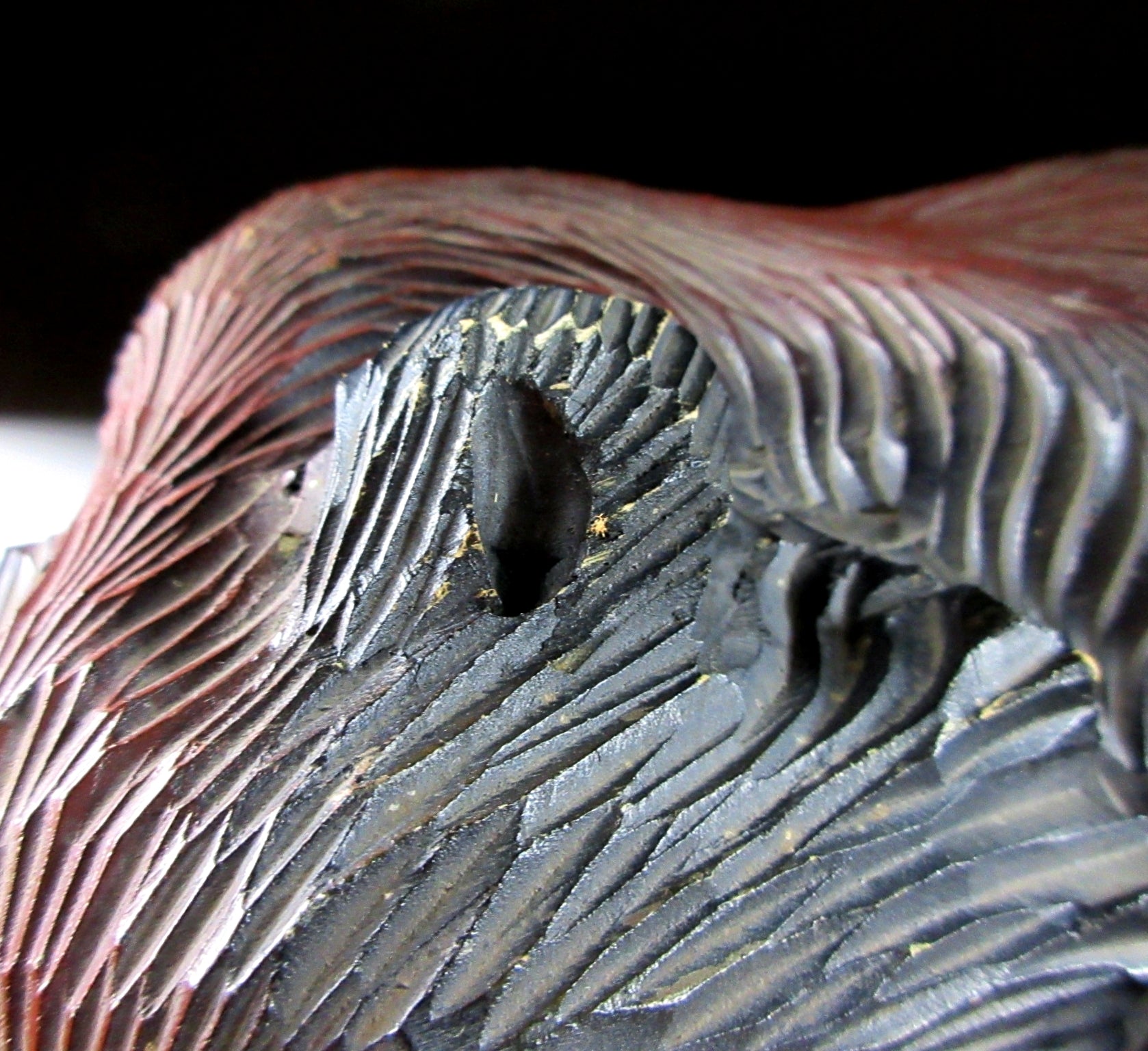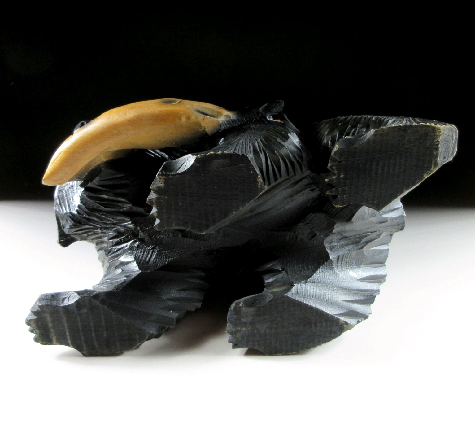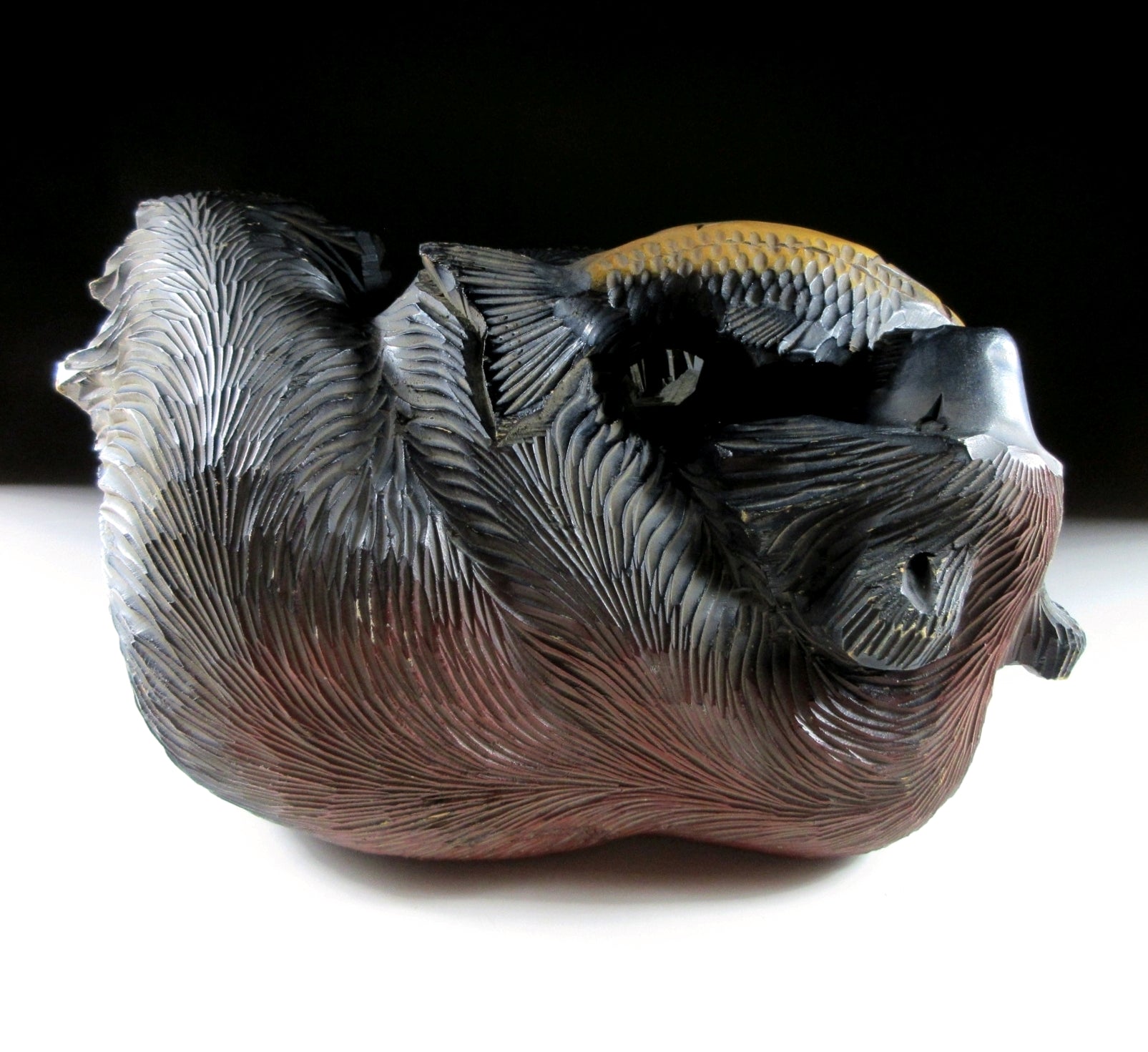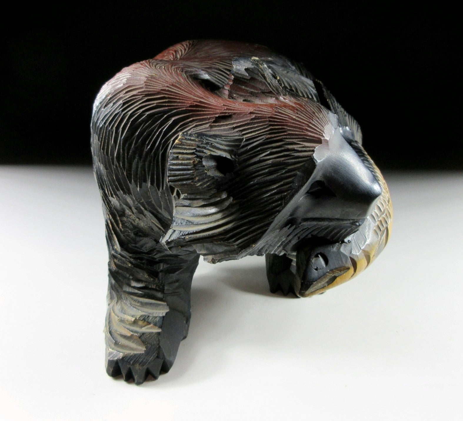 The Ainu people of Japan first started commercial wood carving back in the 1920s. Traditionally their carvings consisted of religious objects, however dire economic circumstances forced them to turn to wood carving for tourists. Their wares, particularly the Higuma bear carvings, became very popular as souvenirs due to their very realistic appearance. The Emperor himself acquired a Higuma bear made by a highly talented carver named Umetaro Matsui in 1938. Following this Matsui won many awards for his work, and gradually these ornate carvings became recognised as beautiful works of art.