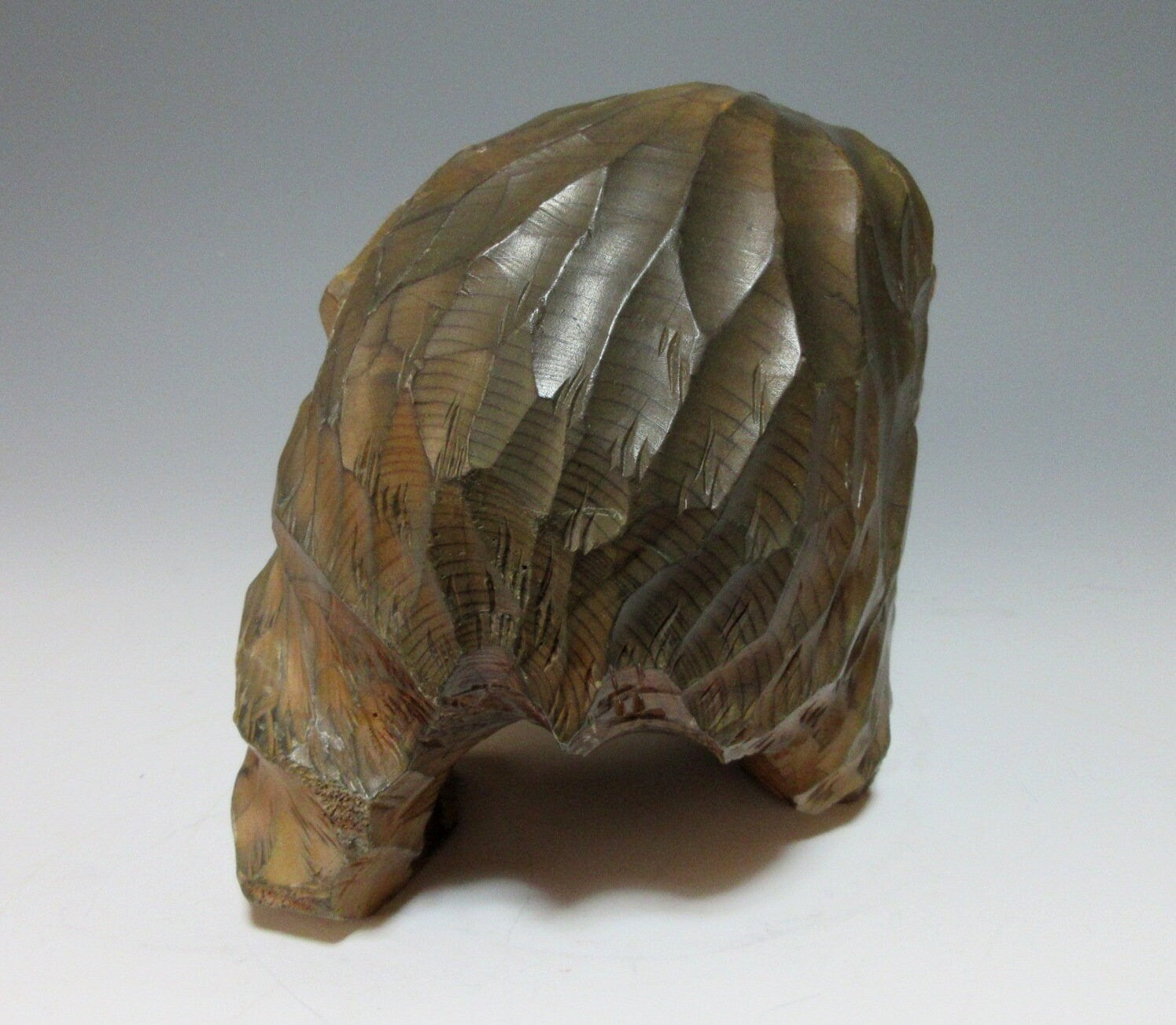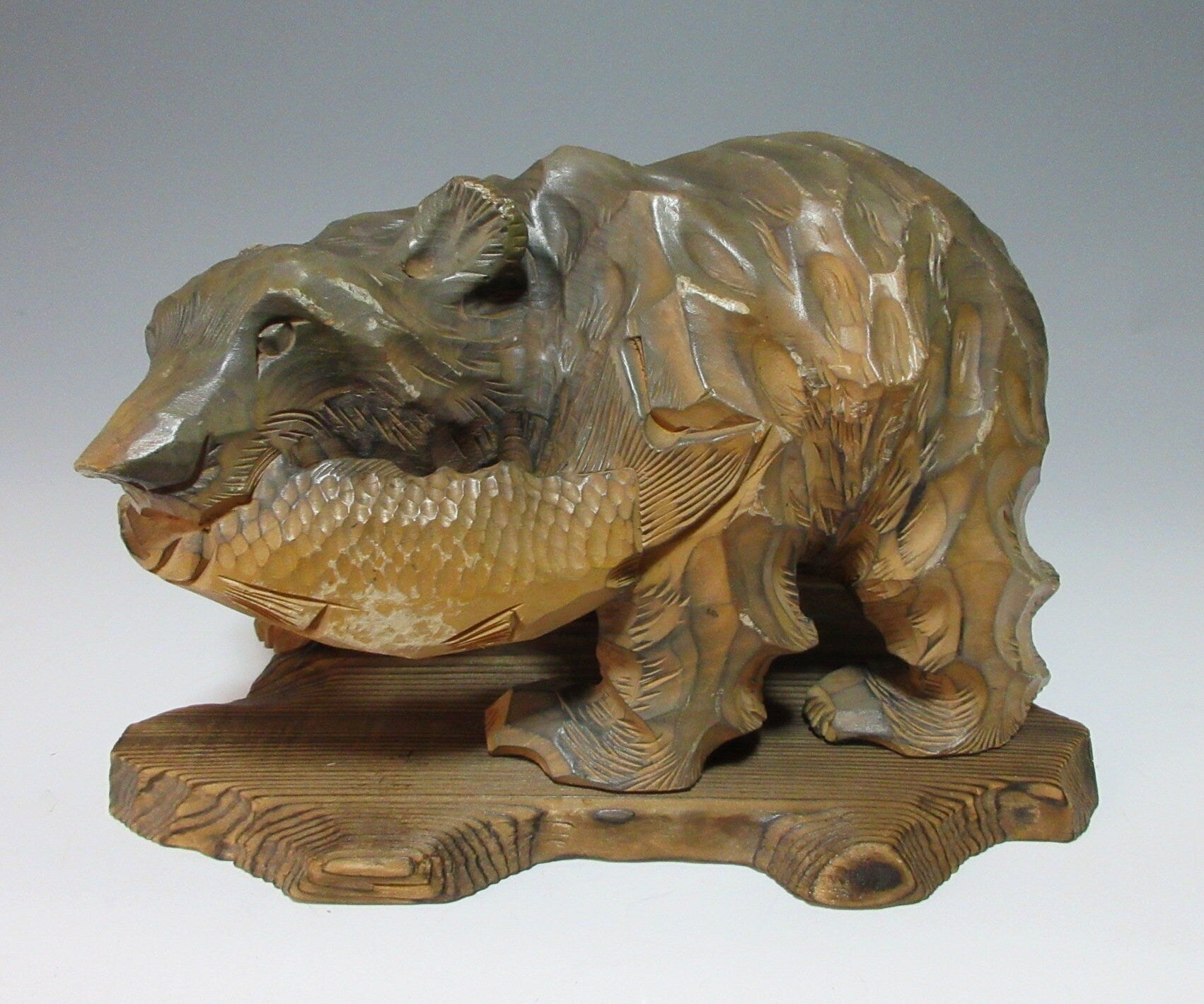 The Ainu people of Japan first started commercial wood carving back in the1920s. Traditionally their carvings consisted of religious objects, however dire economic circumstances forced them to turn to wood carving for tourists. Their wares, particularly the Higuma bear carvings, became very popular as souvenirs due to their very realistic appearance. The Emperor himself acquired a Higuma bear made by a highly talented carver named Umetaro Matsui in 1938. Following this Matsui won many awards for his work, and gradually these ornate carvings became recognized as beautiful works of art.