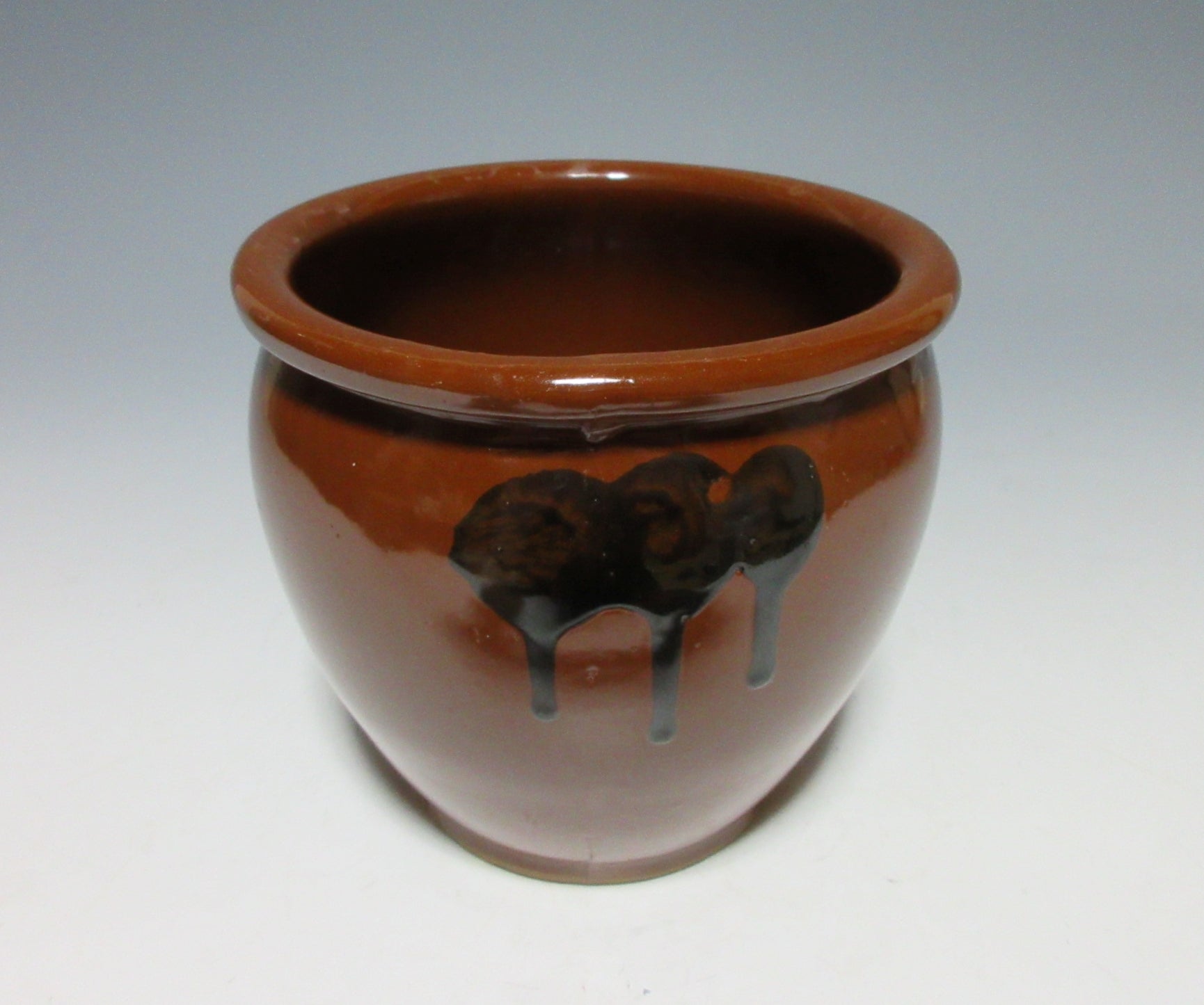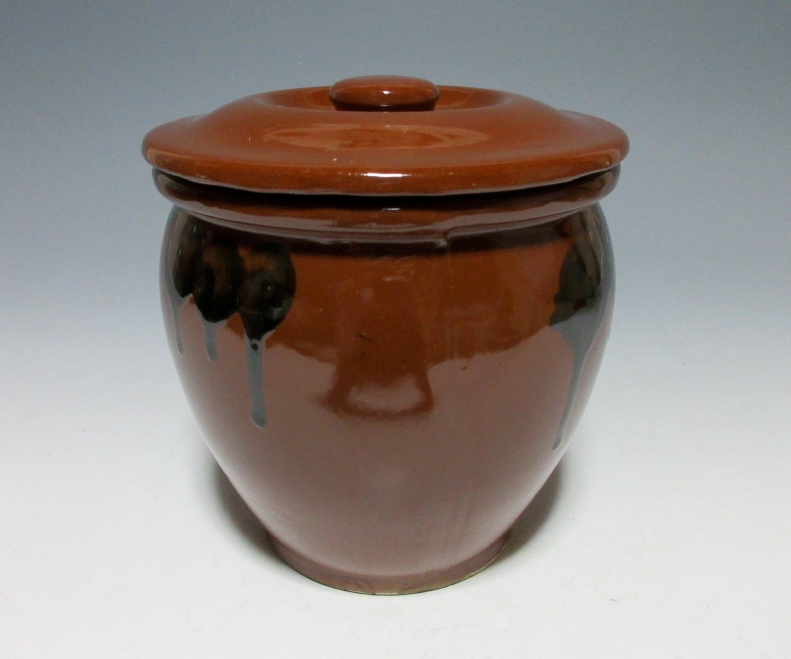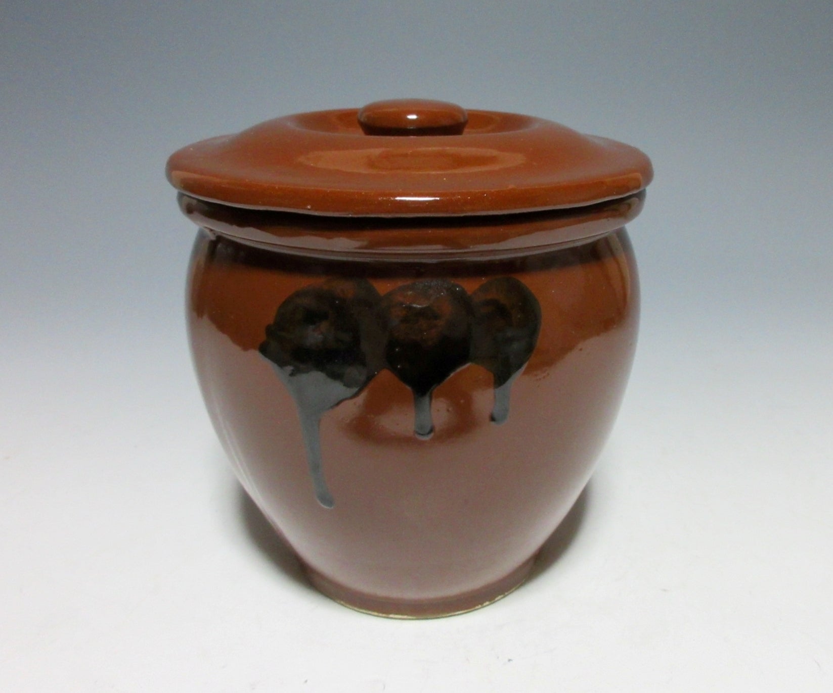 This listing is for a traditional Iwami-ware pickling pot with lid made around 40 years ago. It is quite robust, and glazed with reddish brown ‘kimachi’ enamel. Iwami-ware pickling pots are durable, have low water absorbency and are resistant to salt and acid. This piece primarily functions as a fermentation crock, and is generally used for preserving plums and rice bran pickles.