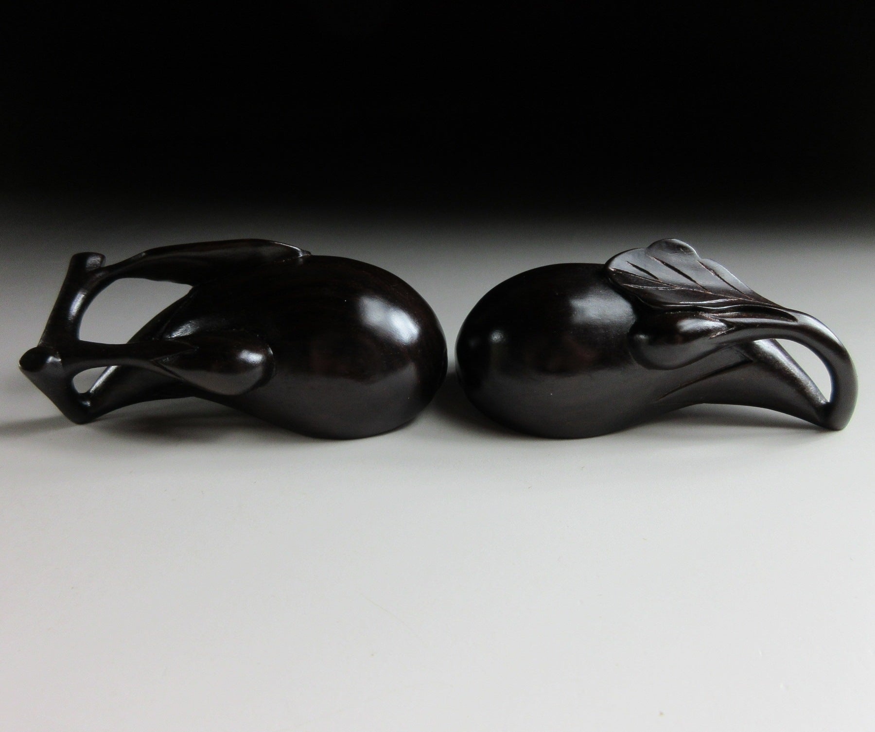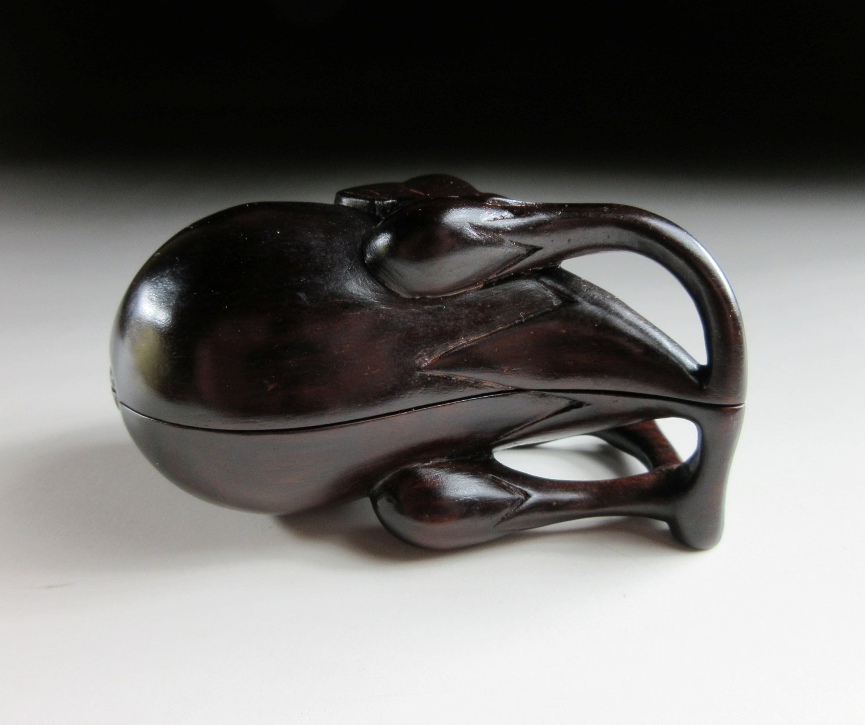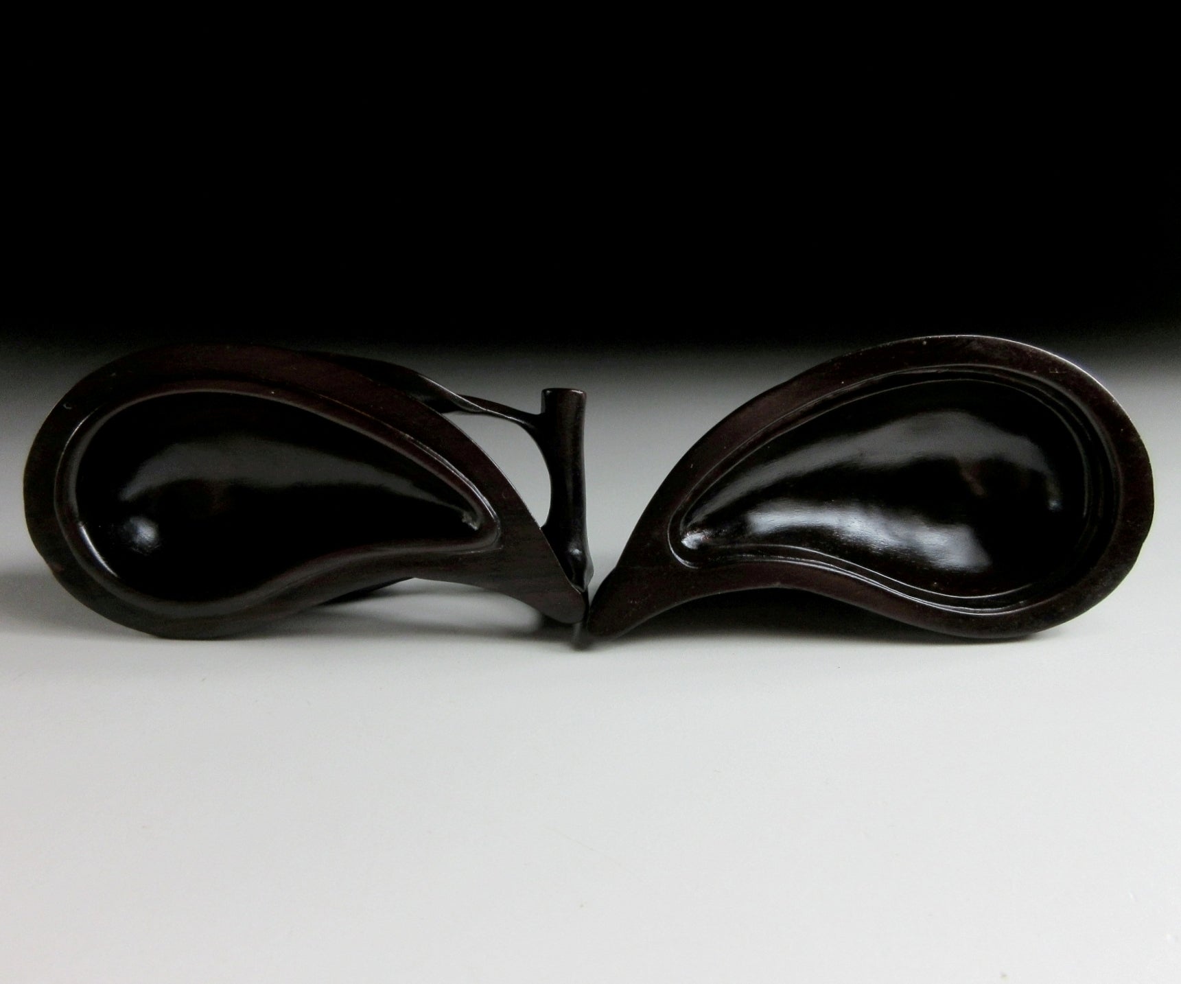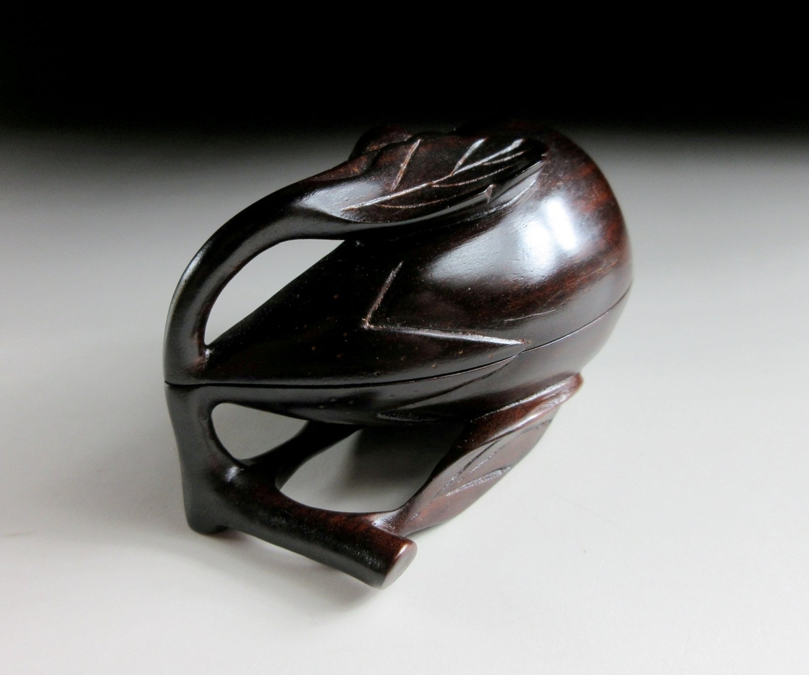 This listing is for a wooden urushi lacquerware kogo made around 20 years ago. It is made of karaki wood and carved to resemble an eggplant, and finished with clear lacquer. Wooden kogo are intended for use during summer and for woodchip incense, however its nice round shape makes it perfect for holding kneaded incense as well. This particular case has a nice open shape on the interior making it roomy enough for the woodchip type.
