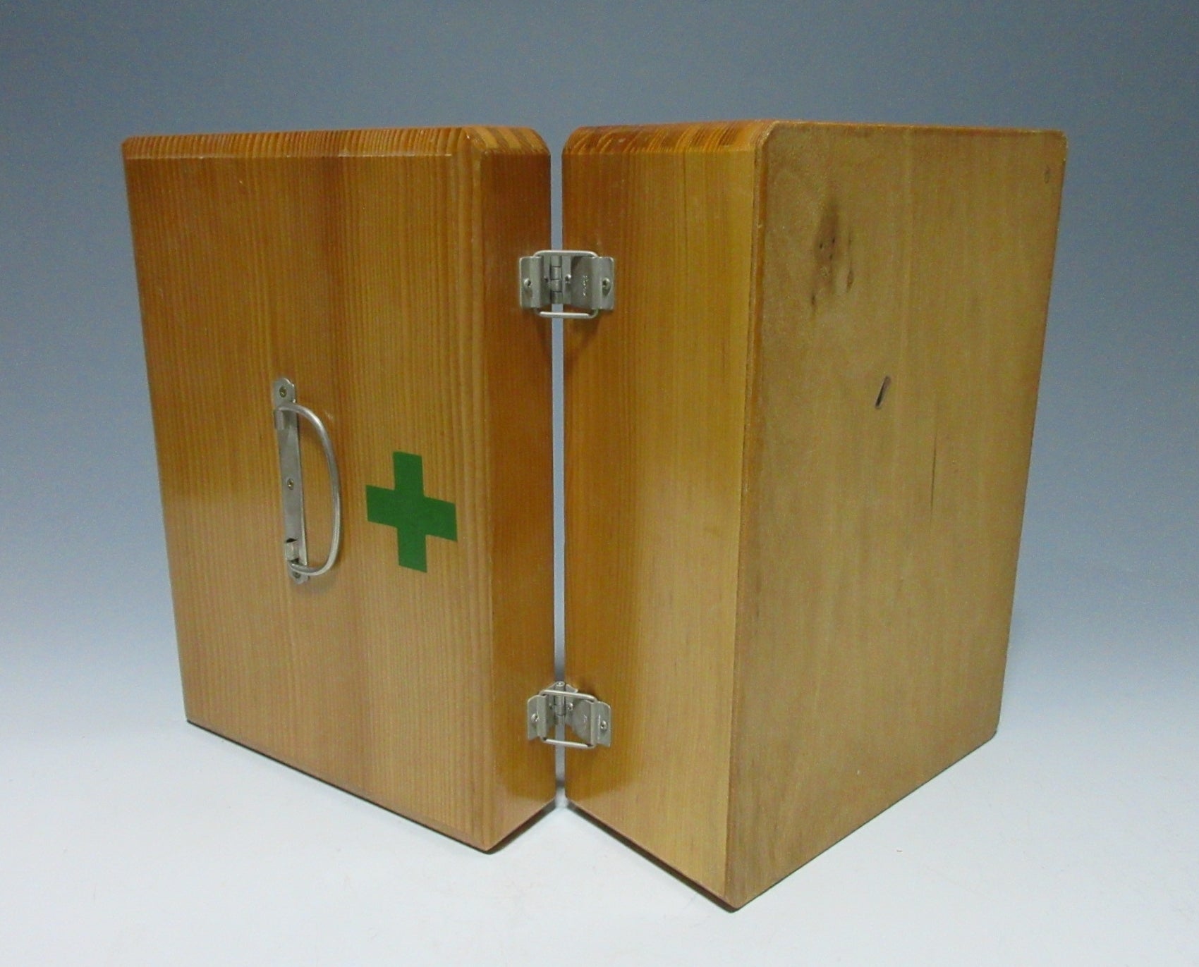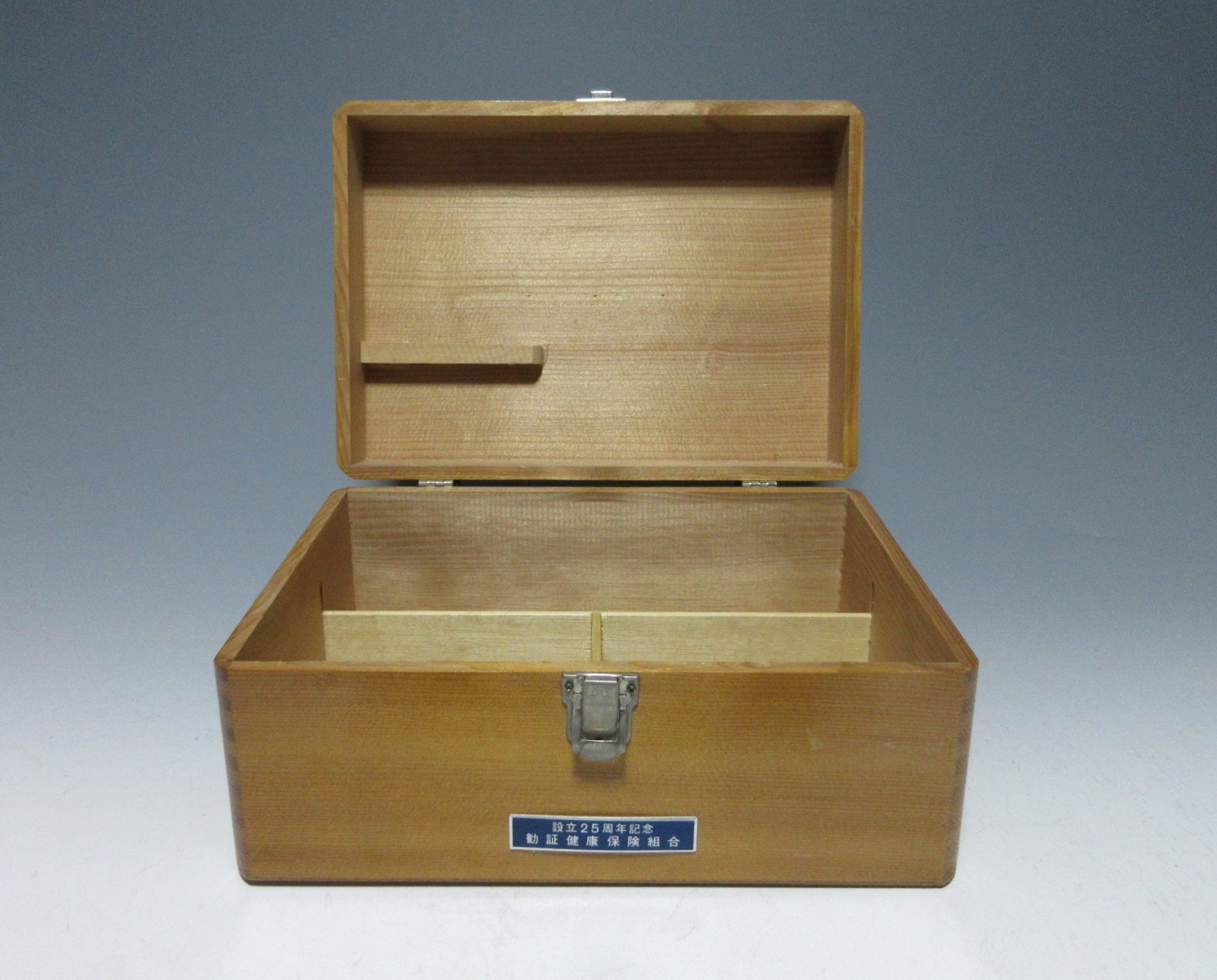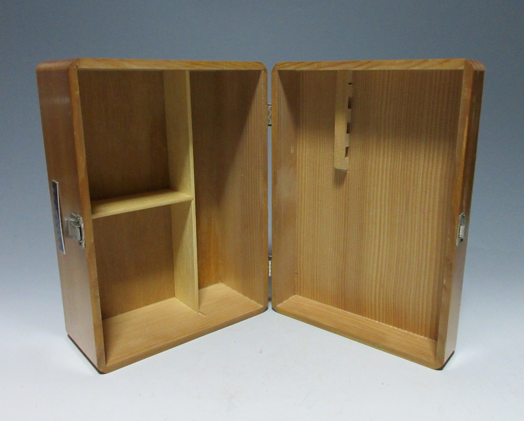This listing is for a wooden kusuribako first aid box from around 40 years ago. The latch closes securely and inside there are partitions for bandages and ointments, and a setting in the lid for tools like scissors and tweezers. Please note that this was once a fully functioning first aid kit so it still carries the smell of ointment.