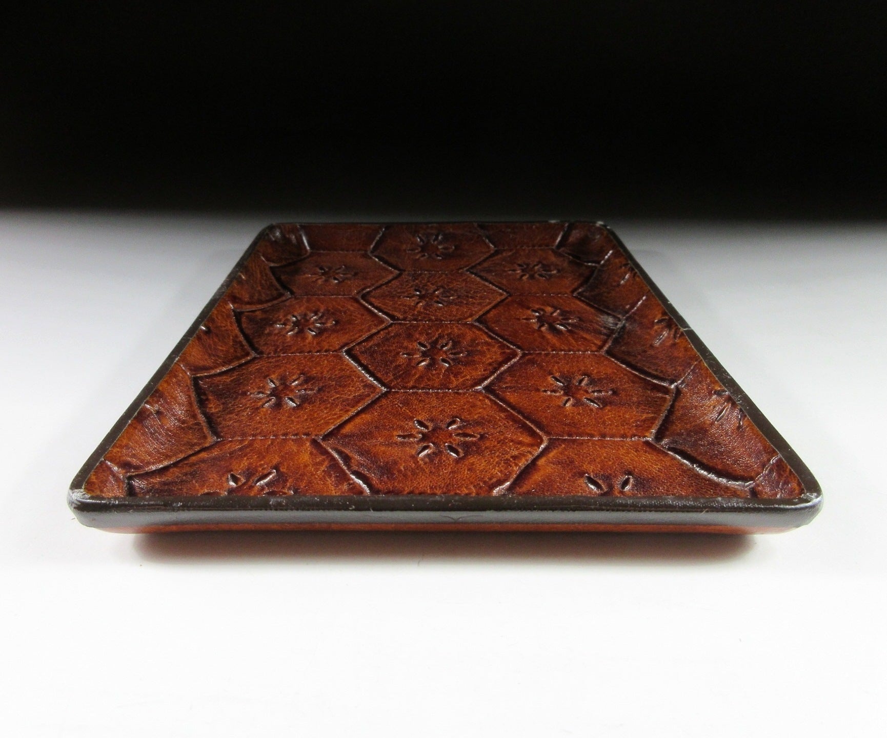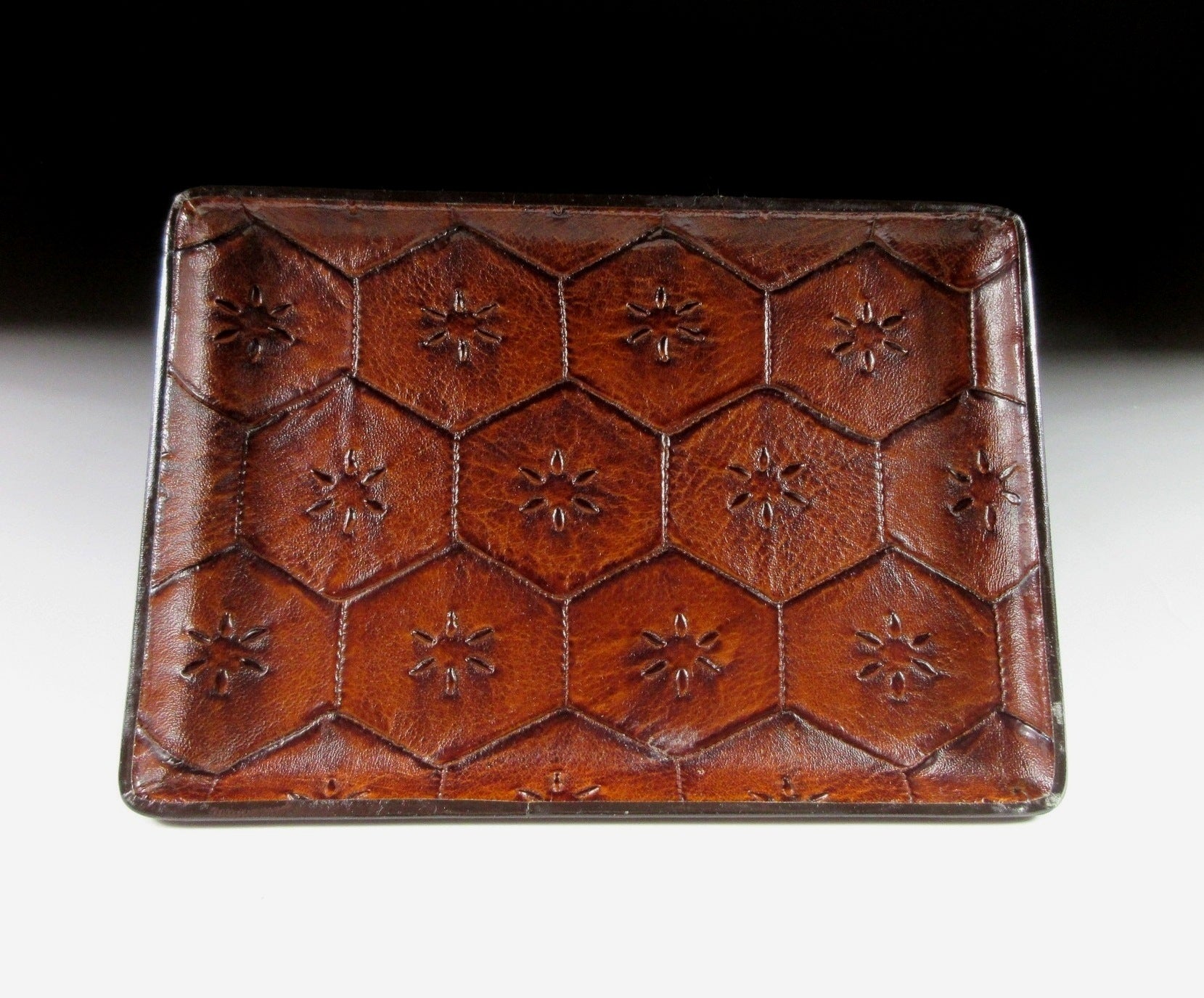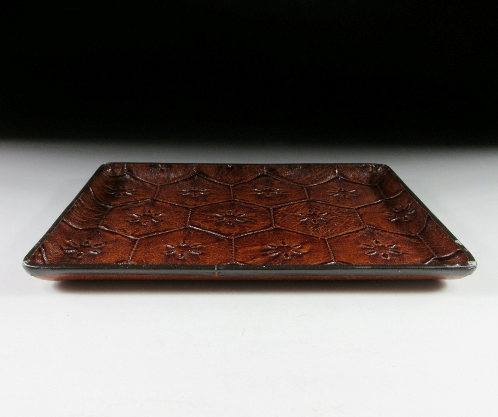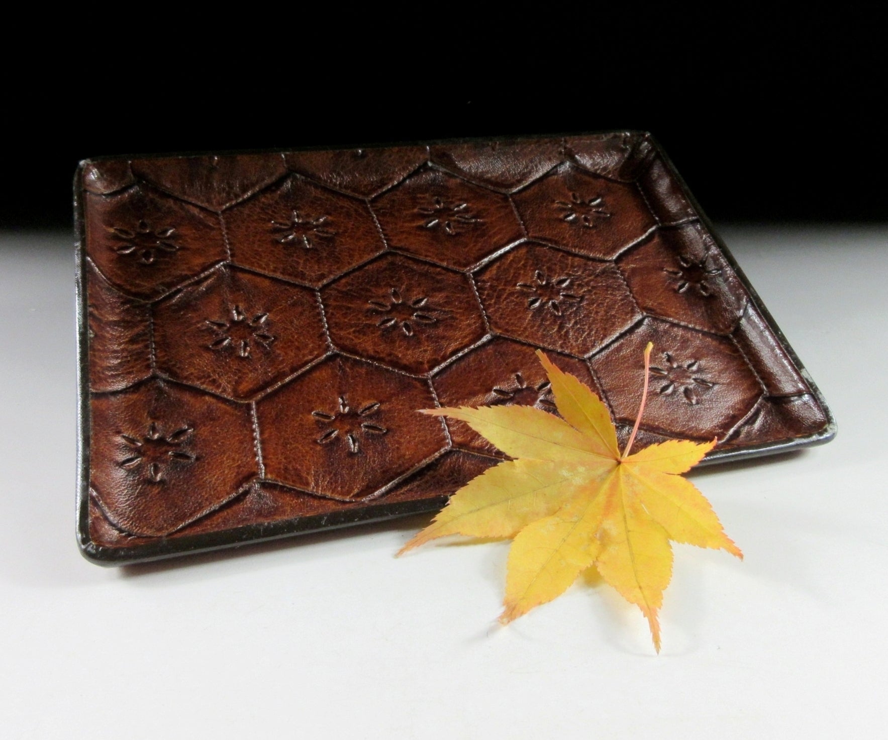 This listing is for a genuine leather cash tray. In Japan cash is never handed over directly when paying for goods. Instead we place our money (or card) in the cash tray on the counter, the cashier will then place our change or return your card there. Trays make it easier for the cashier to collect payment, particularly when there are a lot of coins involved. The cash tray in this listing features a hana kiko flower tortoise pattern, this pattern consists hexagons with a flower motif in the centre. Trays like these are ideal for holding keys or loose change.