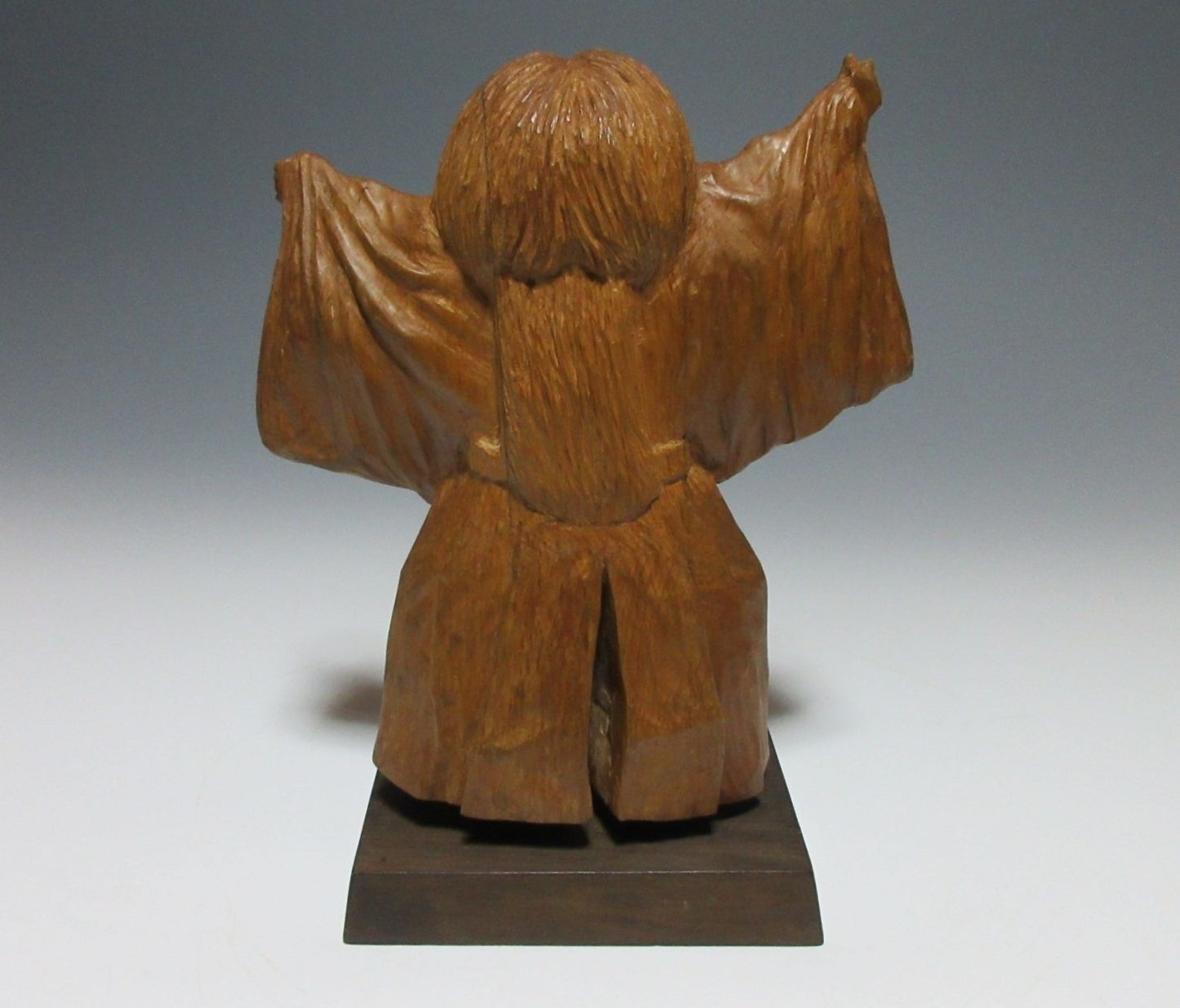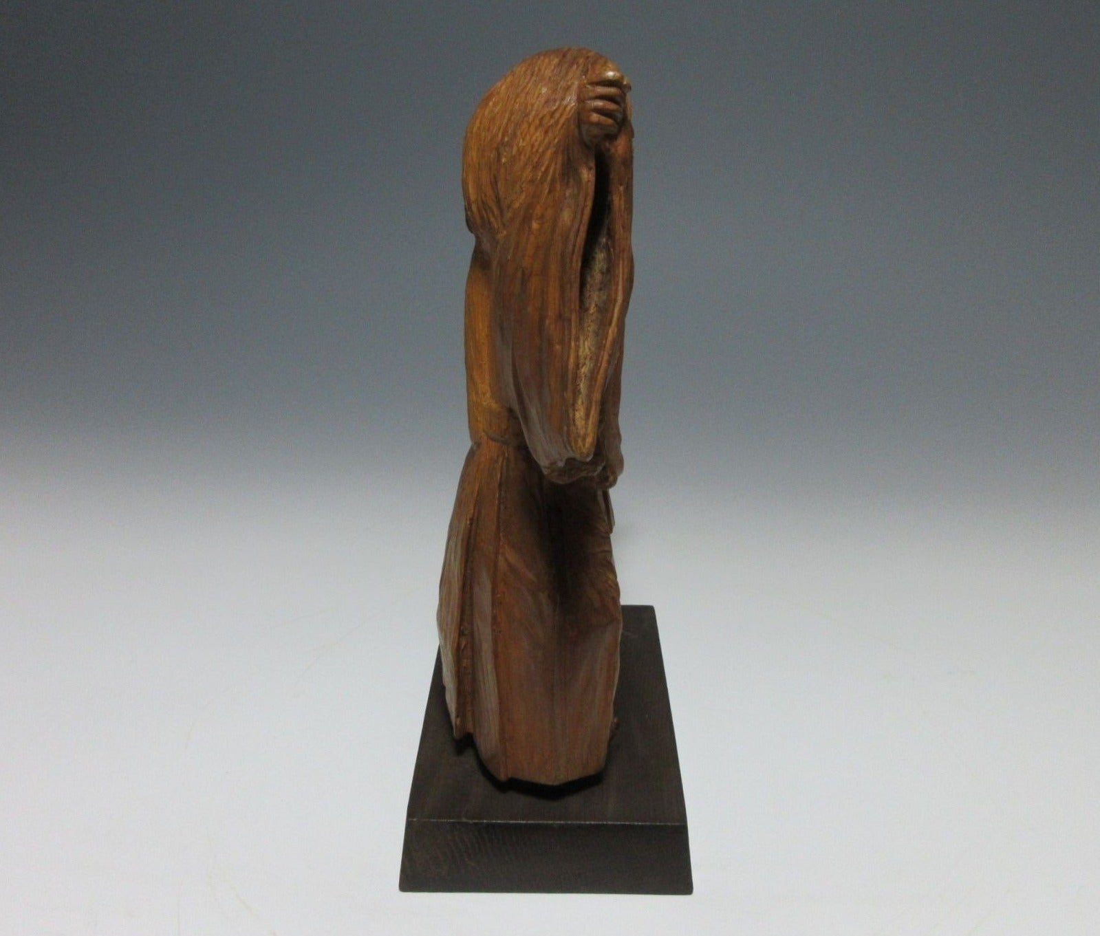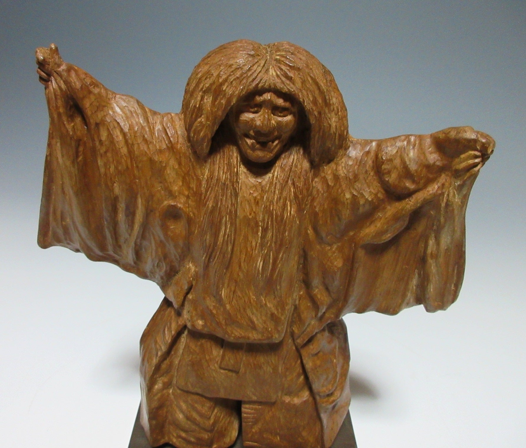 This listing is for a vintage wood carving made around 30-40 years ago. It is hand-carved and depicts the female lead character from the kabuki and noh play titled ‘Momijigari’. In this play a beautiful woman and her attendants are out viewing autumn leaves at Mt. Togakushi in Shinano Province. Taira no Koremochi, a warrior from the Taira clan, sees the group of women having a banquet. Wishing not to disturb them, he dismounts from his horse and quietly leads it past the group. The woman sees him and beckons him to drink sake with her. Koremochi becomes drunk, but the woman forces him to drink more. Her dance becomes more and more furious in tempo, changing from moderate to frantic. After Koremochi falls asleep the woman abandons him, saying never to wake from his dream. A deity from Hachiman Shrine visits Koremochi during his sleep, and reveals to him that the woman is actually an oni (demon), and instructs him to kill the woman using a divine sword. Koremochi seeks out the woman who has now transformed into a fire-breathing oni, and after a pitched battle, he slays her with his sword. During this scene in the play the character of the woman is wearing a wig of brightly coloured crimson hair, and is wearing a shikami mask. A shikami mask is similar to Hannya, the most noticeable difference being no horns. The wood-carving in this listing depicts the woman as the fire-breathing oni, and it is carved from a single black of wood and mounted on a stand.