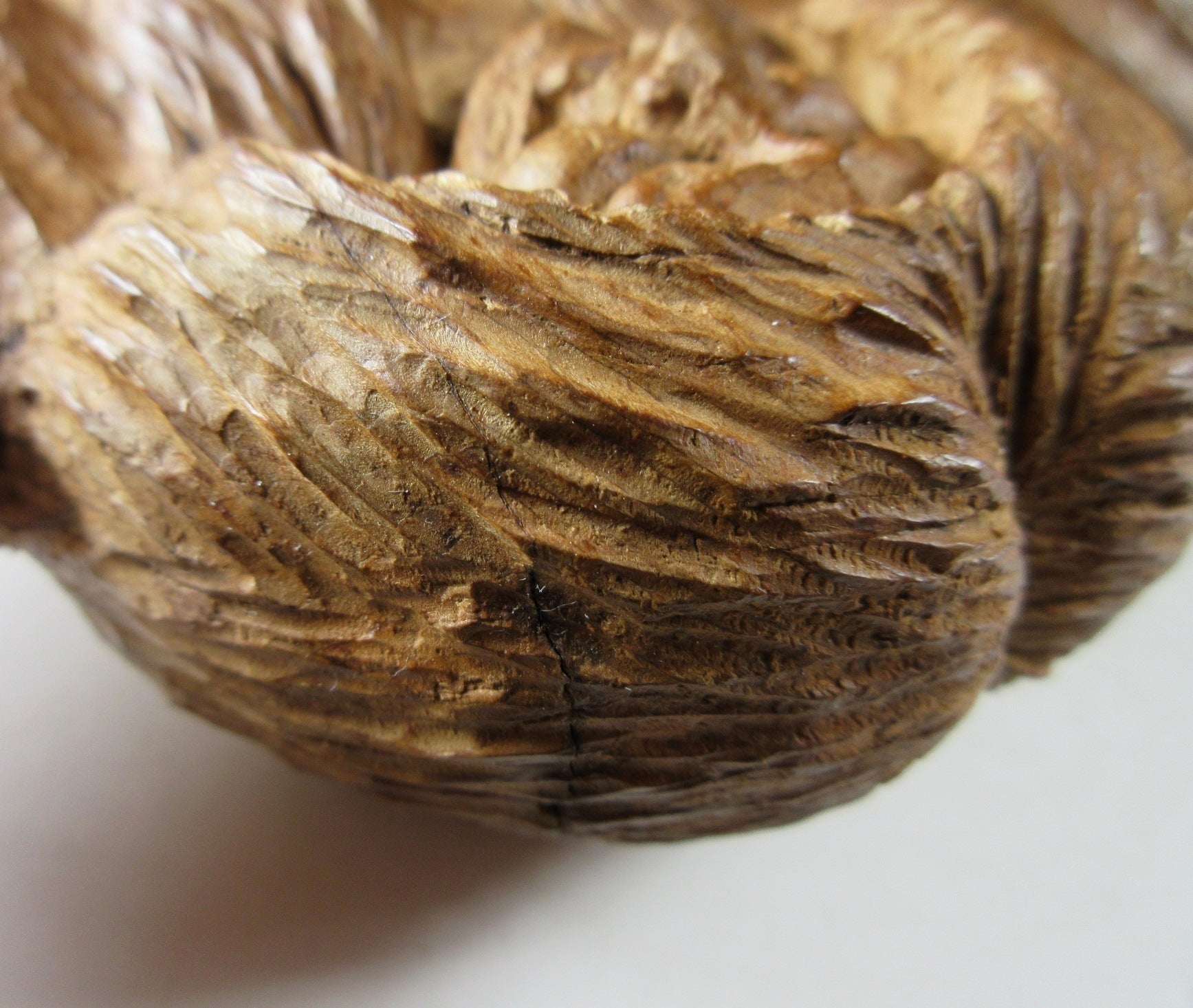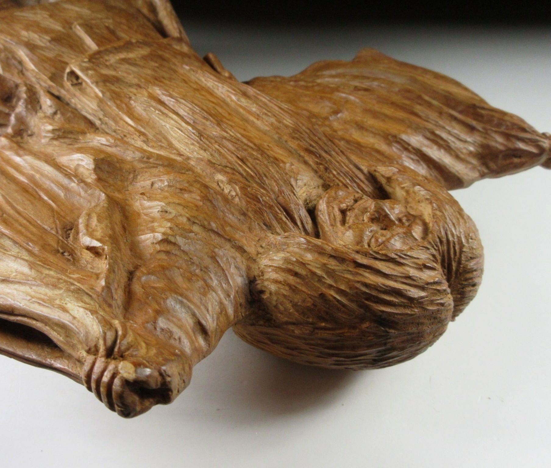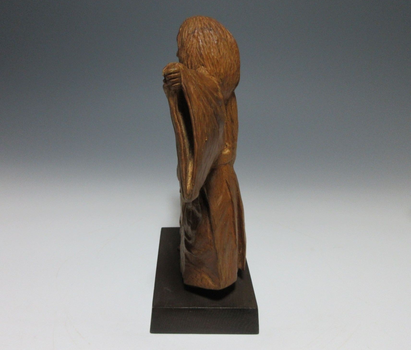 This listing is for a vintage wood carving made around 30-40 years ago. It is hand-carved and depicts the female lead character from the kabuki and noh play titled ‘Momijigari’. In this play a beautiful woman and her attendants are out viewing autumn leaves at Mt. Togakushi in Shinano Province. Taira no Koremochi, a warrior from the Taira clan, sees the group of women having a banquet. Wishing not to disturb them, he dismounts from his horse and quietly leads it past the group. The woman sees him and beckons him to drink sake with her. Koremochi becomes drunk, but the woman forces him to drink more. Her dance becomes more and more furious in tempo, changing from moderate to frantic. After Koremochi falls asleep the woman abandons him, saying never to wake from his dream. A deity from Hachiman Shrine visits Koremochi during his sleep, and reveals to him that the woman is actually an oni (demon), and instructs him to kill the woman using a divine sword. Koremochi seeks out the woman who has now transformed into a fire-breathing oni, and after a pitched battle, he slays her with his sword. During this scene in the play the character of the woman is wearing a wig of brightly coloured crimson hair, and is wearing a shikami mask. A shikami mask is similar to Hannya, the most noticeable difference being no horns. The wood-carving in this listing depicts the woman as the fire-breathing oni, and it is carved from a single black of wood and mounted on a stand.