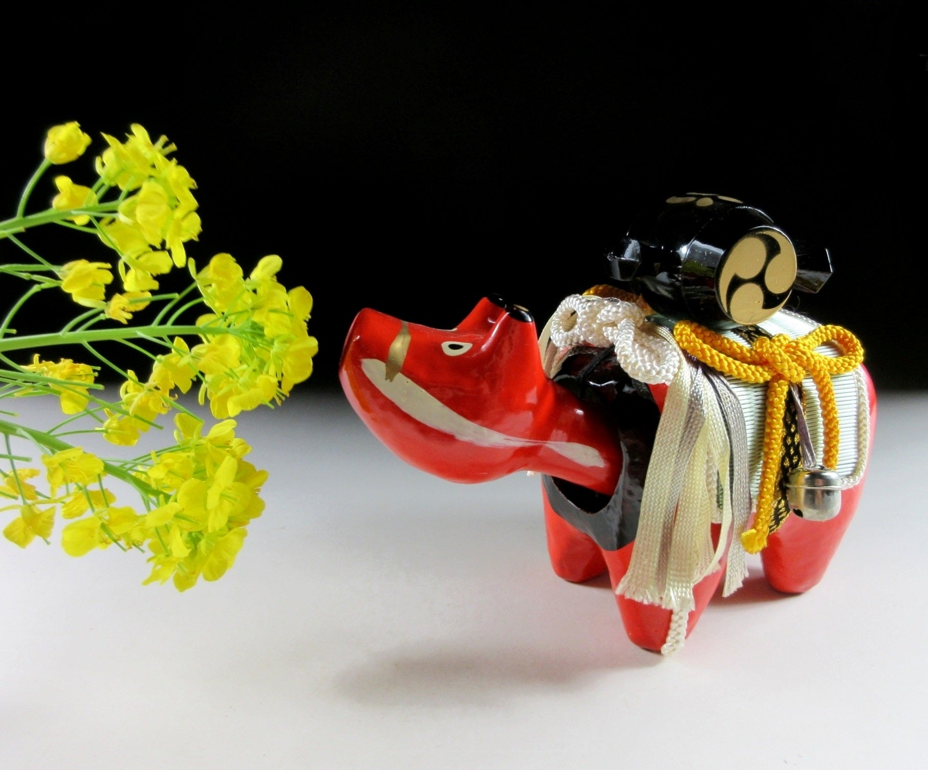 This listing is for a vintage Akabeko made around 10 years ago. An akabeko is a toy made from papier-mâché that’s shaped and painted to look like a red oxen. The body is hollow and the head bobs up and down when moved. Akabeko originated in the Aizu region of Fukushima, and is probably one of the most recognisable folk crafts from all of Tohoku. The red colour is believed to be lucky and auspicious for warding off smallpox and other childhood illnesses. The akabeko in this listing has tatami and a lucky mallet on its back.