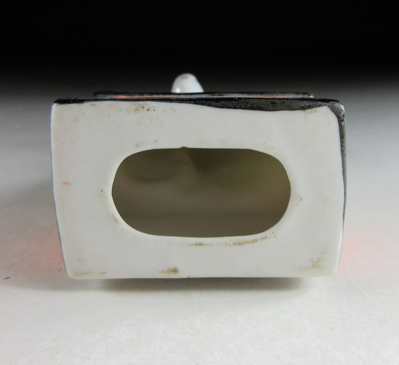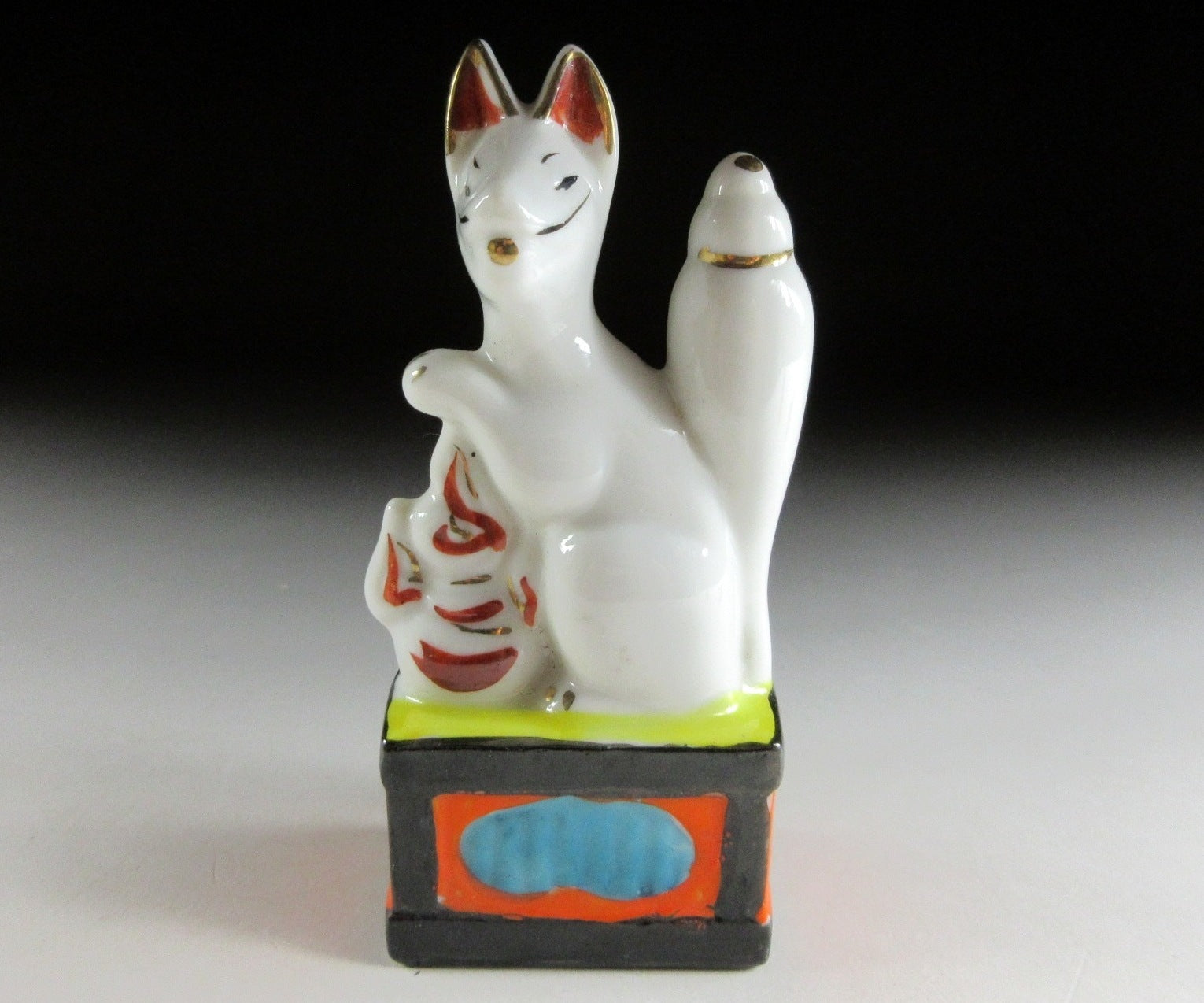 This listing is for a vintage porcelain ware kitsune figurine made about 20-30 years ago. Kitsune are scared foxes with supernatural powers. They act as messengers for Inari and possess the ability to shape-shift and trick people. The fox in this listing is the type commonly found at shrines flanking small torii, or safeguarding the family altar. In rural areas they can be found high on the wall sitting on a shrine shelf, particularly in older houses.