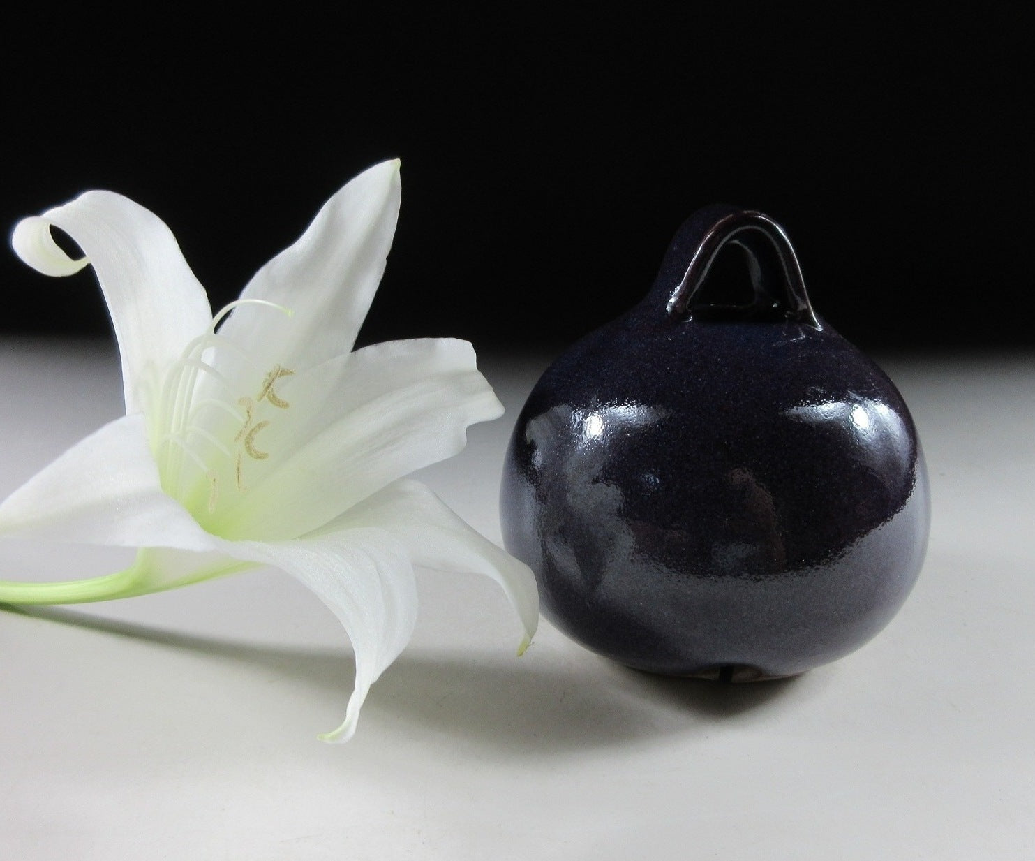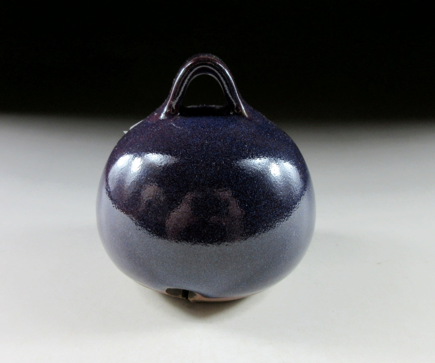 This listing is for a pottery bell made around 10 years ago. It is made of high-fired stoneware and coated in blue/blue-purple glaze. There’s a small loop on top for attached string or a ribbon, and it makes a pleasant sound as the small clay ball rolls around inside. The signature of the potter can be found on the bottom and reads as ‘Omushi’.