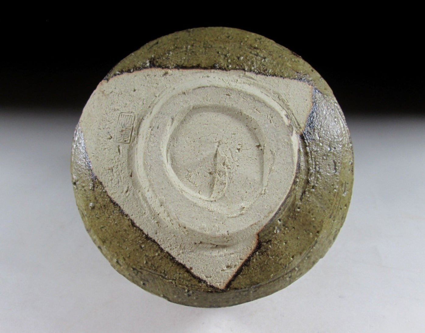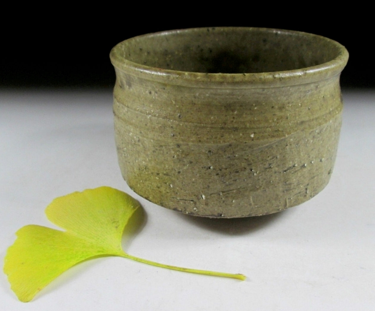 This listing is for a Seto-ware chawan made around 20-30 years ago. It is wheel-thrown using light coloured stoneware clay, and coated in semi-transparent khaki coloured glaze. The lower part of the bowl is faceted, and the bowl slopes inwards just below the rim which gives the piece a slightly curving lip. The signature of the potter can be found on the bottom, and it comes with its original paper box.