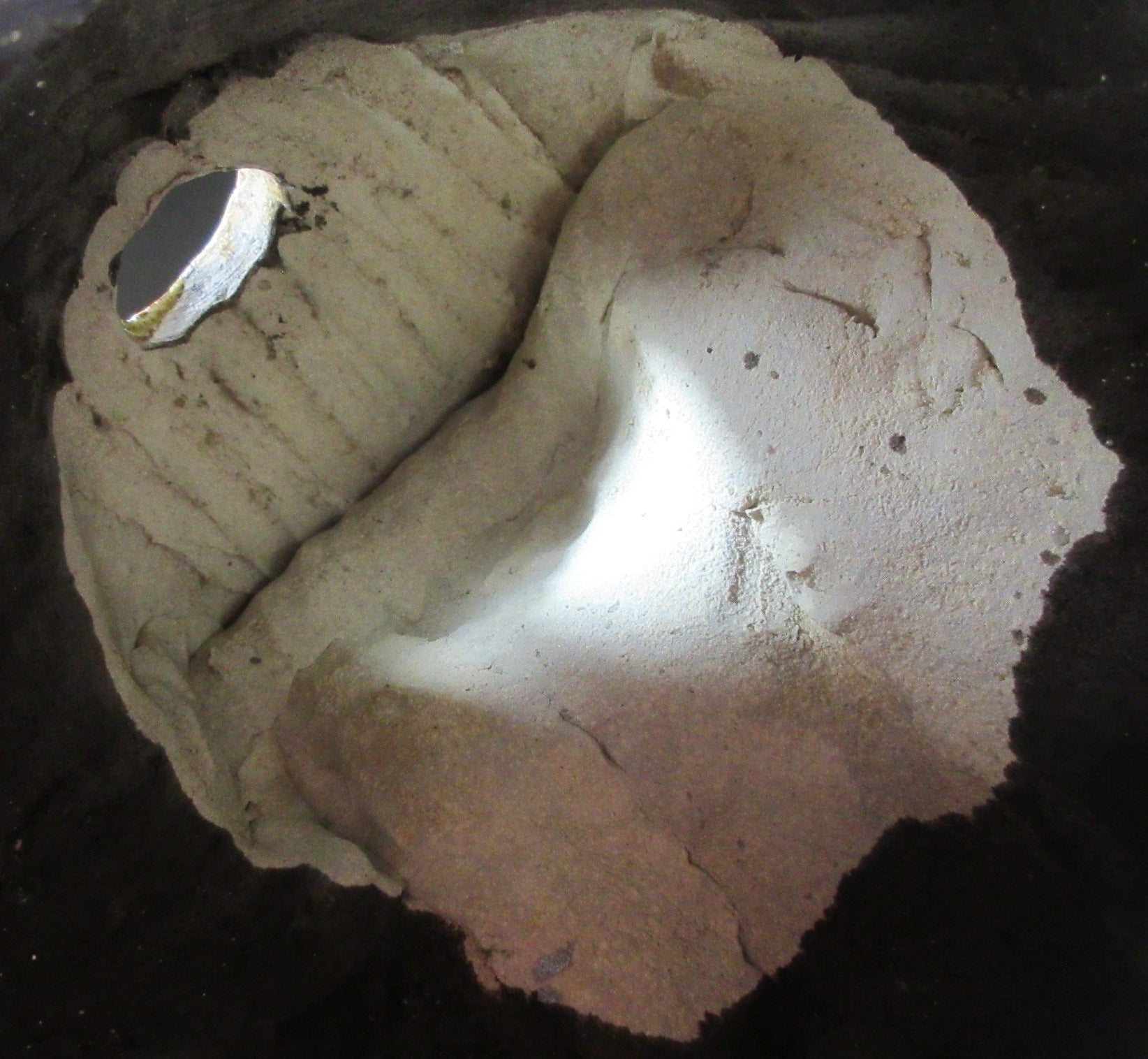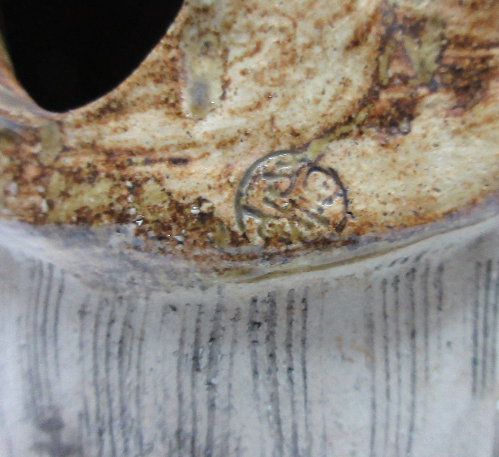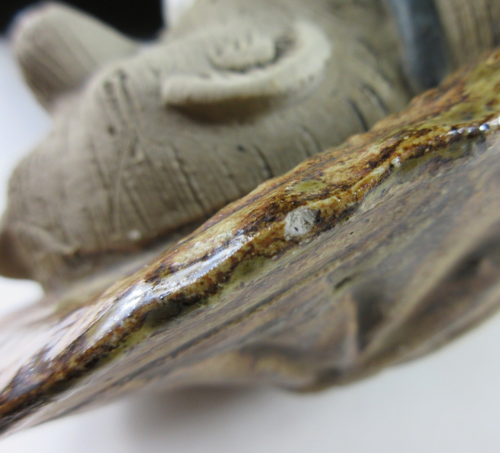 This listing is for a large and rather portly Shigaraki tanuki okimono made about 40-50 years ago. He is wearing a large brown ‘straw hat’ and appears to be grooving to some music. Usually tanuki hold a sake bottle in their right hand and a promissory note in their left hand, but this chap is empty handed and in full party mode. Traditionally tanuki were portrayed as sleek creatures much like kitsune, however these rotund types can be traced back to the latter part of the Edo Period. The straw hat is a relatively new addition making its appearance sometime around the beginning of the 1900s. The stamp of the kiln/potter can be found on the brim of his hat.