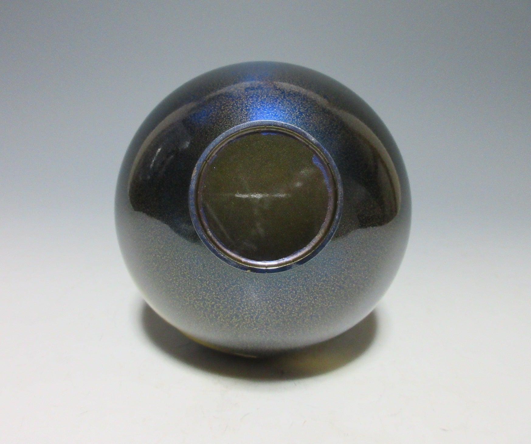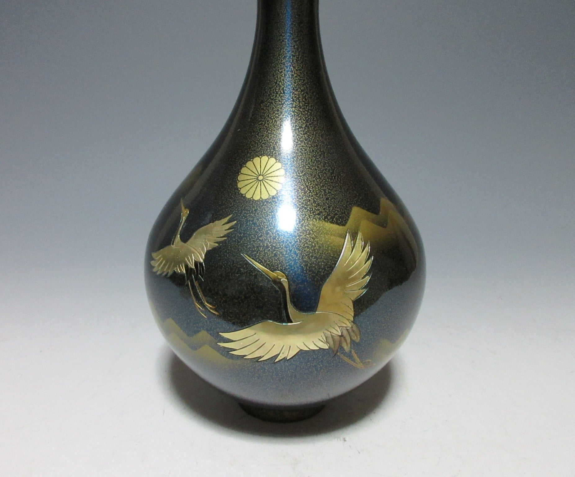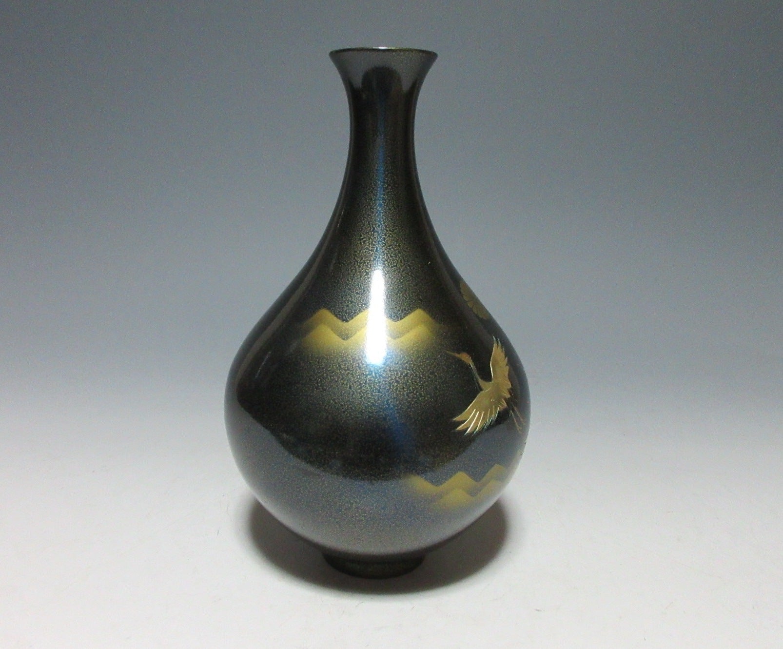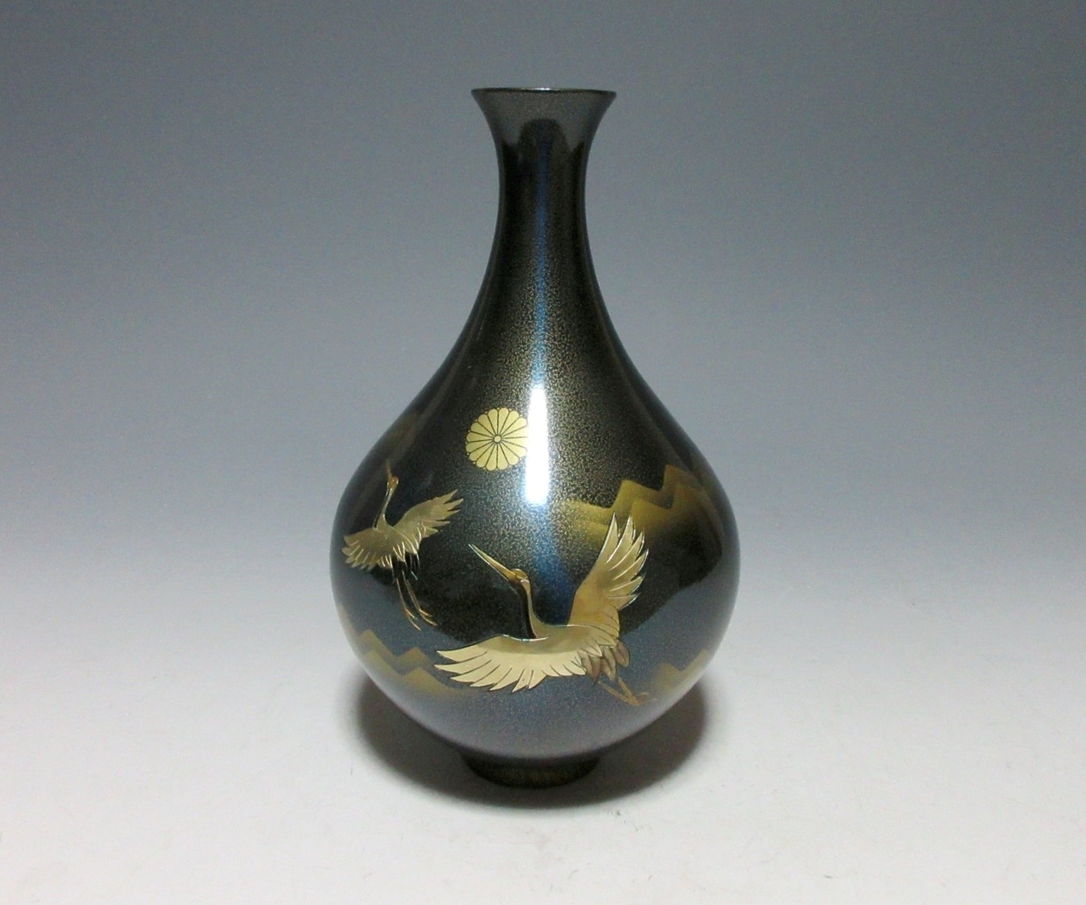 This listing is for an elegant Takaoka copper vase made around 20-30 years ago. It was made using the lost wax process and features a mottled blue-grey-light gold patina. It has a nice bulbous shape, and the front is decorated with the Japanese Imperial Chrysanthemum and two majestic cranes. The opening is wide enough to accommodate a few thin stemmed flowers, very sorry but no box for this one.