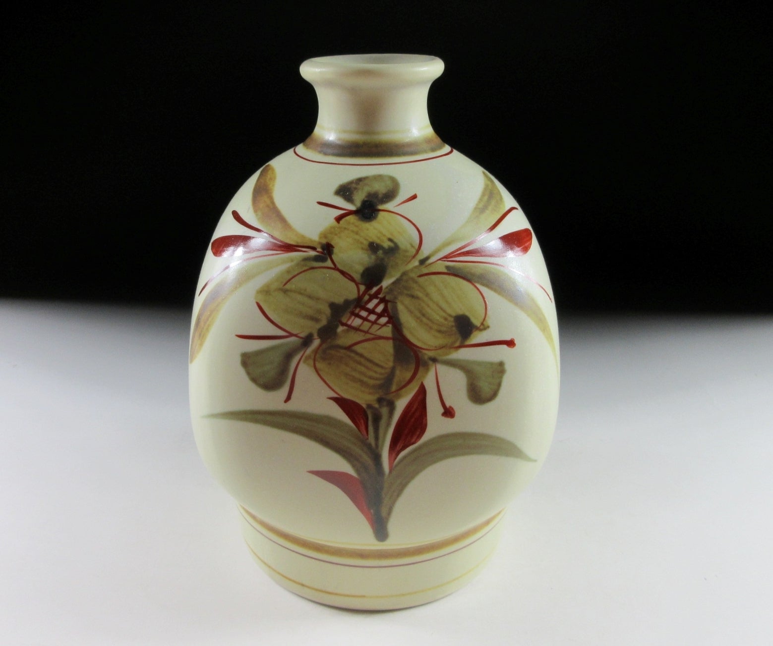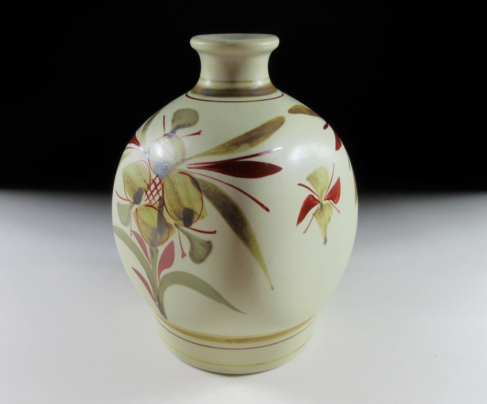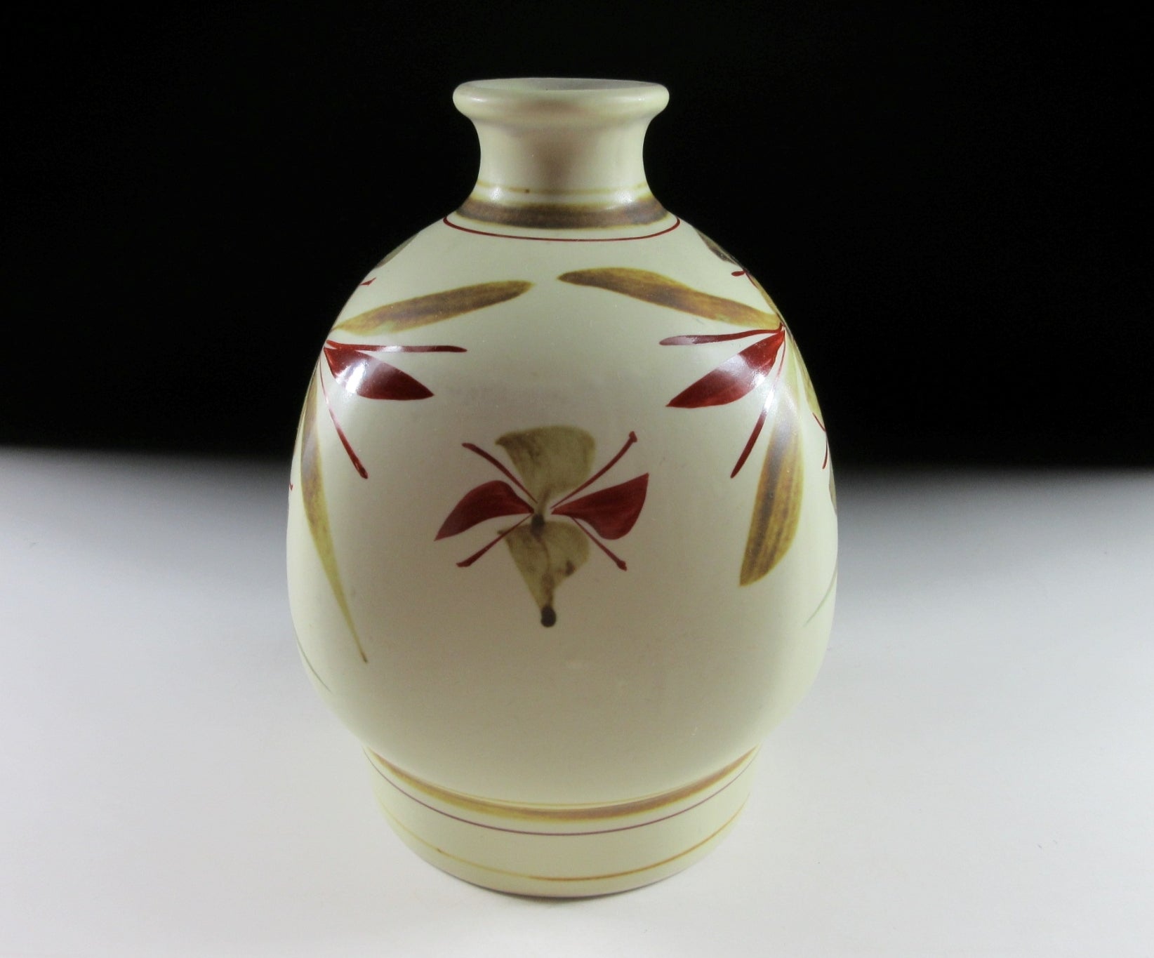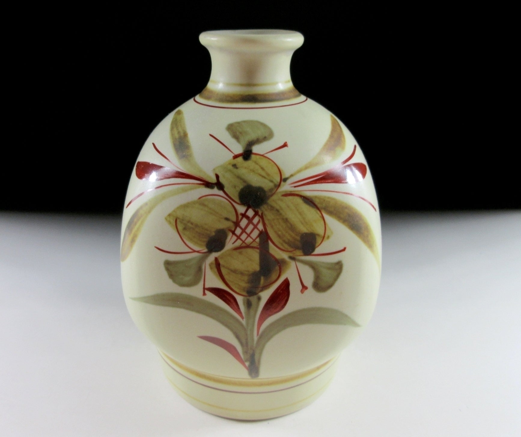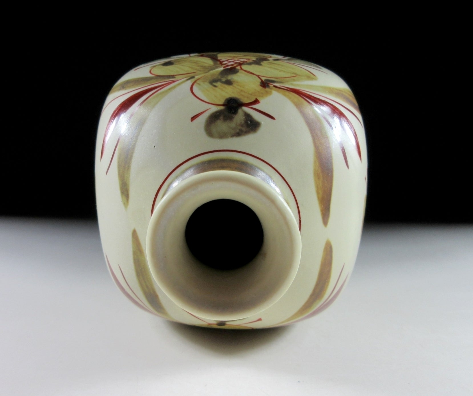 This listing is for a Tobe-ware vase produced as a commemorative gift to celebrate the 50th anniversary of Iseki & Co. Iseki refers to an agricultural machinery company founded in 1926 in Ehime, Shikoku. The vases were not sold, they were distributed as gifts. The one in this listing is made of high-fired slip and coated in off white/cream glaze with a paste-resist design. The opening is wide enough to accommodate a few thin stemmed flowers, and the mark of the kiln can be found on the bottom.