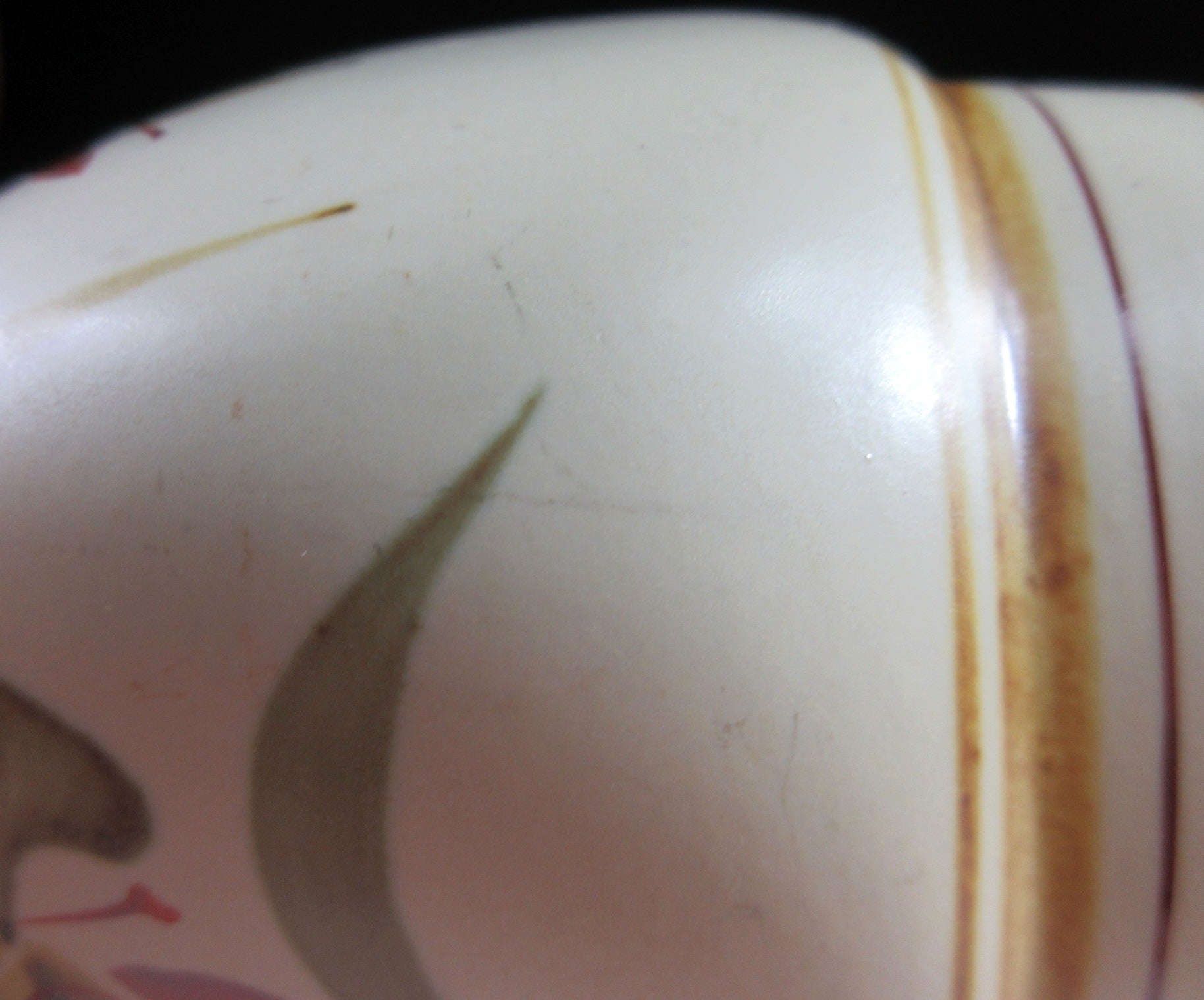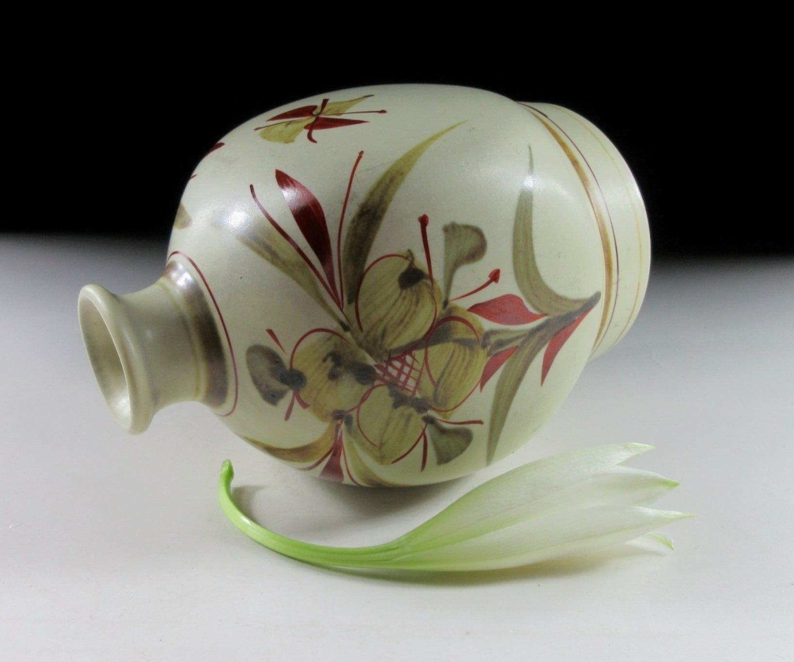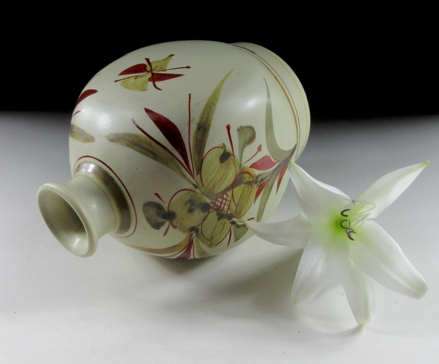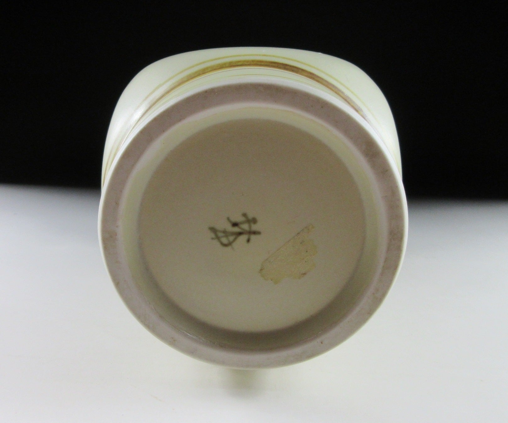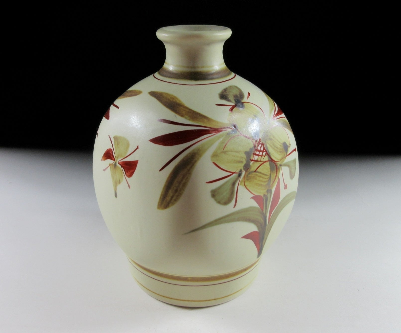 This listing is for a Tobe-ware vase produced as a commemorative gift to celebrate the 50th anniversary of Iseki & Co. Iseki refers to an agricultural machinery company founded in 1926 in Ehime, Shikoku. The vases were not sold, they were distributed as gifts. The one in this listing is made of high-fired slip and coated in off white/cream glaze with a paste-resist design. The opening is wide enough to accommodate a few thin stemmed flowers, and the mark of the kiln can be found on the bottom.