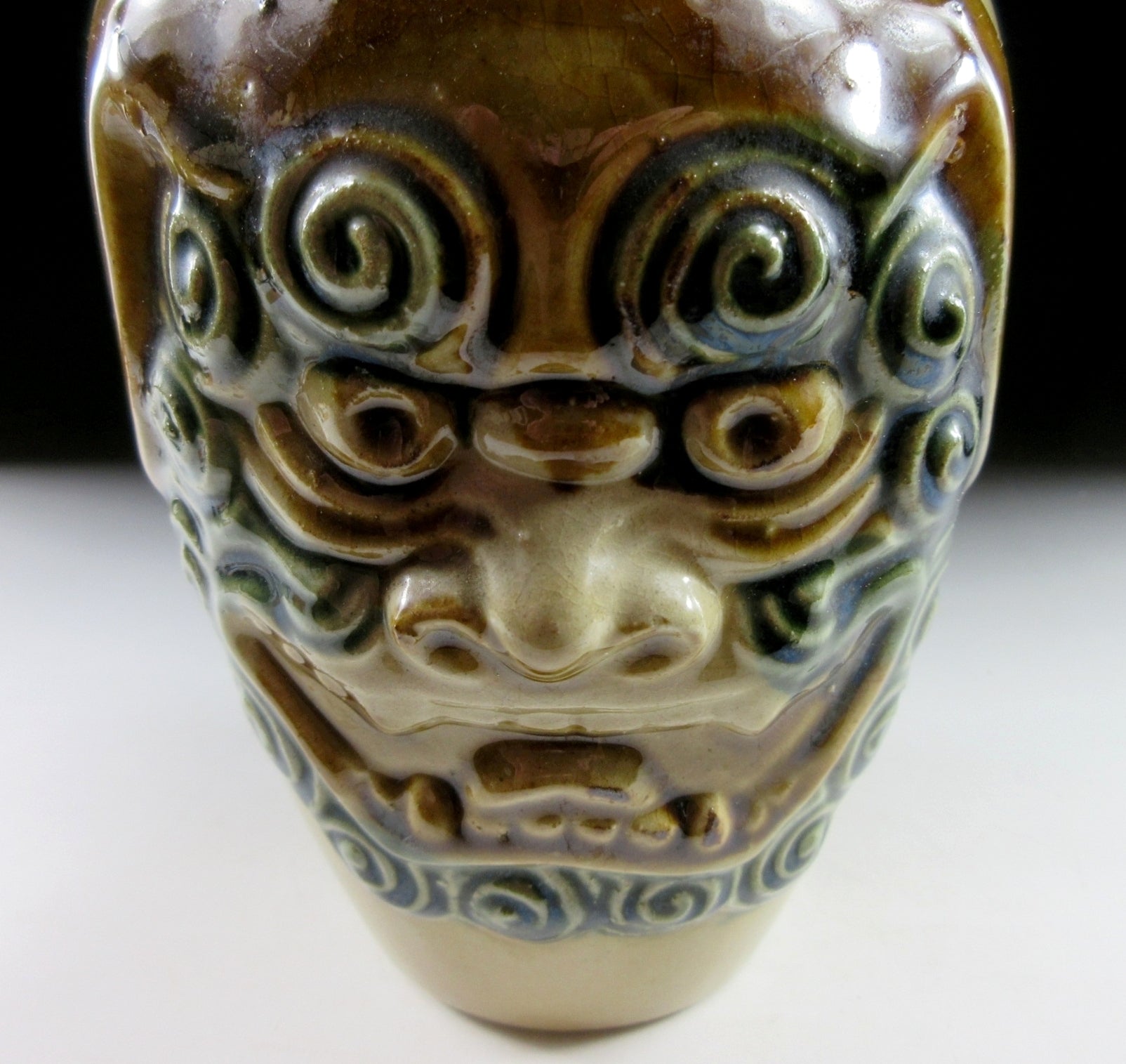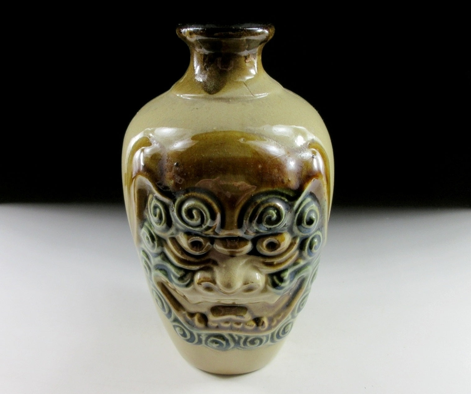 This listing is for a Tsuboya-ware bottle made around 30-40 years ago. It is made from a press mould and the front is decorated with a raised depiction of a shisa, and the back features either a shisa or a dragon, it’s hard to tell which. This piece was most likely an awamori bottle with a cork, however both the alcohol content and cork are long gone.