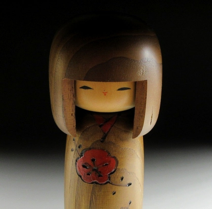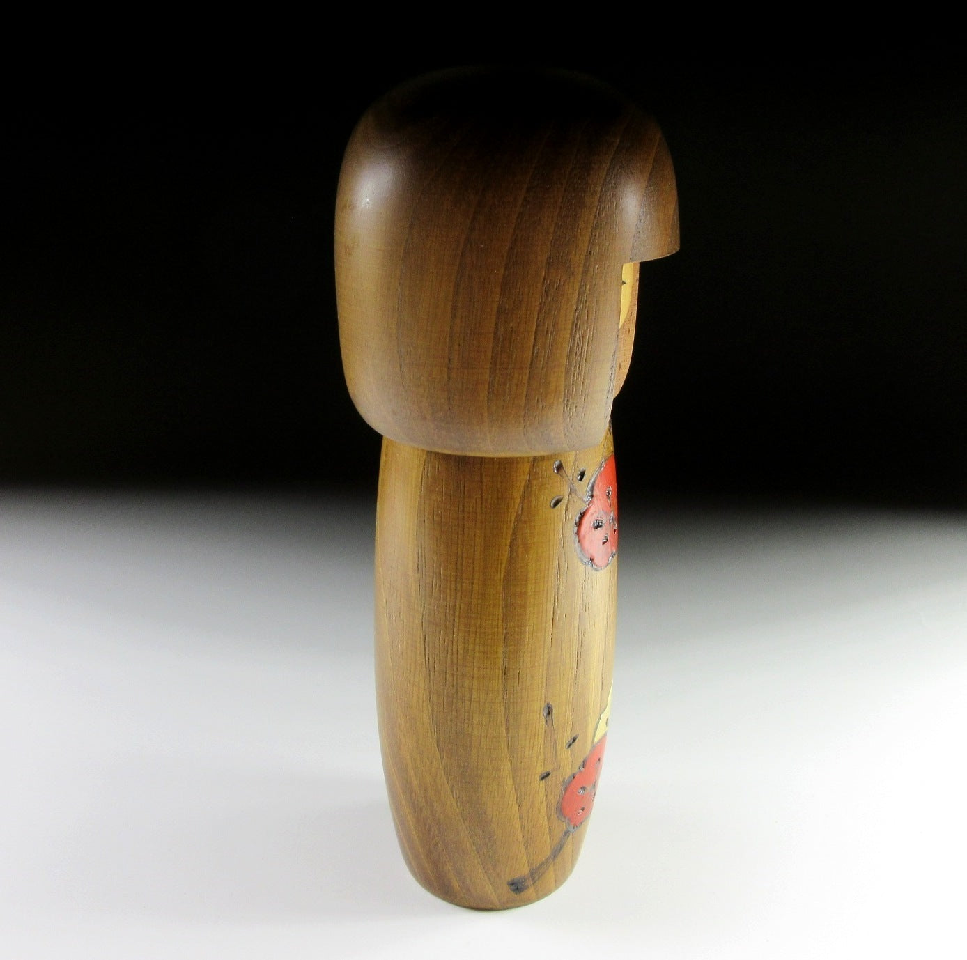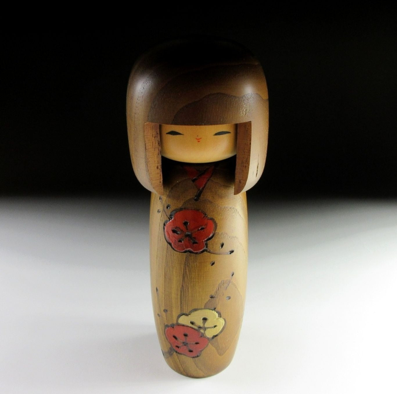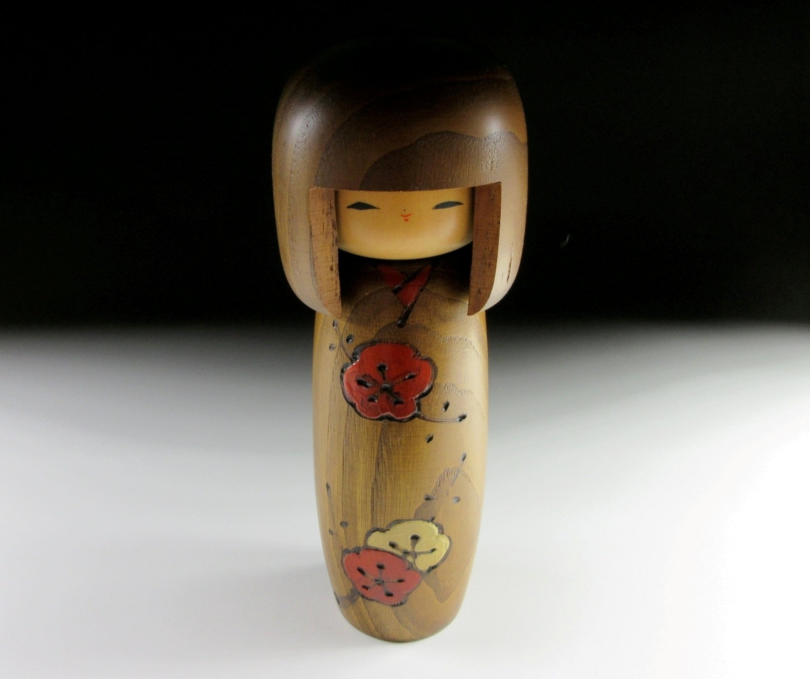 This listing is for a charming kokeshi doll dated May 22 Showa 63 (1988) by a member of the Usaburo Kokeshi workshop in Gunma. It is made of wood and the front is decorated with red and white ume blossoms. She has bobbed hair and this type of kokeshi is the sosaku type, which means modern. The writing on the doll includes the date and explains that this was a memorial gift. The signature of the craftsperson can be found near the base, and the seal on the bottom says ‘Usaburo’.
