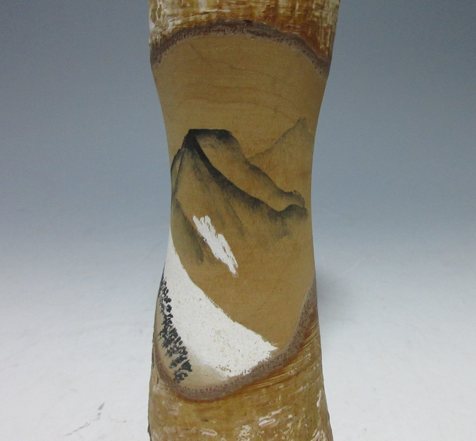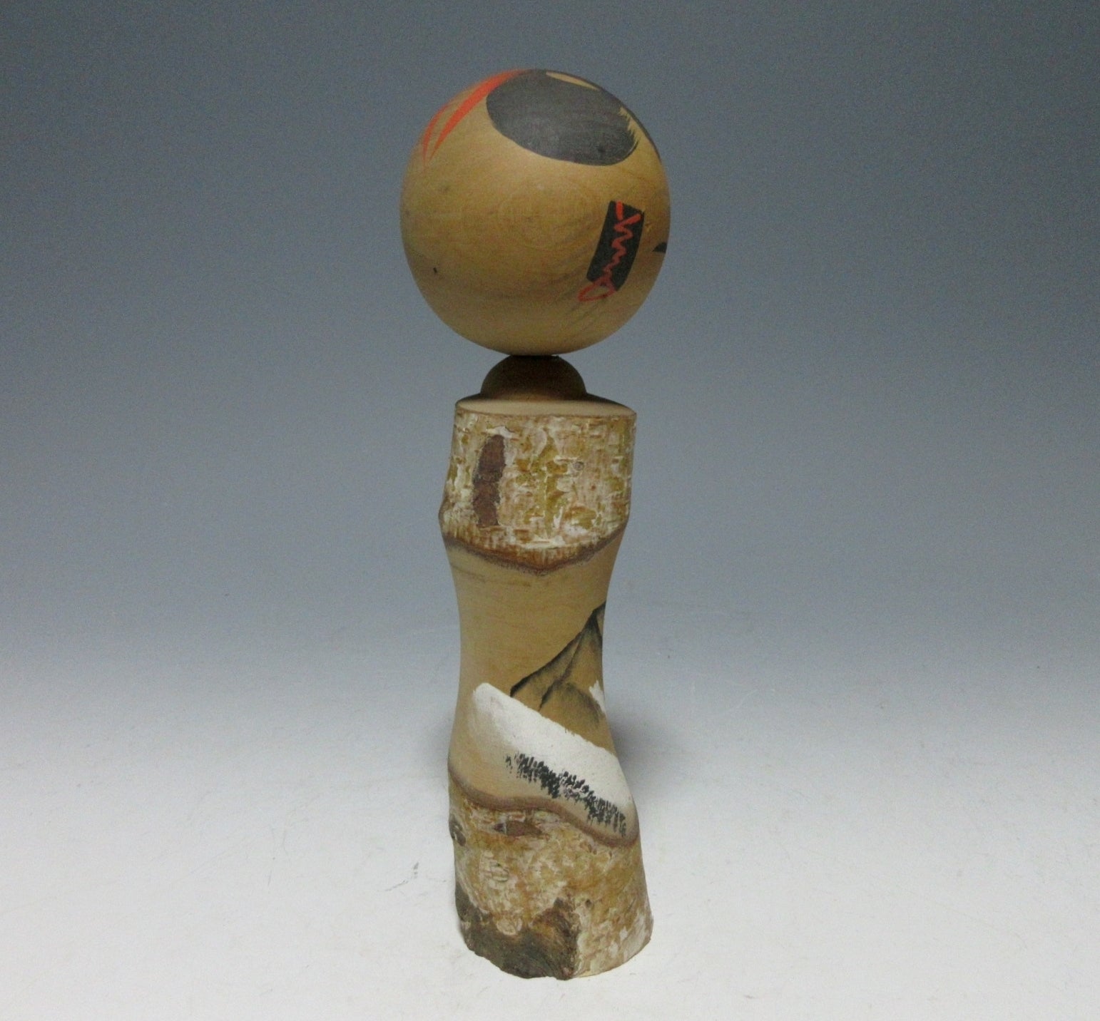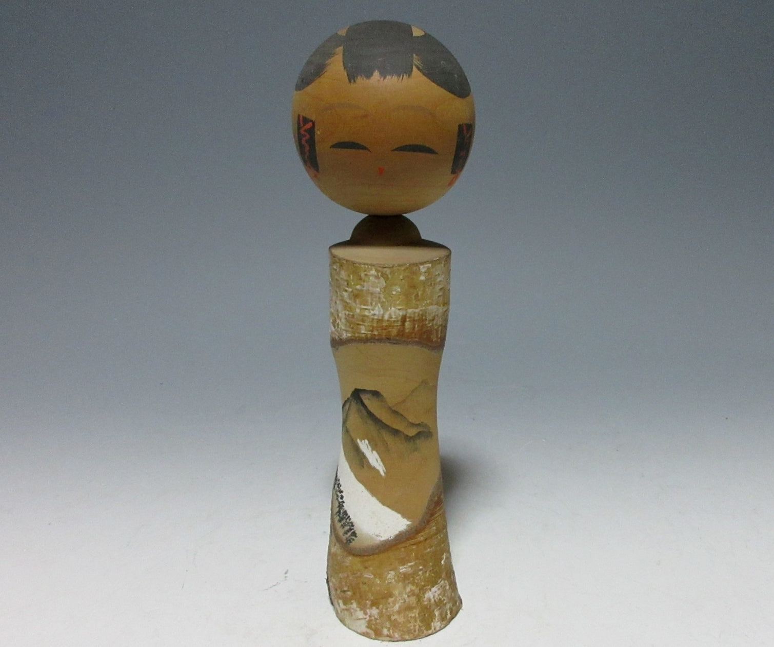 This listing is for a vintage kokeshi doll made around 20 years ago. It is made of shirakaba white birch, and the front features a hand-painted depiction of mountain peaks. There are different versions of white birch kokeshi available all across Japan, and all feature beautiful paintings boasting local scenery. This item was most likely purchased as a souvenir from a hot spring resort or well-known sightseeing area in the Japanese Alps.