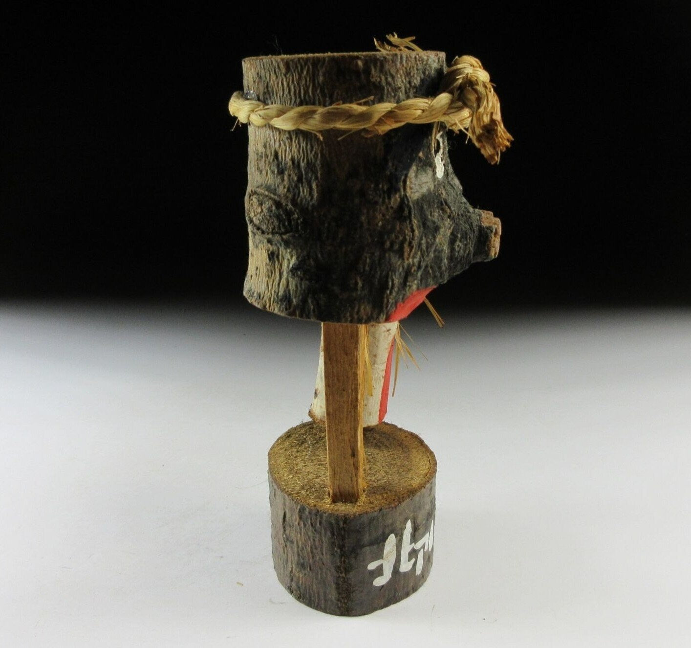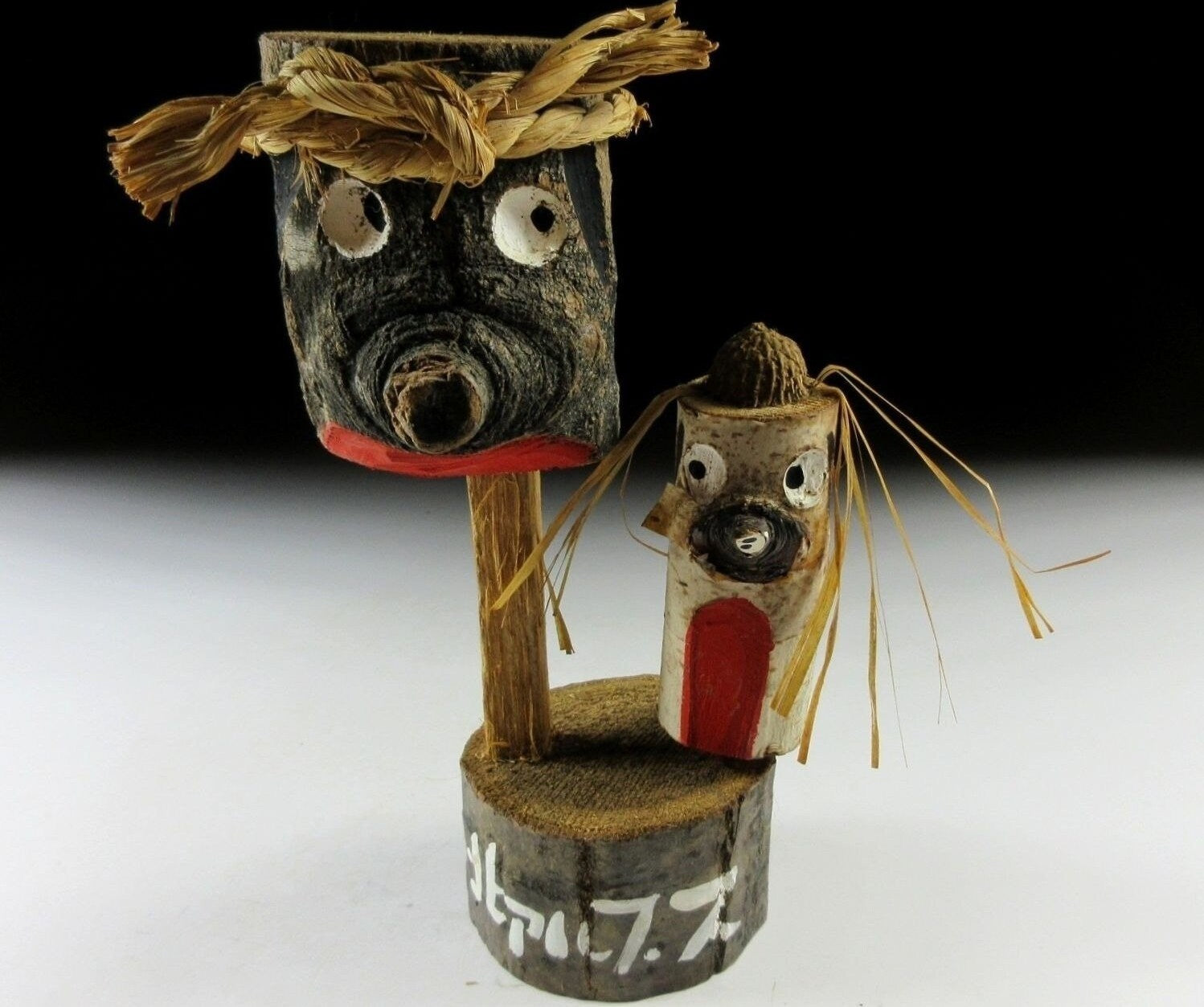 This listing is for a wooden ornament featuring two gentlemen mounted on a thick slice of wood. Neither is particularly handsome and they seem to have noticed that about each other - their body language kind of says it all. The writing around the base reads as ‘Northern Alps’, so this was most likely a souvenir of sorts from the Nagano area.