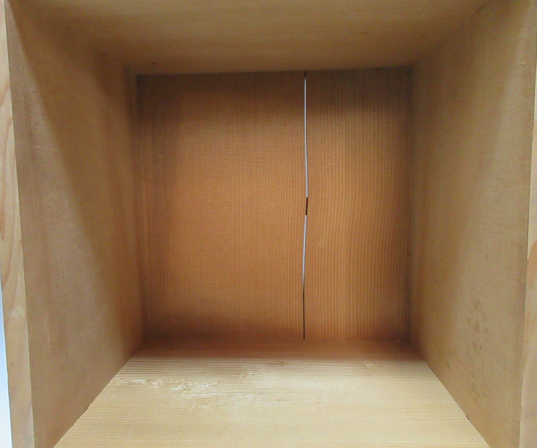 The interior is in very good condition and has been well taken care of. There’s some light wear on both sides of the lid, and some very minor surface rust on the bottom. The exterior has an orange tinge which I assume to be very light surface rust. The rails under the lid need a spot of glue, and there’s a split in the bottom of the box.