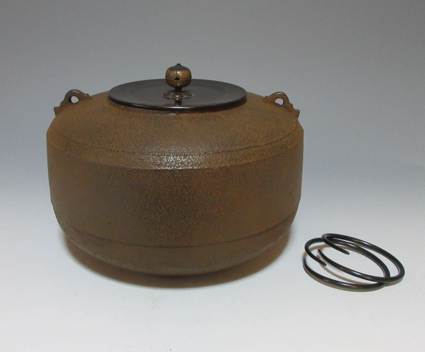 This listing is for a kama made around 30-40 years ago by master craftsman Wada Minosuke XII. A kama is a metal pot that functions as a kettle during the tea ceremony. It is used to heat up water for making tea. Kama are usually made from iron or copper, although the lid is sometimes made from a different material to the actual kettle. The lids are forged the same time as the kettle so they match the pot perfectly. During the tea ceremony the lid of the kettle is removed and placed on a futaoki. When all of the guests have had enough tea the lid is placed back on top. Sometimes it is necessary to move the kama in order to add more charcoal to the fire. Two loops are cast on the shoulder to attach rings when the kama is to be carried. The kama in this listing is cast from wrought iron, metal rings for carrying the kettle are also included. It comes with its original signed wooden storage box.