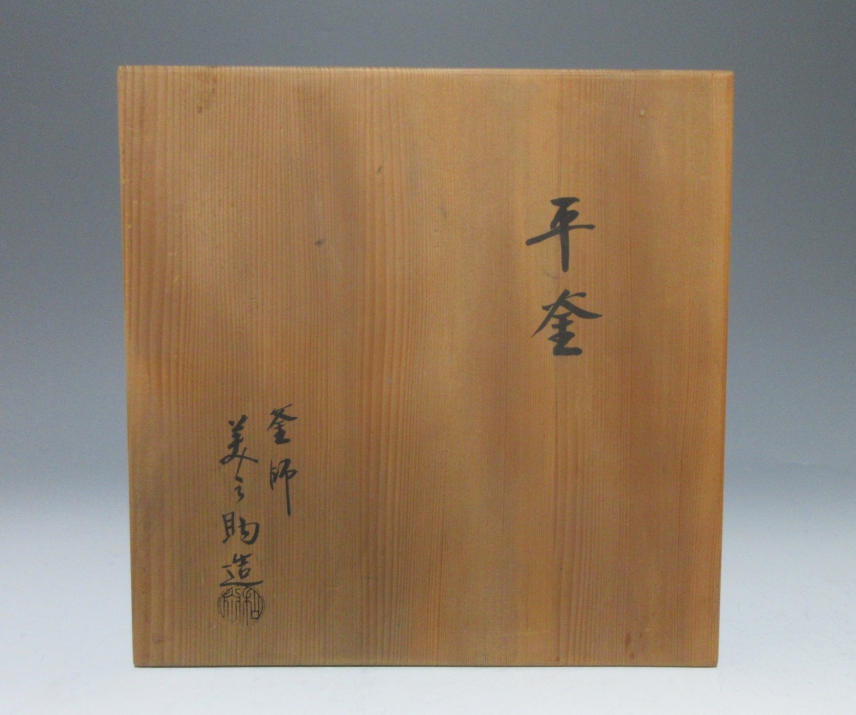 Wada Minosuke XII (b.1941) was born in Kyoto City and is the 12th generation master of the revered ‘Wada Shinano Daijo Fujiwara Kunitsugu’ bell casting family who has been in business since the Edo period. The first generation held the official title of ‘Wada Shinano Daijo Fujiwara Kunitsugu’ and lived in Sanjo Kamanza, Kyoto. Kamanza was largely inhabited by the metal casting guild in Kyoto, and Wada was the head. He cast kettles and hanging bells for temples, his work can be found as far north as Kōzen-ji temple in Yamagata Prefecture. The second generation was known as ‘Wada Shinano Daijo Fujiwara Kunitsugu Gohei’ and he continued the casting tradition. In 1636 he cast a massive bell for Chion-in Temple in Kyoto. It measures 3.3 metres high and weighs 70 tonnes, making it one of the largest bells in Japan. In 1689 he was given the rank of ‘Jugoi’, which translates as Junior Fifth Rank. Successive generations continued to cast temple bells, well-known examples being at Daitokuji Temple (Kyoto), Honnoji Temple(Tokyo), Myoshinji Temple (Kyoto), Manpukuji Temple (Kyoto), Kenninji Temple (Kyoto), Kiyomizudera Okunoin Temple (Kyoto), Kurodani Konkai Komyoji Temple (Kyoto), and Hyakumanben Chion-in Temple (Kyoto). In 1864 the Hamaguri Gate Rebellion against the Tokugawa Shogunate destroyed important works that couldn’t be restored, and this inevitably ushered in a new era for the Wada family. The 10th generation Wada Minosuke moved away from casting bells and turned to casting kettles for the tea ceremony. The 11th generation inherited the former generation’s techniques and incorporated old casting methods from the 1st generation. He passed away in 1960 and was succeeded by Wada Minosuke XII. The 12th generation inherited techniques from successive generations and devoted his career to research and improvement. His work is in very high demand among dealers who specifically buy pieces for respected collectors and tea practitioners. The prestigious Wada family is now in its 13th generation. **Fellow sellers, this information was researched by Kominka Zakka and CANNOT be used in your own listings.