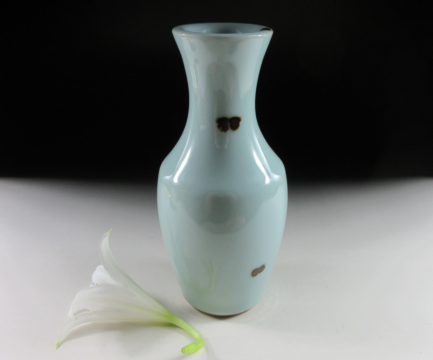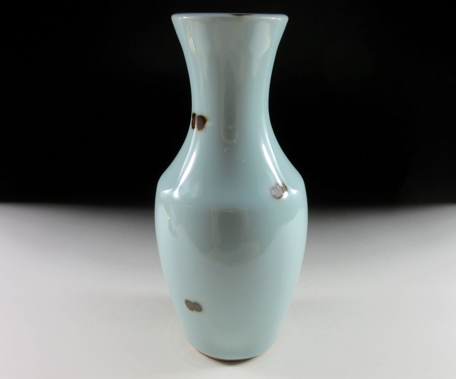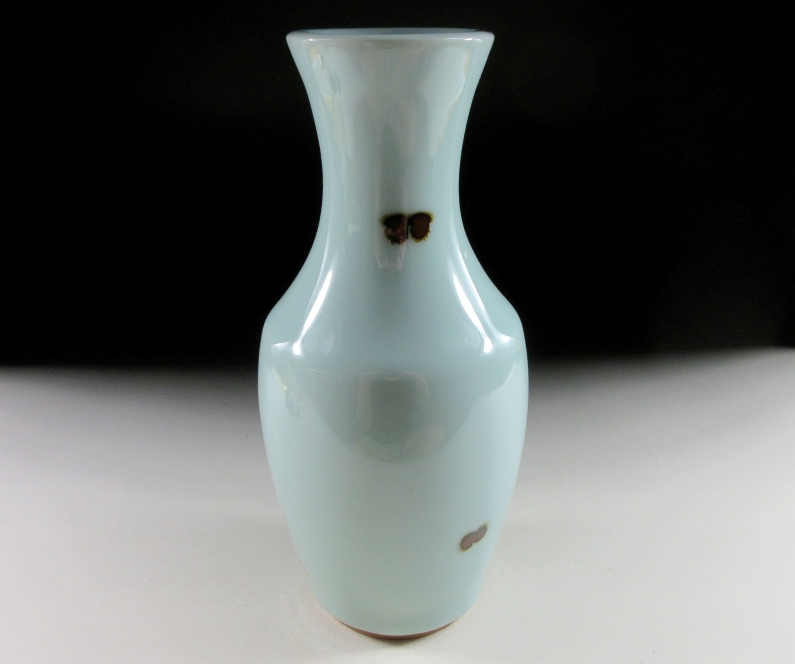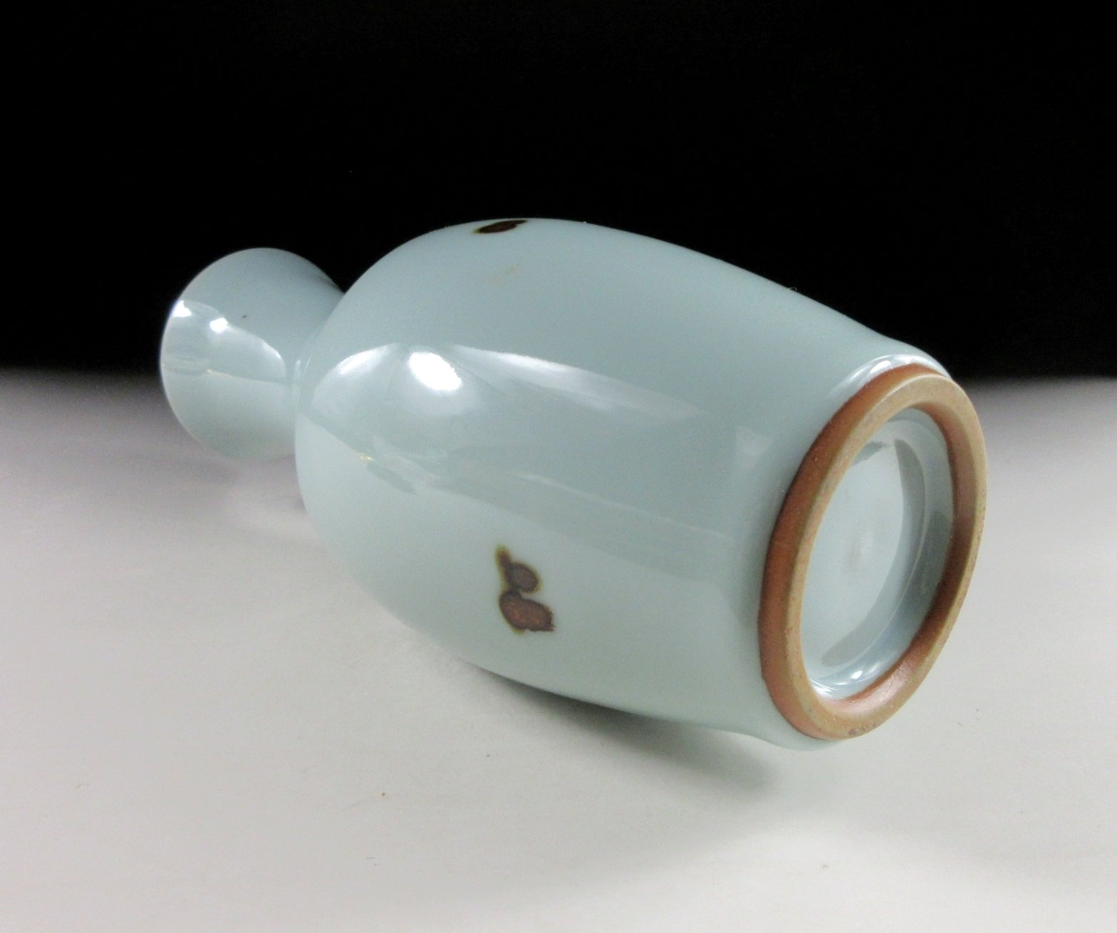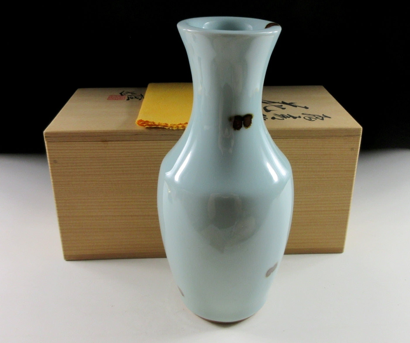 This listing is for an attractive Kyo-ware vase made around 10-20 years ago by noted potter, Wakunami Soryu II. It is wheel-thrown and coated in pale blue celadon glaze with small dabs of iron oxide. It has a glossy finish and the opening is wide enough to accommodate a few thin stemmed flowers. The stamp of the potter can be found on the bottom, and it comes with its original signed wooden storage box. It also comes with a turmeric coloured wrapping cloth for when the item is not in use.