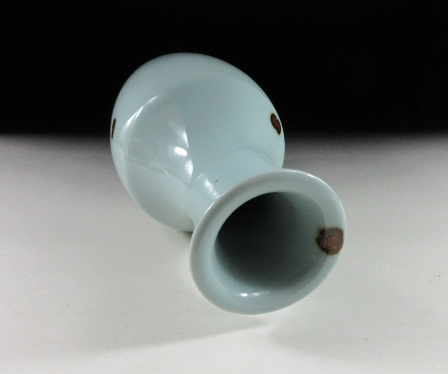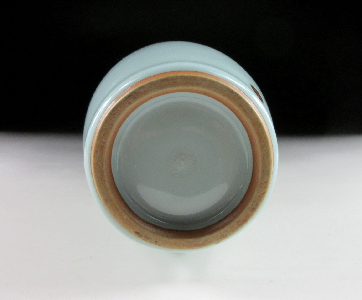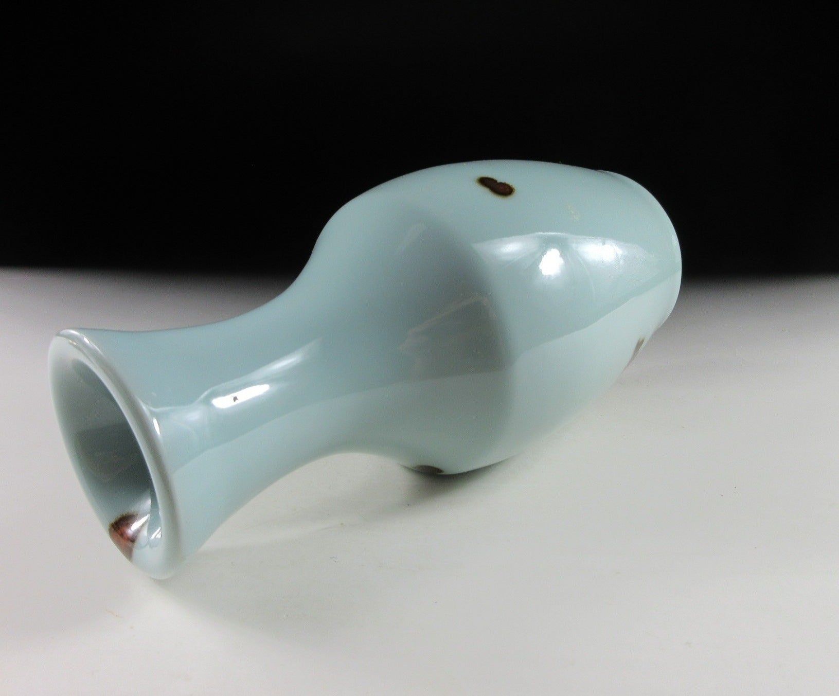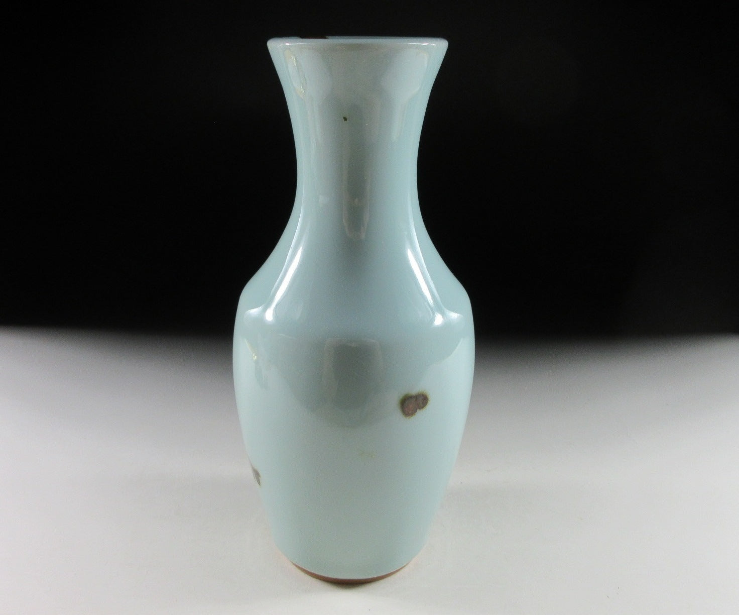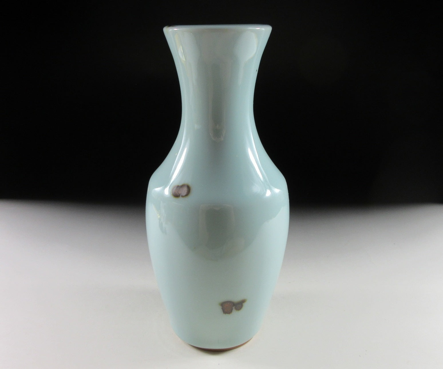 This listing is for an attractive Kyo-ware vase made around 10-20 years ago by noted potter, Wakunami Soryu II. It is wheel-thrown and coated in pale blue celadon glaze with small dabs of iron oxide. It has a glossy finish and the opening is wide enough to accommodate a few thin stemmed flowers. The stamp of the potter can be found on the bottom, and it comes with its original signed wooden storage box. It also comes with a turmeric coloured wrapping cloth for when the item is not in use.