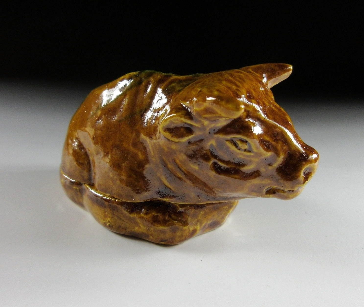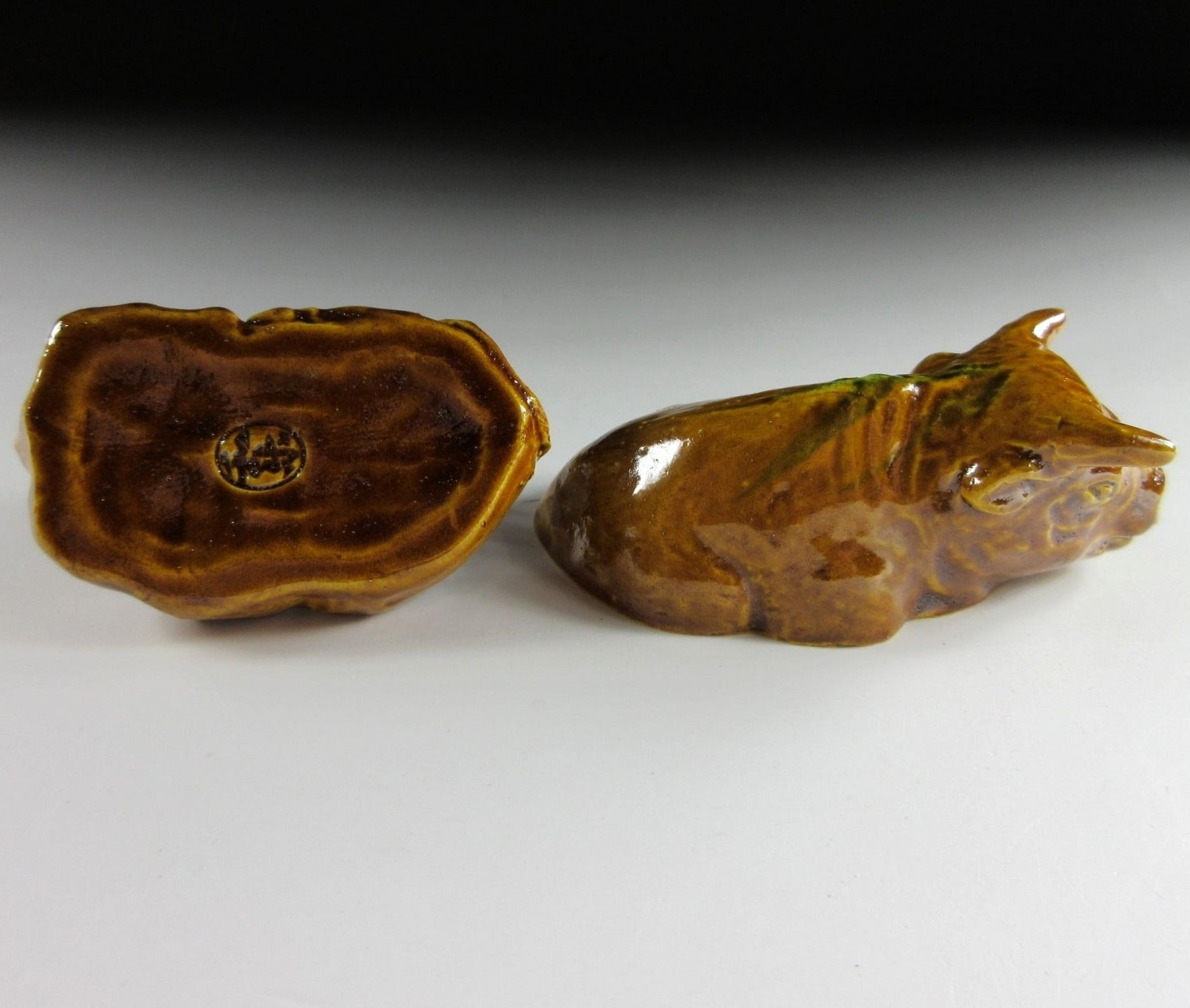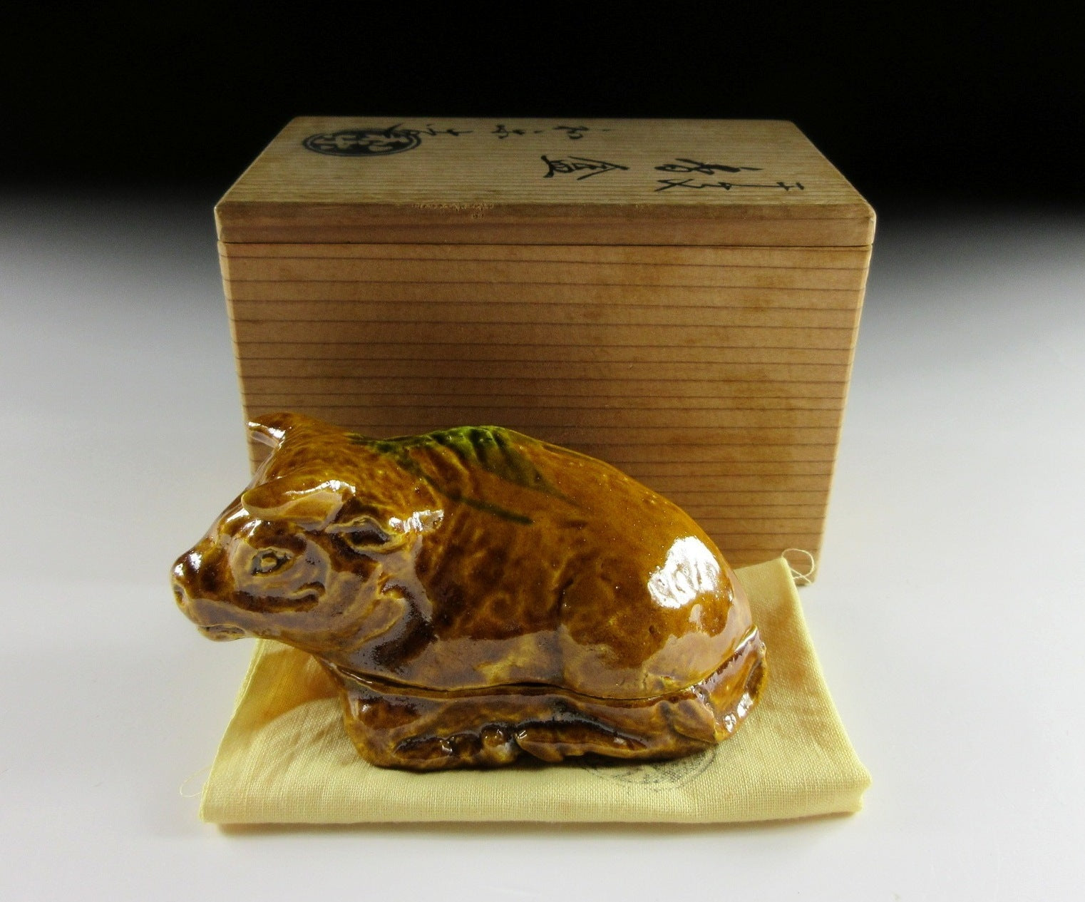 This listing is for a Raku-ware kogo made 30 years ago by noted potter, Waraku Kawasaki VII. It has been moulded to resemble an ox, and the exterior is coated in ame-yu glaze. It’s suitable for holding both kneaded or woodchip incense, and was most likely made to commemorate the Year of the Ox back in 1985. The stamp of the potter can be found on the bottom, and it comes with its original paper storage box. It also comes with a stamped yellow wrapping cloth for when the item is not in use.