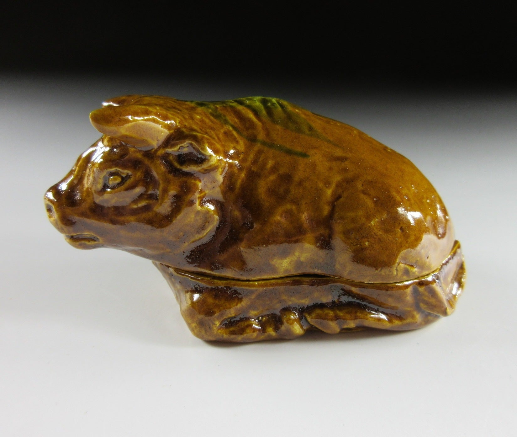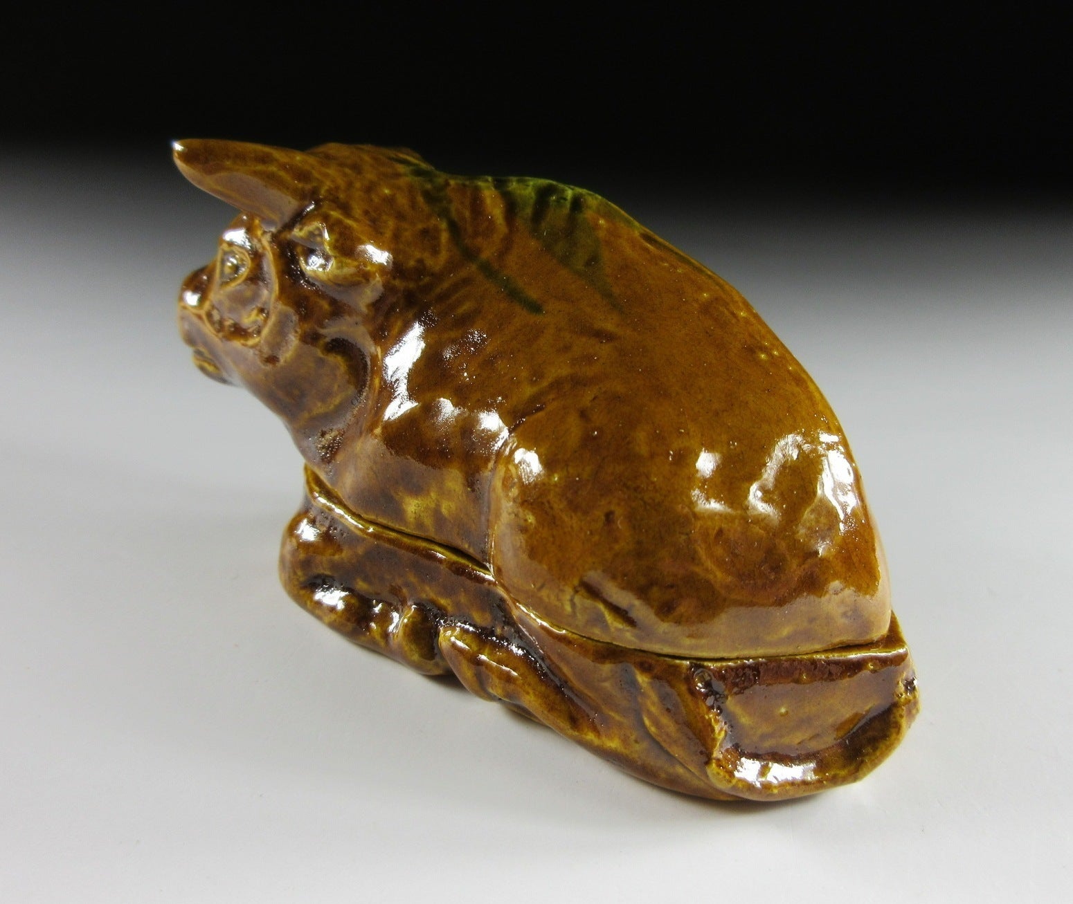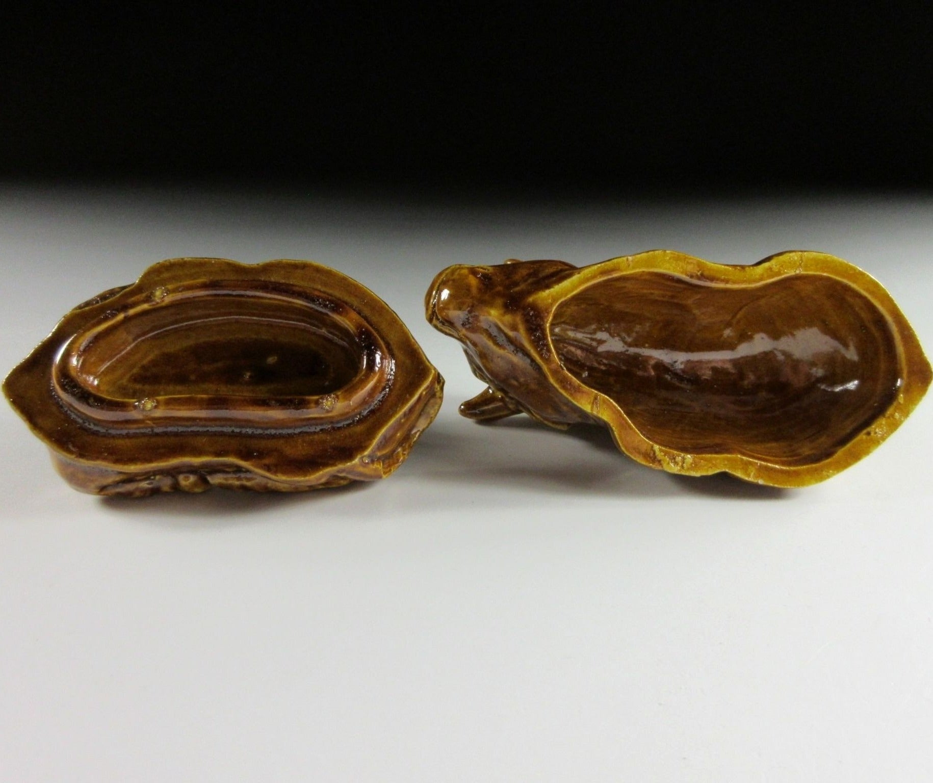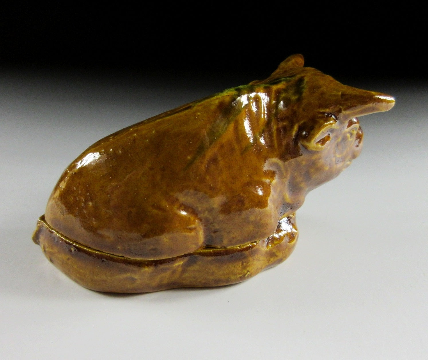 This listing is for a Raku-ware kogo made 30 years ago by noted potter, Waraku Kawasaki VII. It has been moulded to resemble an ox, and the exterior is coated in ame-yu glaze. It’s suitable for holding both kneaded or woodchip incense, and was most likely made to commemorate the Year of the Ox back in 1985. The stamp of the potter can be found on the bottom, and it comes with its original paper storage box. It also comes with a stamped yellow wrapping cloth for when the item is not in use.