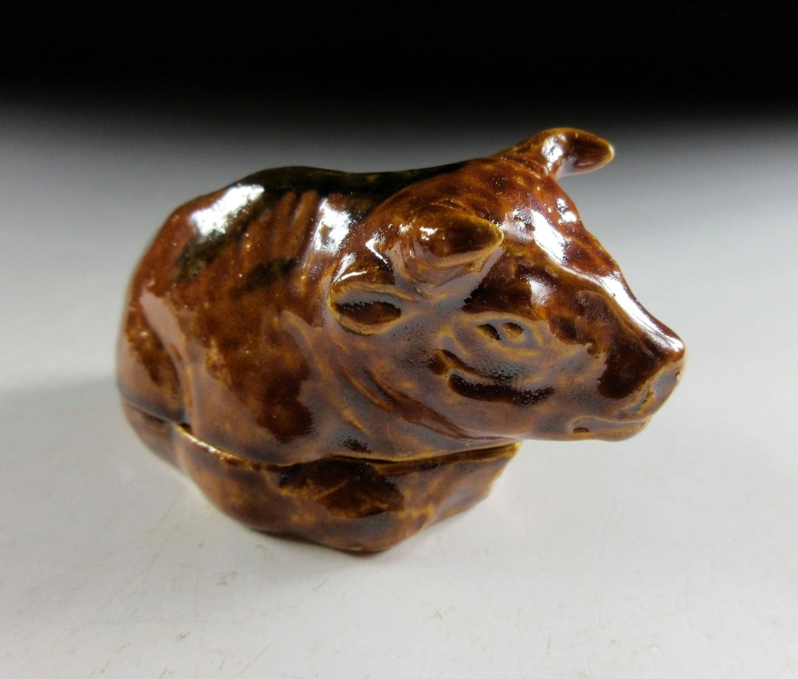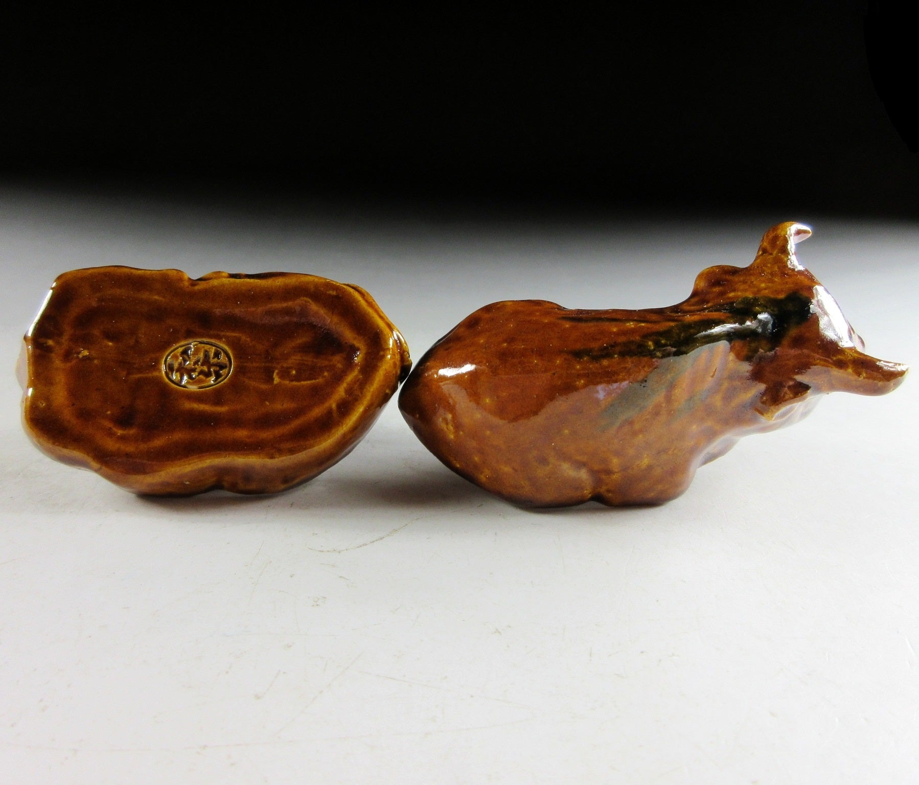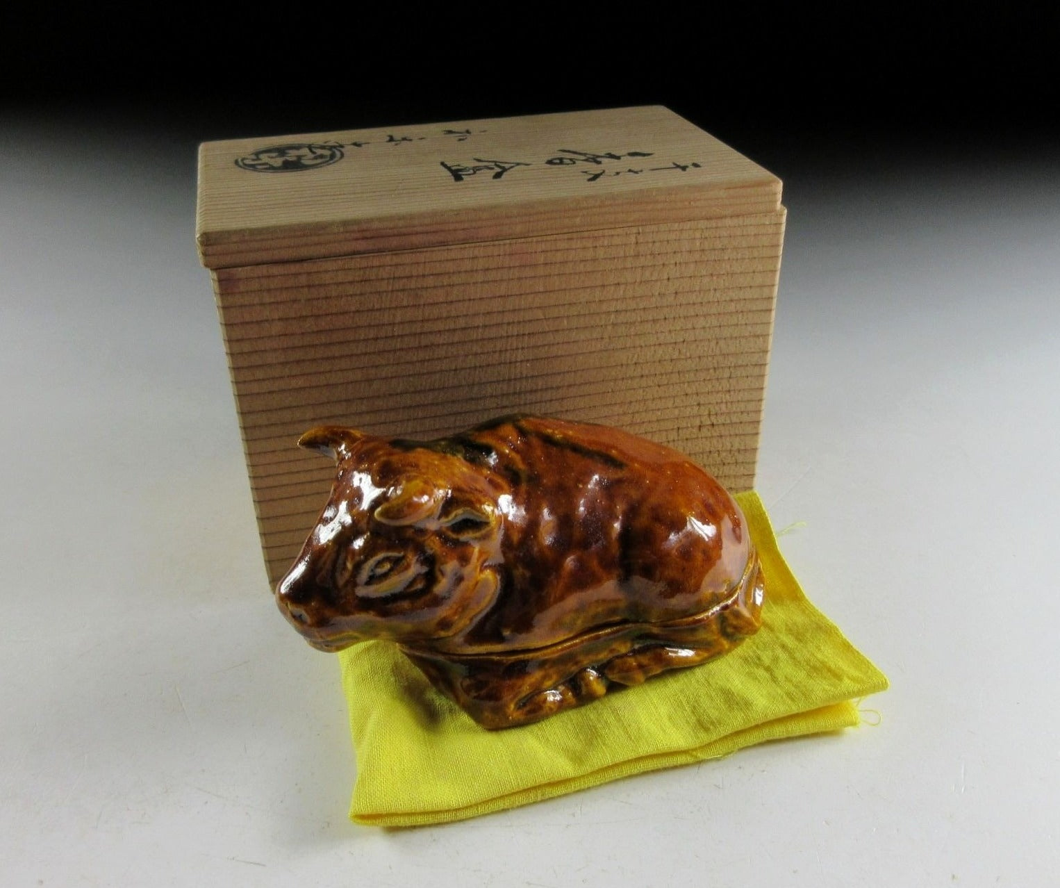 This listing is for a Raku-ware kogo made 30 years ago by noted potter, Waraku Kawasaki VII. It has been moulded to resemble an ox, and the exterior is coated in ame-yu glaze. It’s suitable for holding both kneaded or woodchip incense, and was most likely made to commemorate the Year of the Ox back in 1985. The stamp of the potter can be found on the bottom, and it comes with its original paper storage box. It also comes with a stamped yellow wrapping cloth for when the item is not in use.