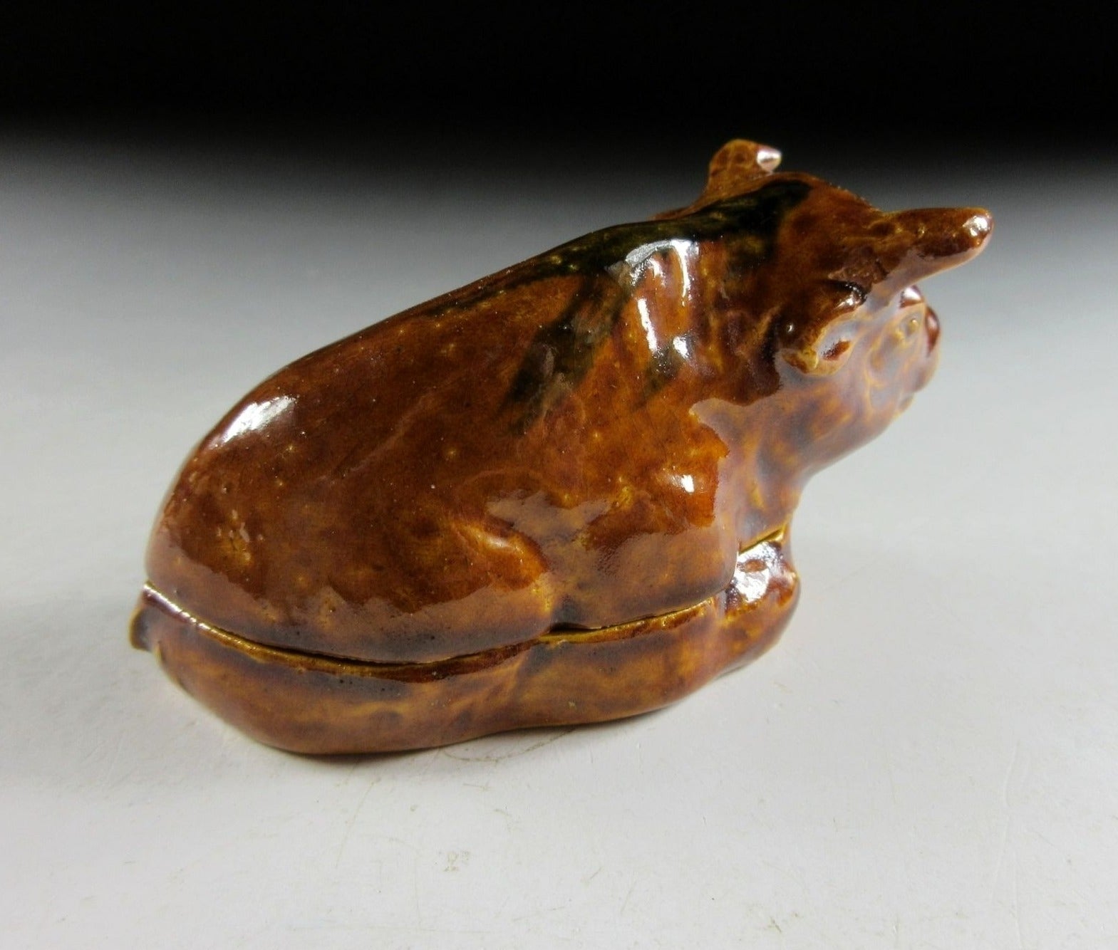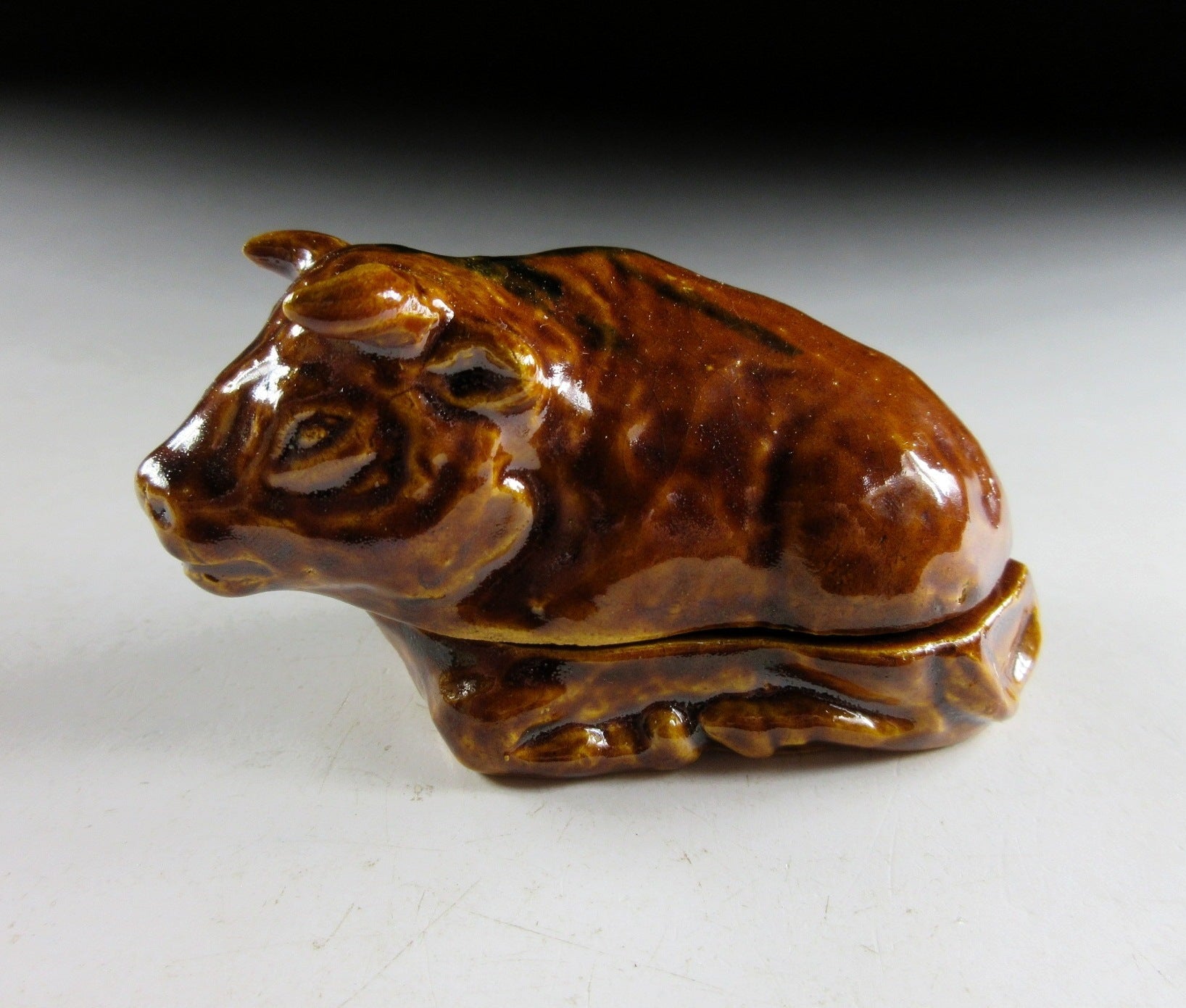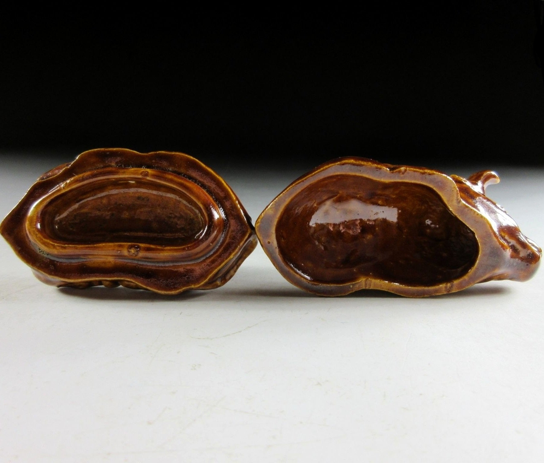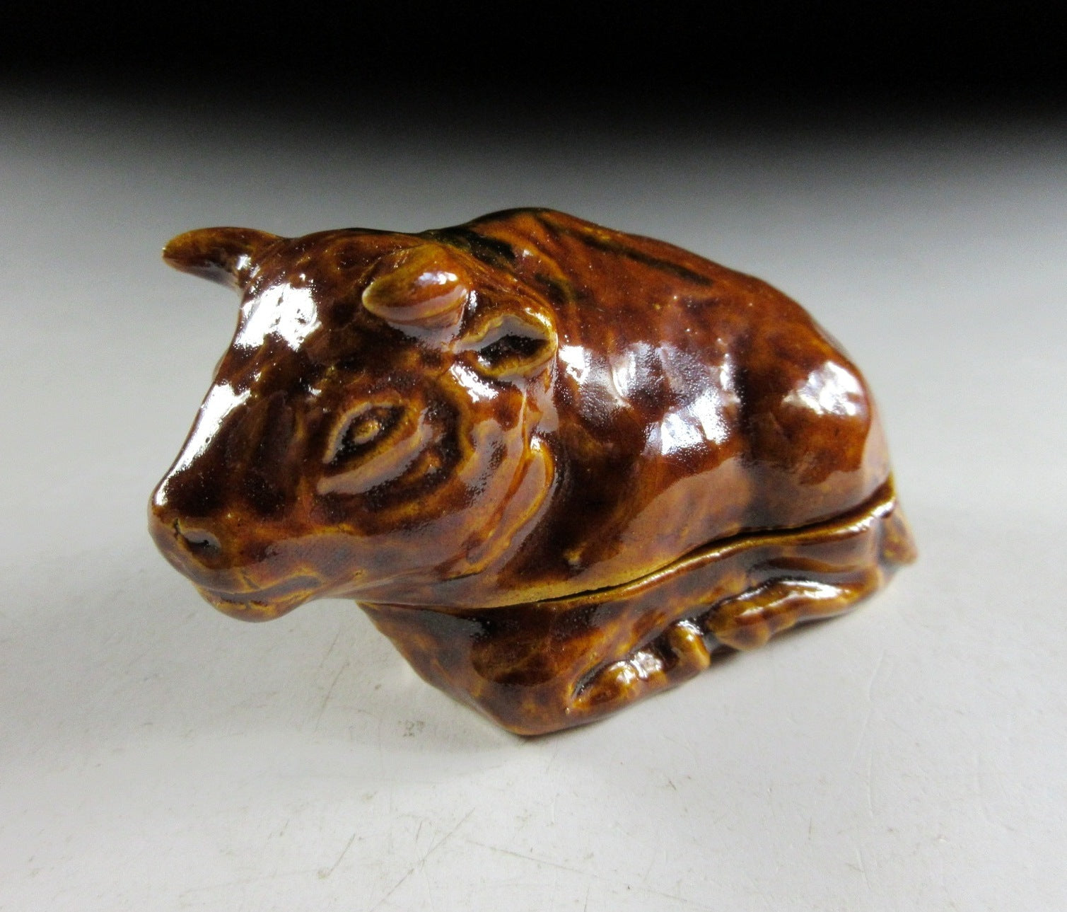 This listing is for a Raku-ware kogo made 30 years ago by noted potter, Waraku Kawasaki VII. It has been moulded to resemble an ox, and the exterior is coated in ame-yu glaze. It’s suitable for holding both kneaded or woodchip incense, and was most likely made to commemorate the Year of the Ox back in 1985. The stamp of the potter can be found on the bottom, and it comes with its original paper storage box. It also comes with a stamped yellow wrapping cloth for when the item is not in use.