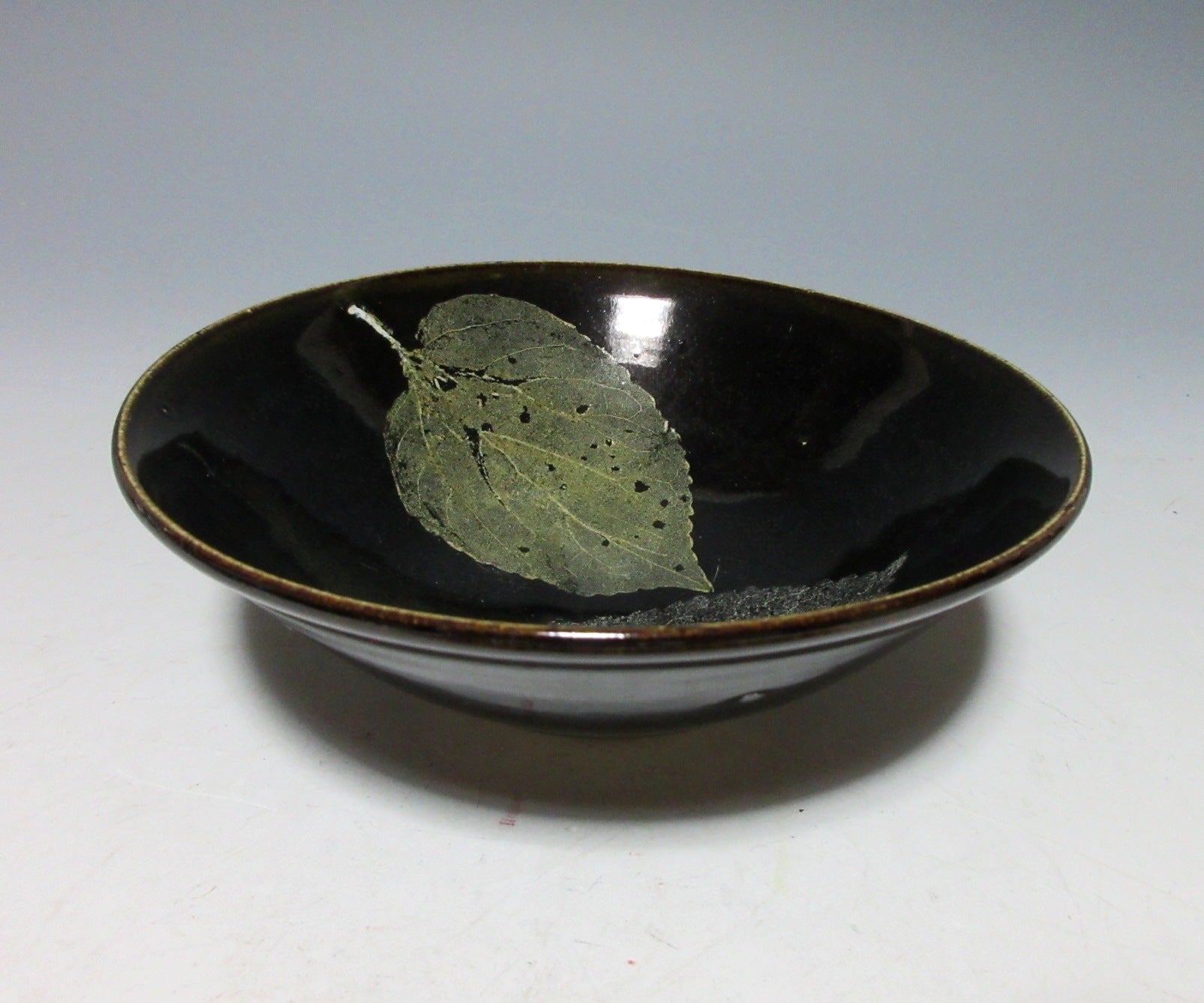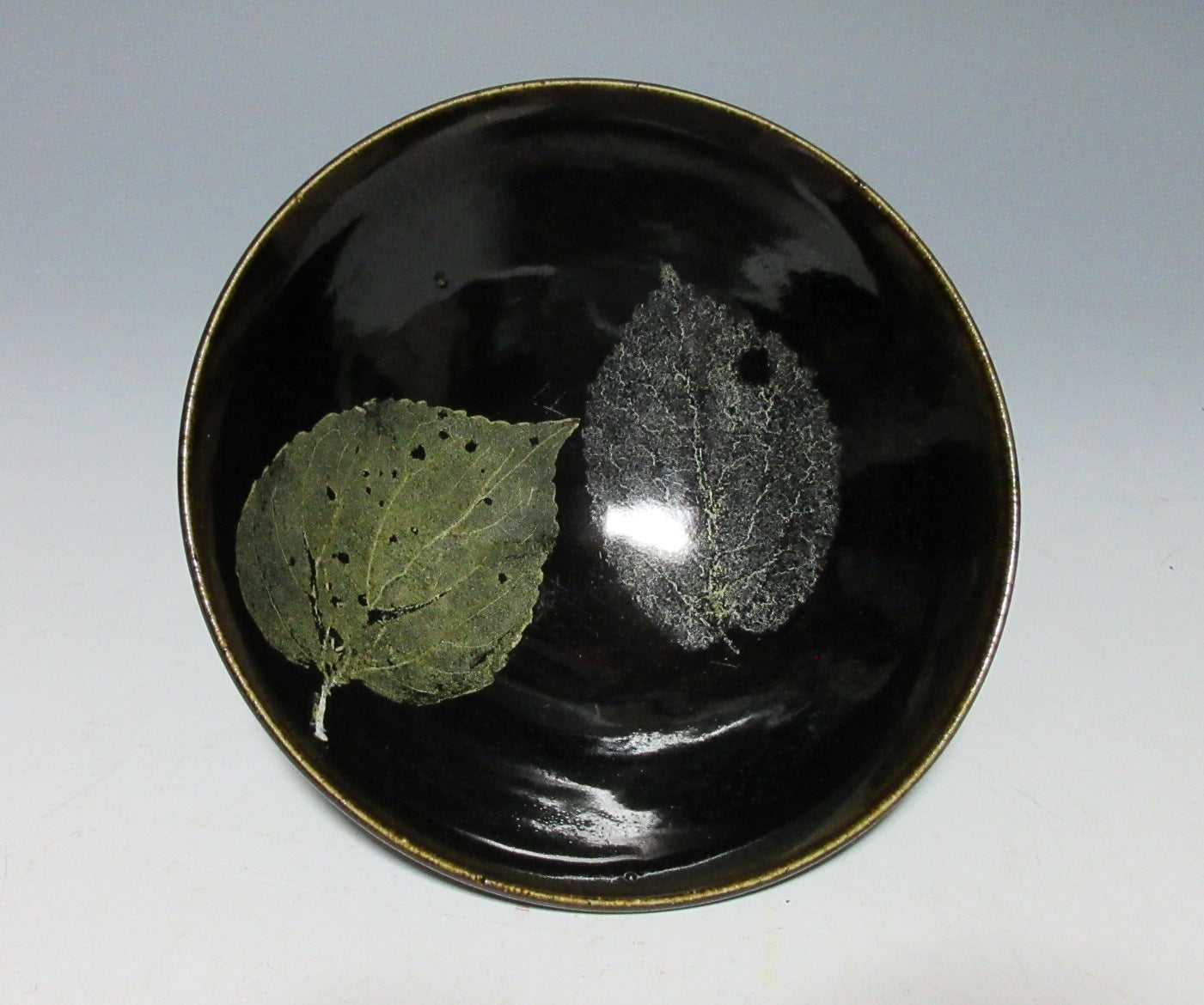 This listing is for a konoha-tenmoku chawan made around 20 years ago by Tokyo based potter, Watanabe Aoi. It is wheel-thrown and the flat hira type used during the summer season. Hira chawan are shallow bowls with low sides designed to cool tea down faster. Also hira chawan are usually beautifully decorated on the interior as this part is readily seen by the tea drinker. The bowl in this listing features glossy dark coloured glaze over a light coloured stoneware base, and the interior is decorated with leaf imprints. Konoha-tenmoku means leaf tenmoku, and it is a pattern created by attaching leaves directly to the glaze prior to firing. During firing the leaves turn to ash, which then melts into the glaze and creates a leaf pattern. This technique was developed in Jiangxi Province in southern China during the Song dynasty. It is an incredibly difficult technique to master and only a few kilns in Japan are proficient at it. The signature of the potter can be found on the bottom, sorry no box for this one. *PLEASE NOTE THAT THE CHASHAKU TEA SCOOP IS NOT INCLUDED IN THIS LISTING.