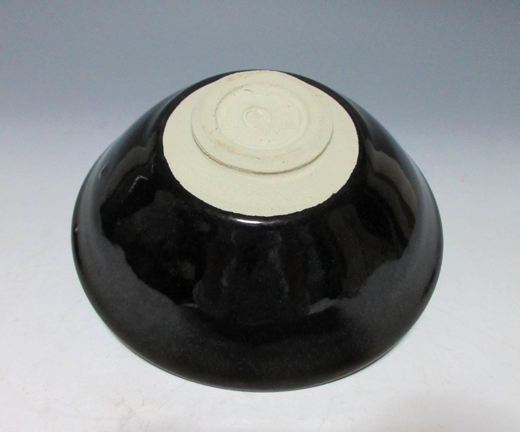 Tenmoku is the Japanese word for a specific type of pottery that originated in China during the Song dynasty. There are two variations: the yohen hare’s fur type, and the yuteki oil spot variety. Tenmoku chawan are typically well-shaped with an indented finger groove just below the rim. Also the rims are sometimes trimmed with a band of metal, or more commonly gold or silver enamel. Tenmoku pieces are high-fired and cooled quickly, resulting in a thick gathering of glaze on the lower part of the bowl. Also tenmoku pieces are not associated with just one type of ware, however the most common pieces tend to be Seto, Kyo, or Satsuma-ware.