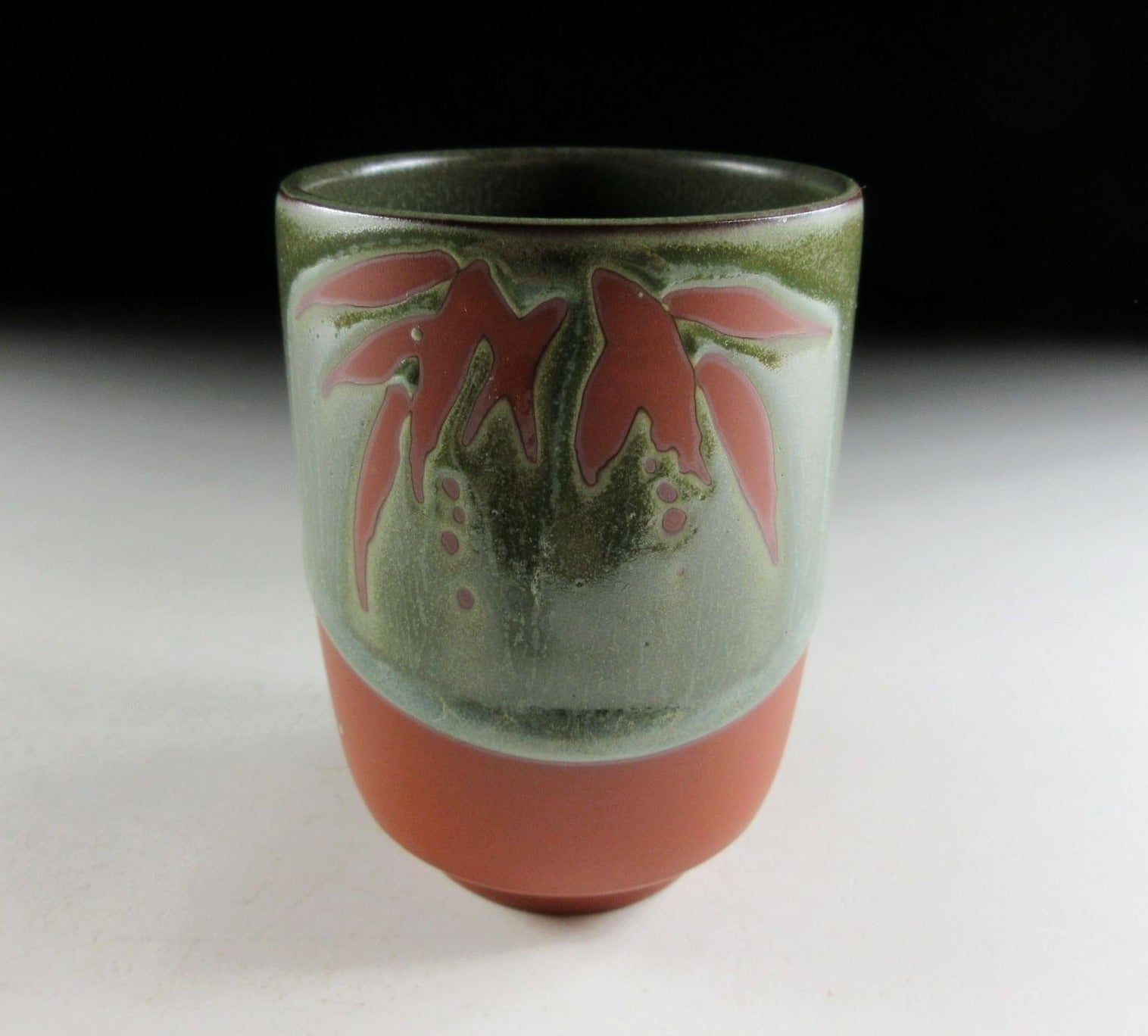 This listing is for a Mumyoi-ware yunomi made around 20 years ago by noted potter, Watanabe Touzo. It is wheel thrown and features a wax relief bamboo pattern on the front. This piece is made of high fired clay and is suitable for daily use. The stamp of the potter can be found on the bottom, and it comes with its original signed wooden storage box. It also comes with a Japanese language profile paper.