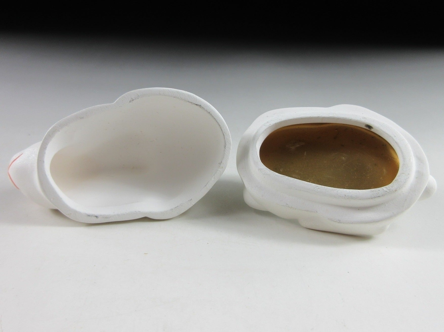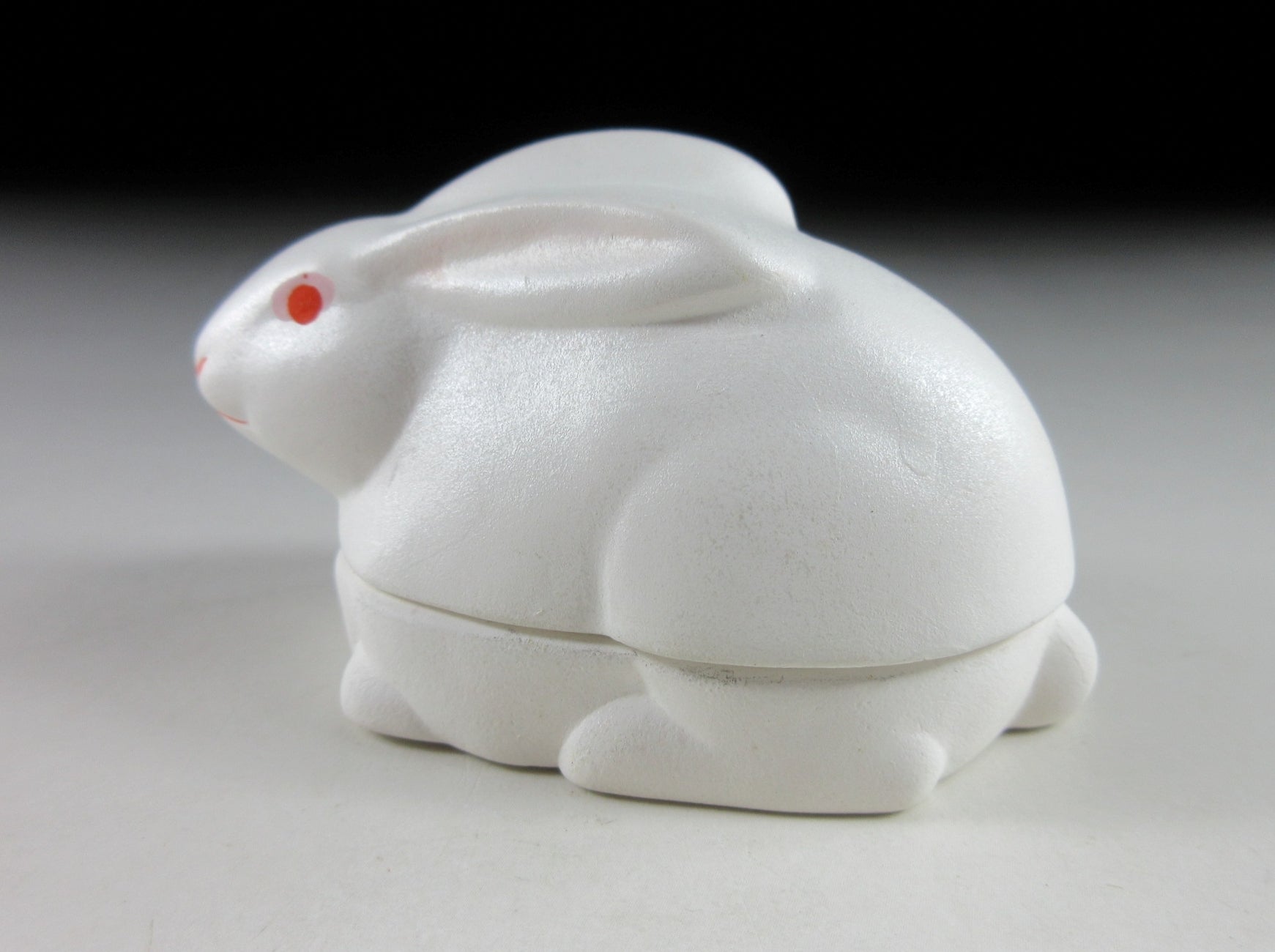 This listing is for a sweet little rabbit kogo with a smooth white finish and a gold painted interior. The twelve animals and mythological beasts of the Japanese astrological calendar are known as junishi in Japanese. Junishi kogo are very popular and they are usually decorated with auspicious symbols relating to luck and longevity, and they often feature bright colours painted with either glaze or gesso. The kogo in this listing was most likely made to commemorate the Year of the Rabbit back in 1987. It is suited to holding kneaded incense, earthenware kogo are generally intended for holding kneaded incense during the cooler months.