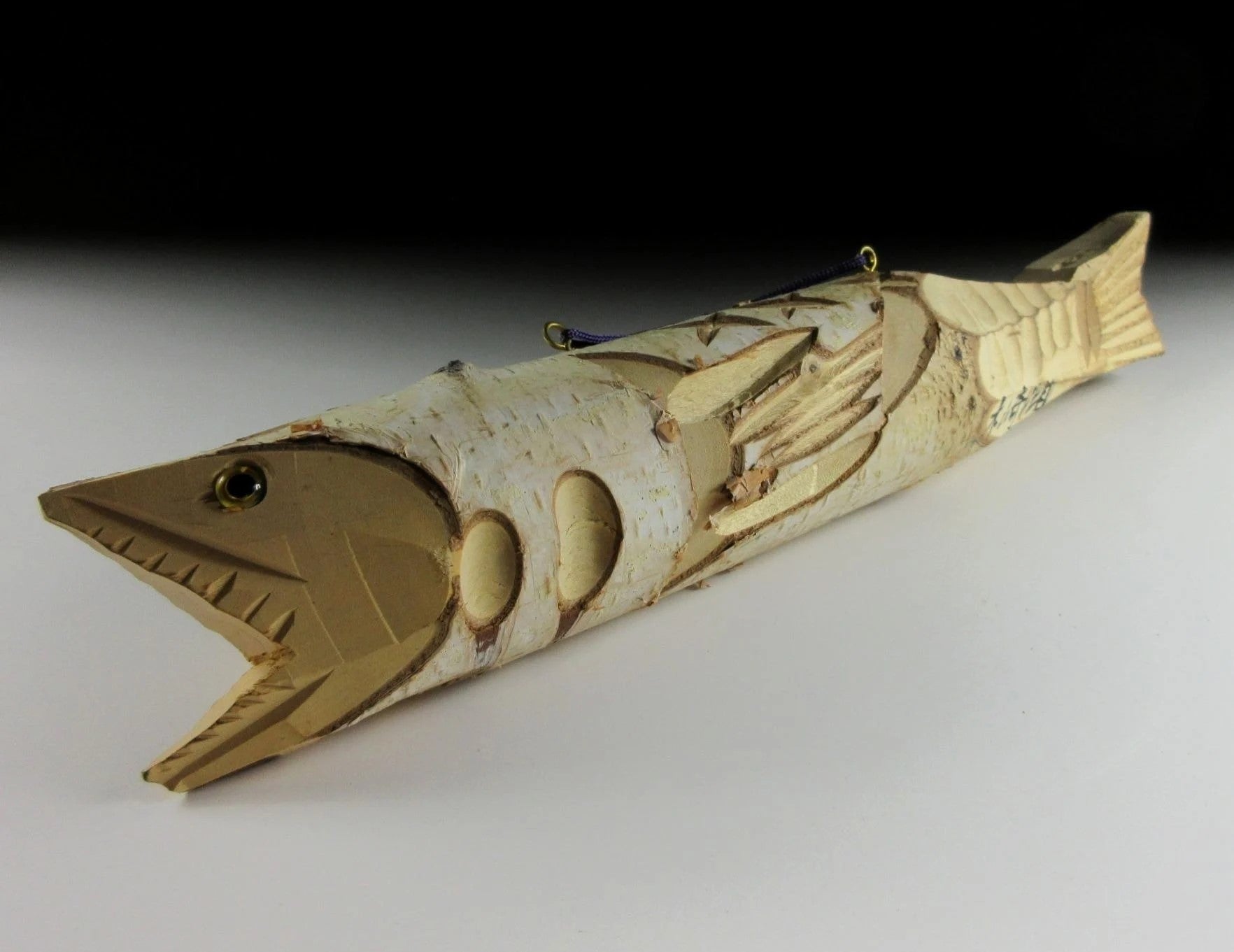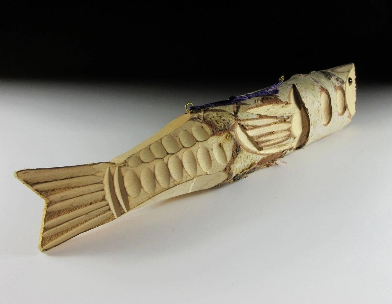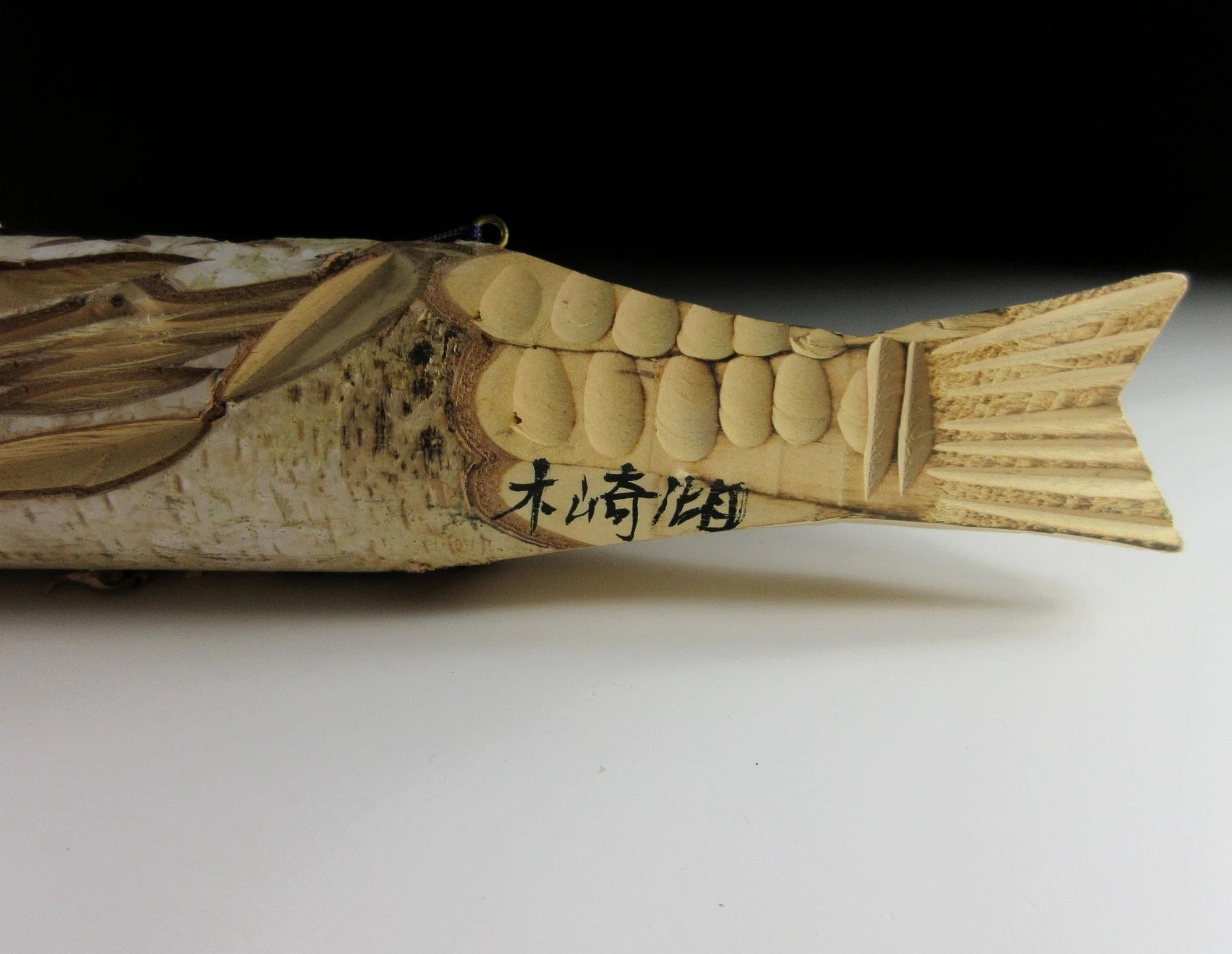 This listing is for a wooden fish ornament from Lake Kizaki in Nagano Prefecture. Lake Kizaki is located at the foot of the Northern Japanese Alps mountain range, and it’s a popular lakeside resort for bass fishing. The fish in this listing is carved from white birch and has bead eyes. There are two small hooks screwed into the top and purple string enabling it to be hung or suspended. The writing near the tail reads as ‘Lake Kizaki’. Please note that white birch has thin flaky bark that peels easily if not handled carefully.