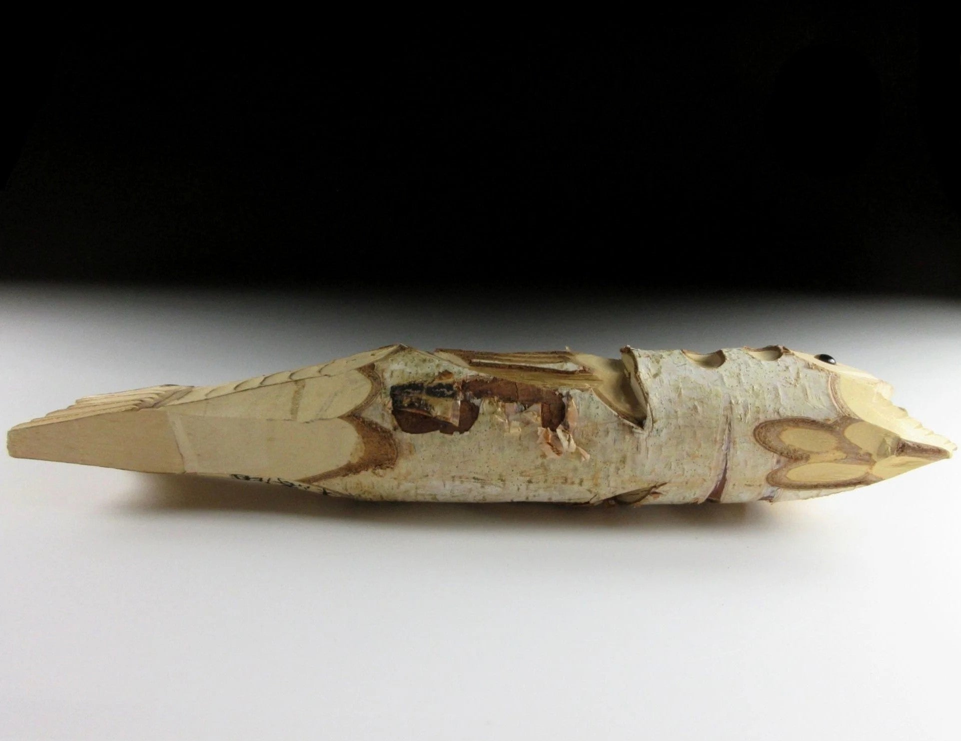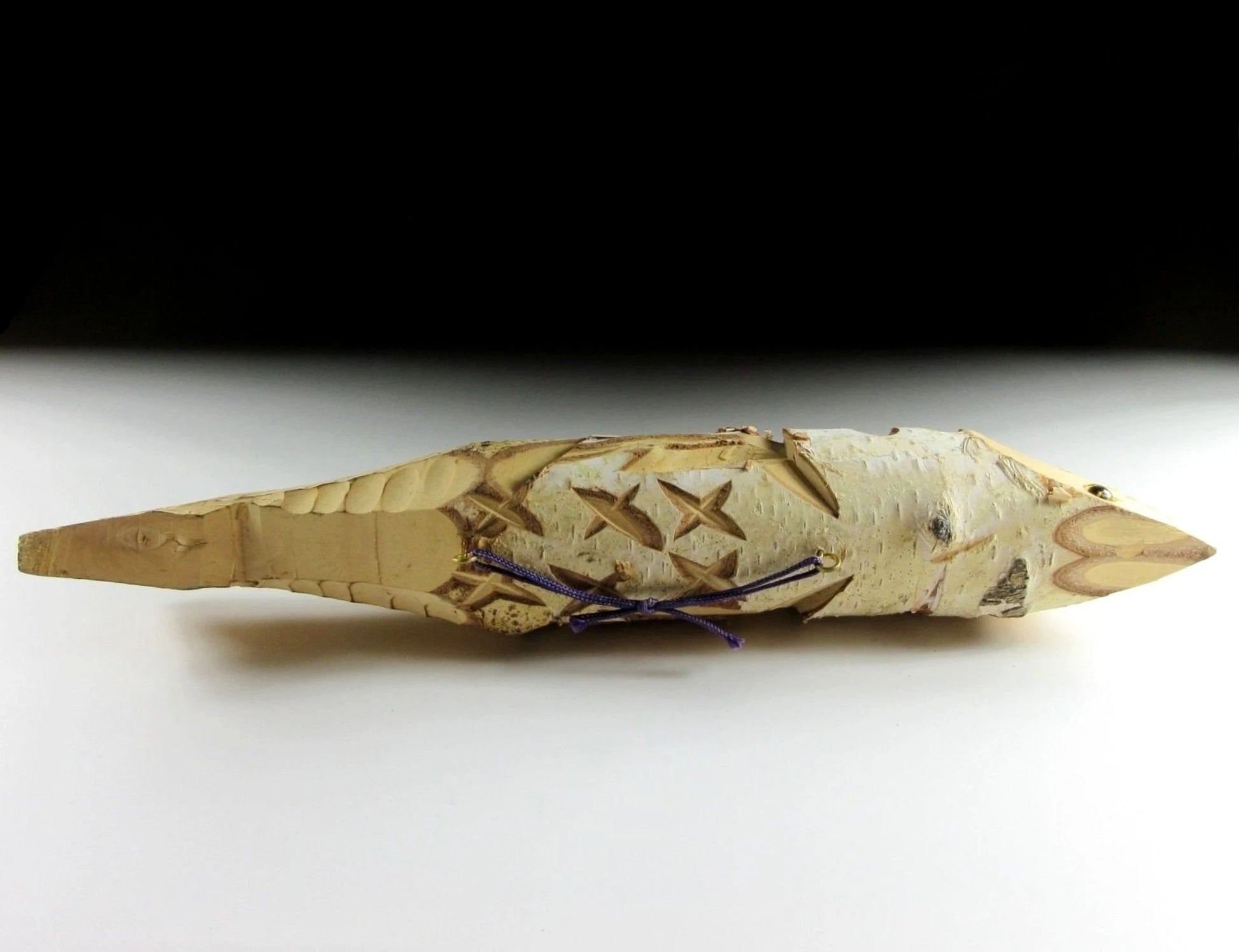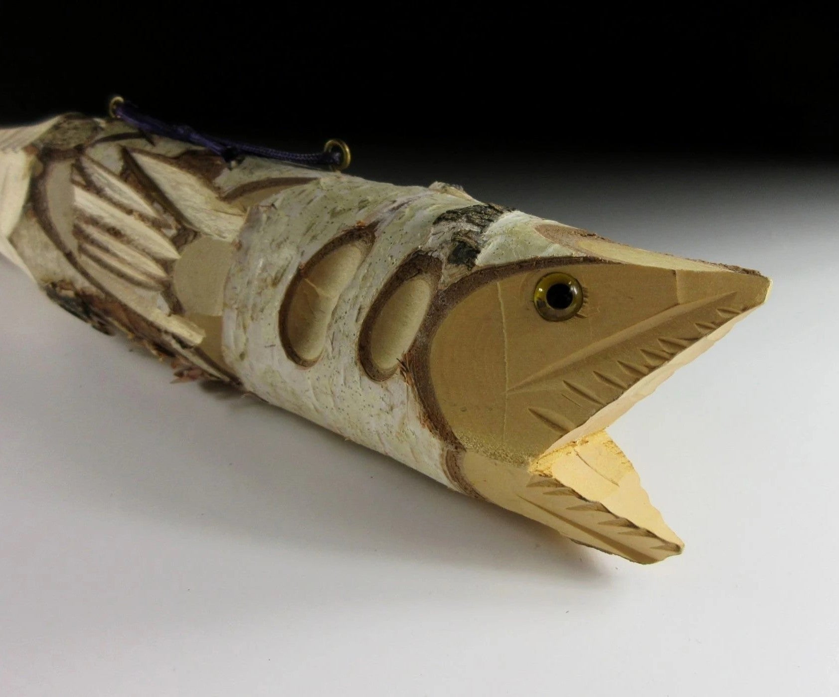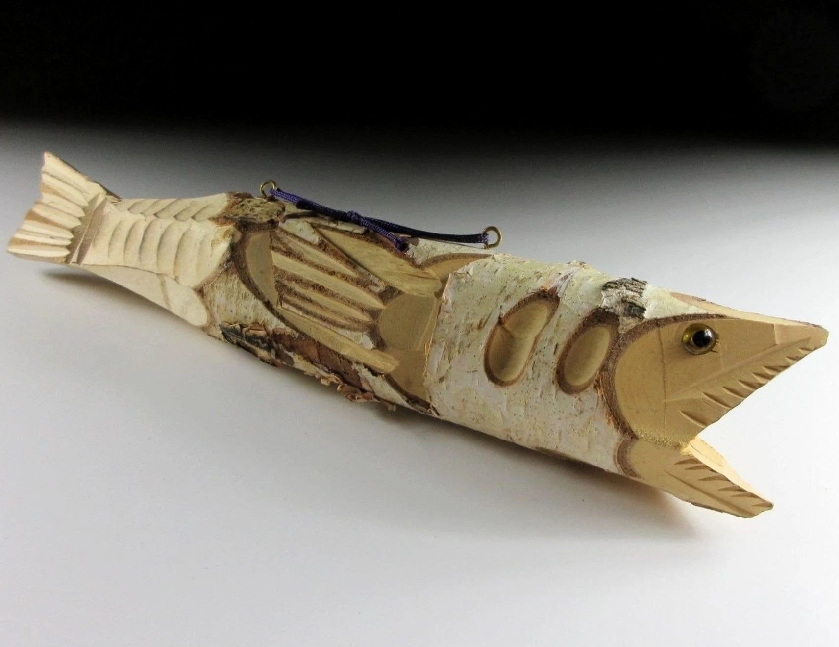 This listing is for a wooden fish ornament from Lake Kizaki in Nagano Prefecture. Lake Kizaki is located at the foot of the Northern Japanese Alps mountain range, and it’s a popular lakeside resort for bass fishing. The fish in this listing is carved from white birch and has bead eyes. There are two small hooks screwed into the top and purple string enabling it to be hung or suspended. The writing near the tail reads as ‘Lake Kizaki’. Please note that white birch has thin flaky bark that peels easily if not handled carefully.