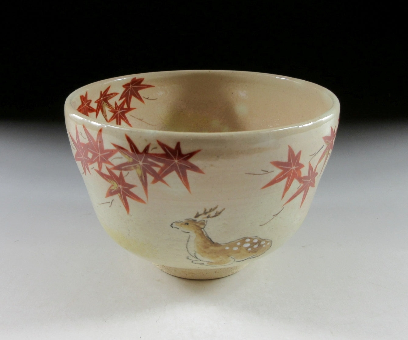 This listing is for a splendid Kyo-ware chawan made by noted potter, Yagi Kaiho. It is wheel-thrown and the front is decorated with a hand-painted depiction of a Nara deer and red autumn leaves. Nara is home to over 1200 deer that roam freely in the park near Todaiji temple. These deer are considered sacred and are designated as national treasures by the Japanese government. Nara Park is also a beautiful place for viewing autumn leaves, which is perhaps the inspiration for this wonderful chawan. The stamp of the potter can be found on the bottom, and it comes with a paper storage box. It also comes with a Japanese language profile paper about the potter. *PLEASE NOTE THAT THE CHASHAKU TEA SCOOP IS NOT INCLUDED.