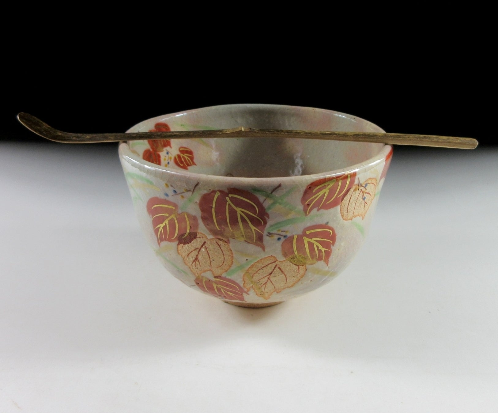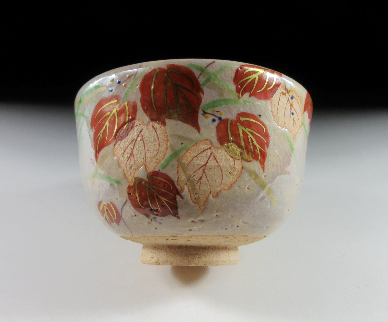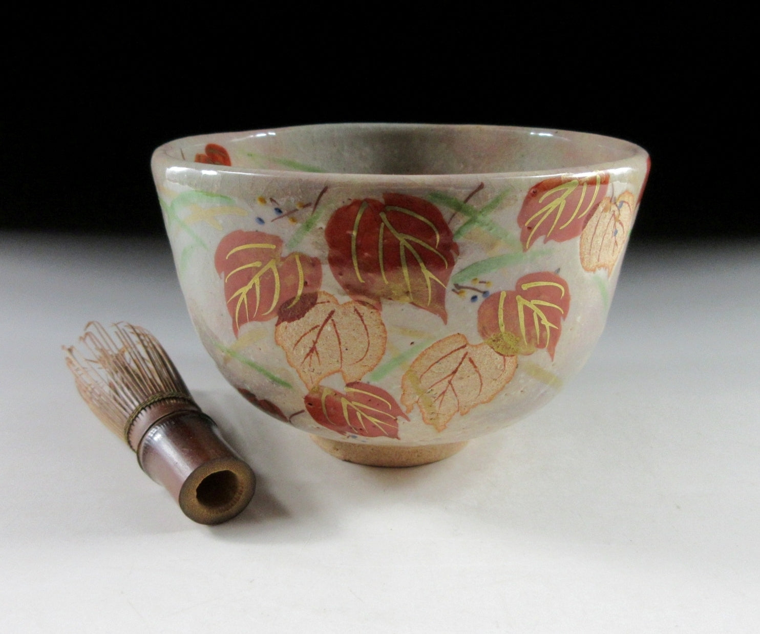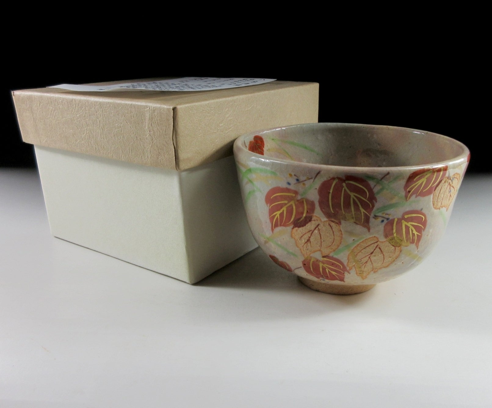 This listing is for a seasonal Kyo-ware chawan made by noted potter, Yagi Kaiho. It is wheel-thrown and the front is decorated with a hand-painted with an Ogata Kenzan style depiction of fiery red autumn ivy trimmed with green and gold overglaze. Some of Ogata Kenzan’s (1663-1743) most beautiful pieces were his scenes from nature hand-painted onto ceramics and scrolls. This piece is a fitting tribute, and like Kenzan’s work perfect in its simplicity. The stamp of the potter can be found on the bottom, and it comes with a paper storage box. It also comes with a Japanese language profile paper about the potter. *PLEASE NOTE THAT THE CHASEN TEA WHISK AND CHASHAKU TEA SCOOP ARE NOT INCLUDED.