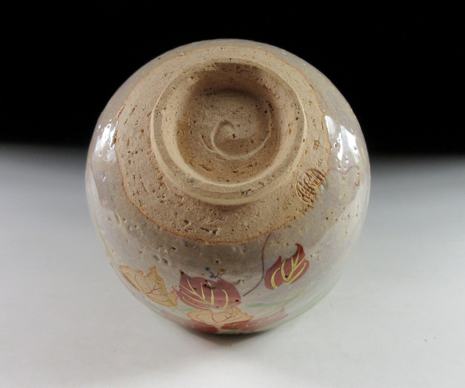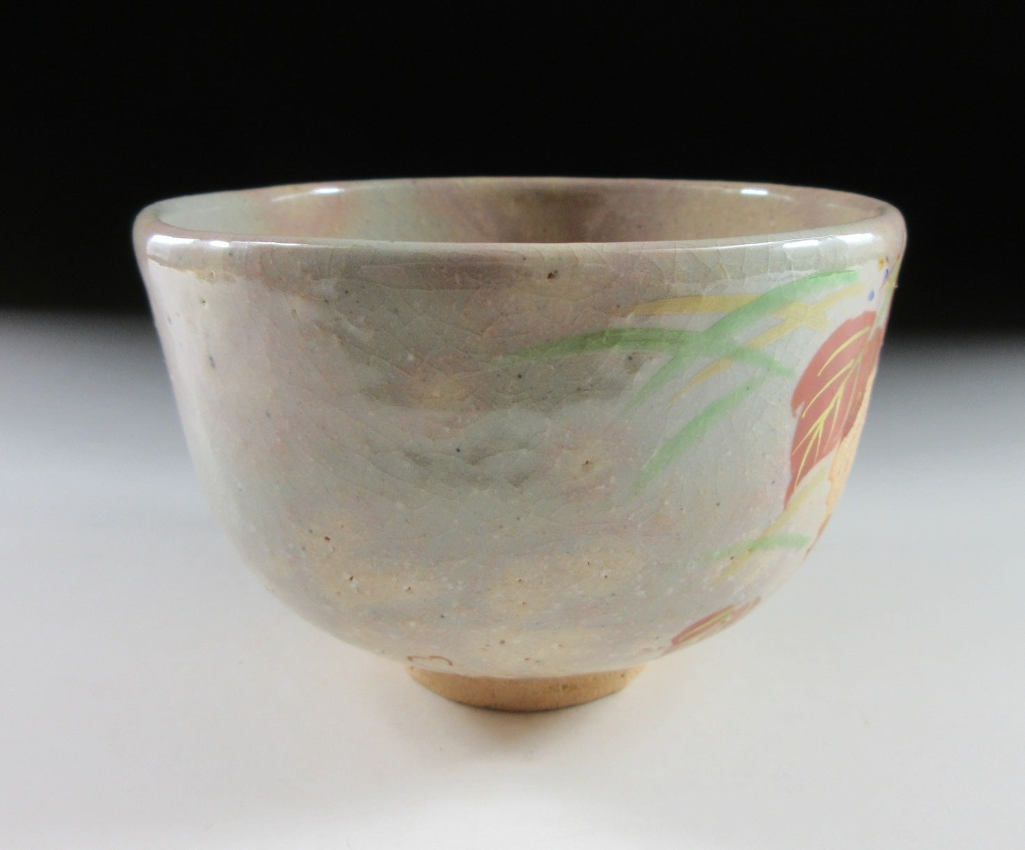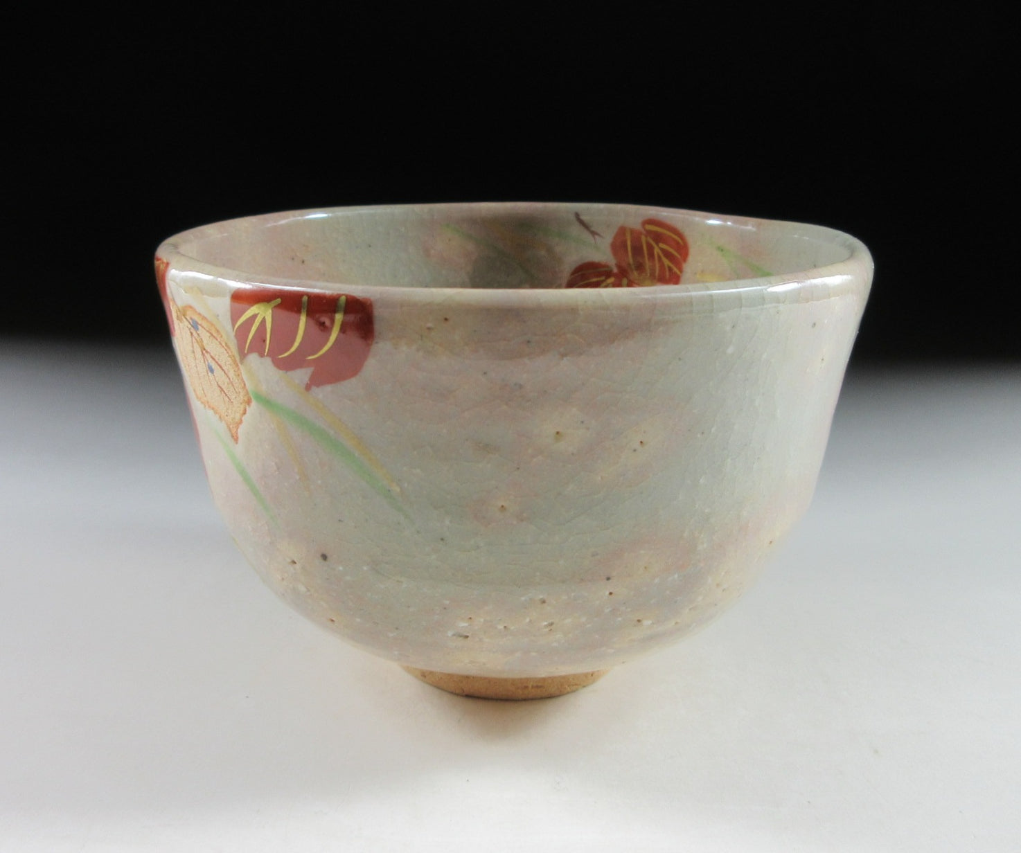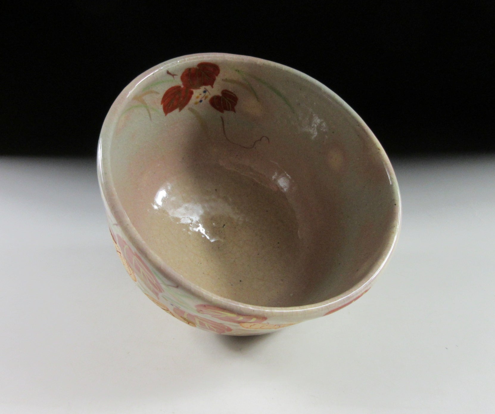 This listing is for a seasonal Kyo-ware chawan made by noted potter, Yagi Kaiho. It is wheel-thrown and the front is decorated with a hand-painted with an Ogata Kenzan style depiction of fiery red autumn ivy trimmed with green and gold overglaze. Some of Ogata Kenzan’s (1663-1743) most beautiful pieces were his scenes from nature hand-painted onto ceramics and scrolls. This piece is a fitting tribute, and like Kenzan’s work perfect in its simplicity. The stamp of the potter can be found on the bottom, and it comes with a paper storage box. It also comes with a Japanese language profile paper about the potter. *PLEASE NOTE THAT THE CHASEN TEA WHISK AND CHASHAKU TEA SCOOP ARE NOT INCLUDED.