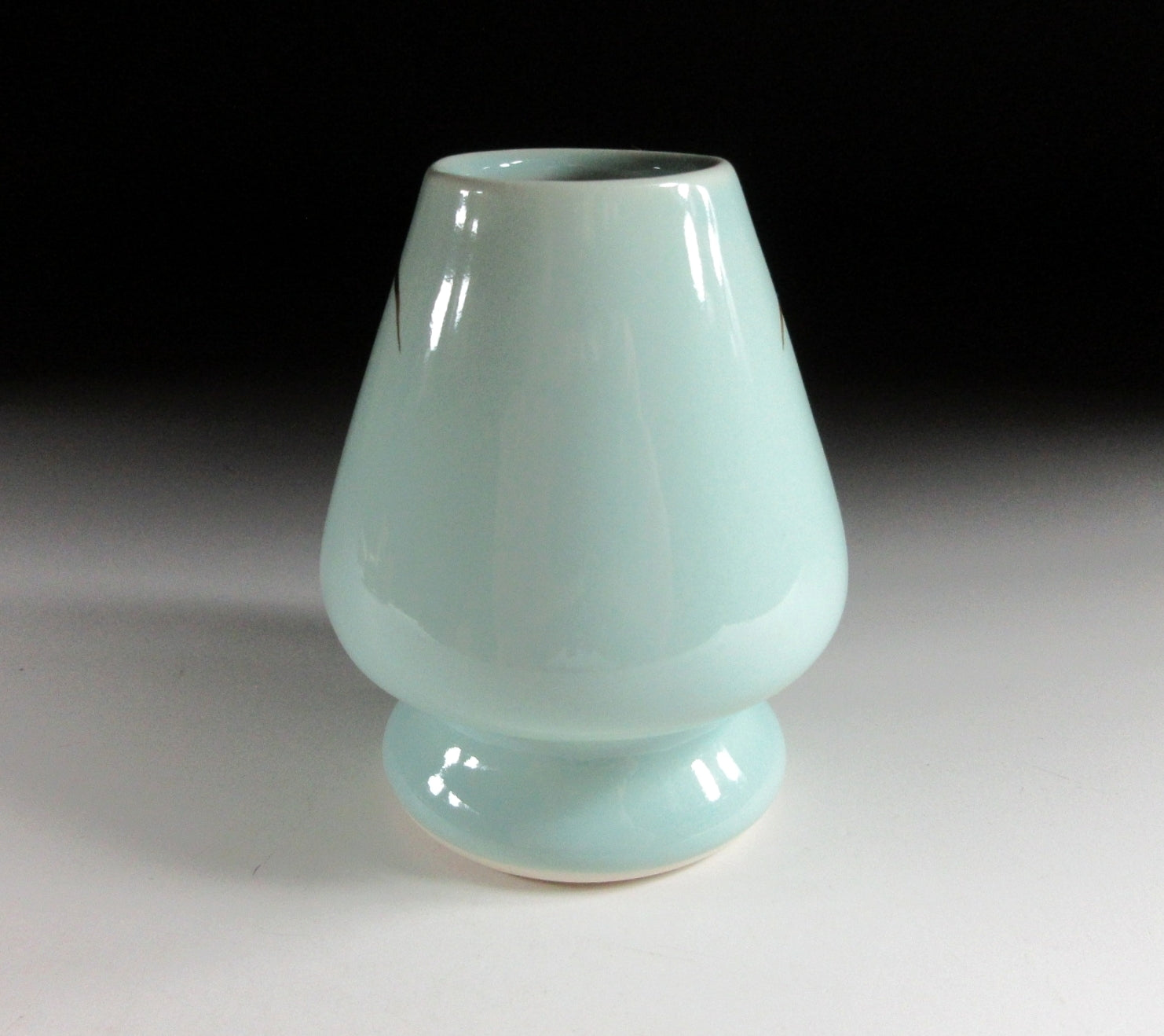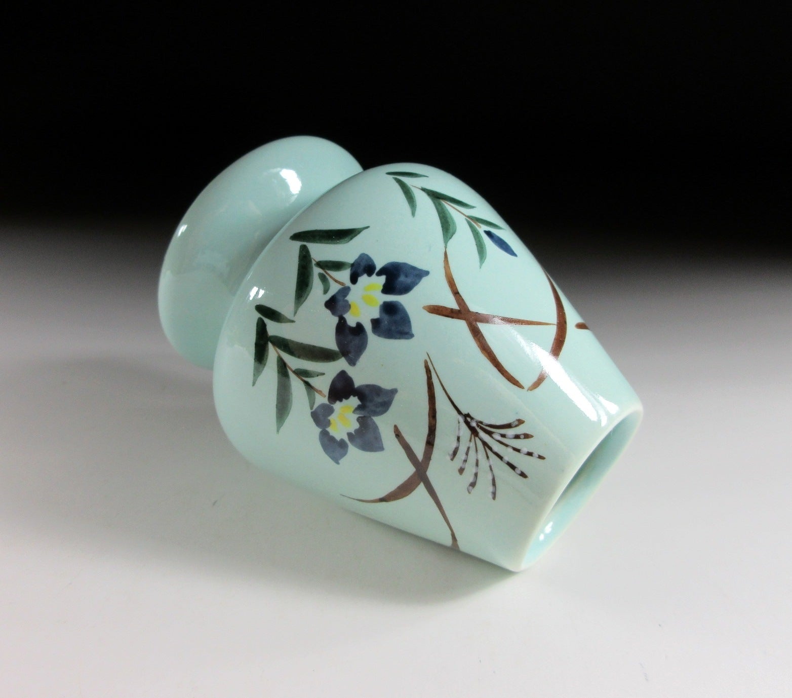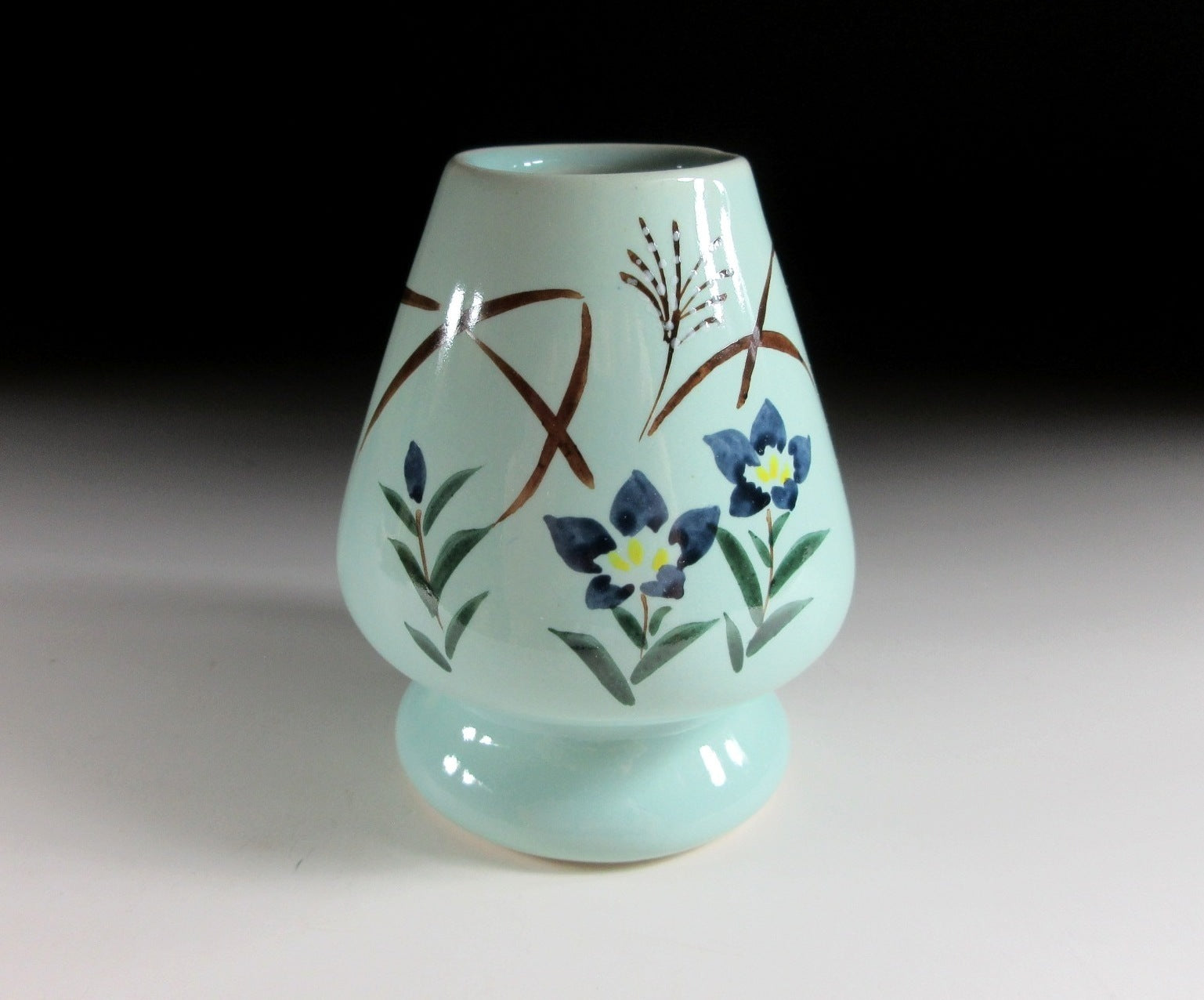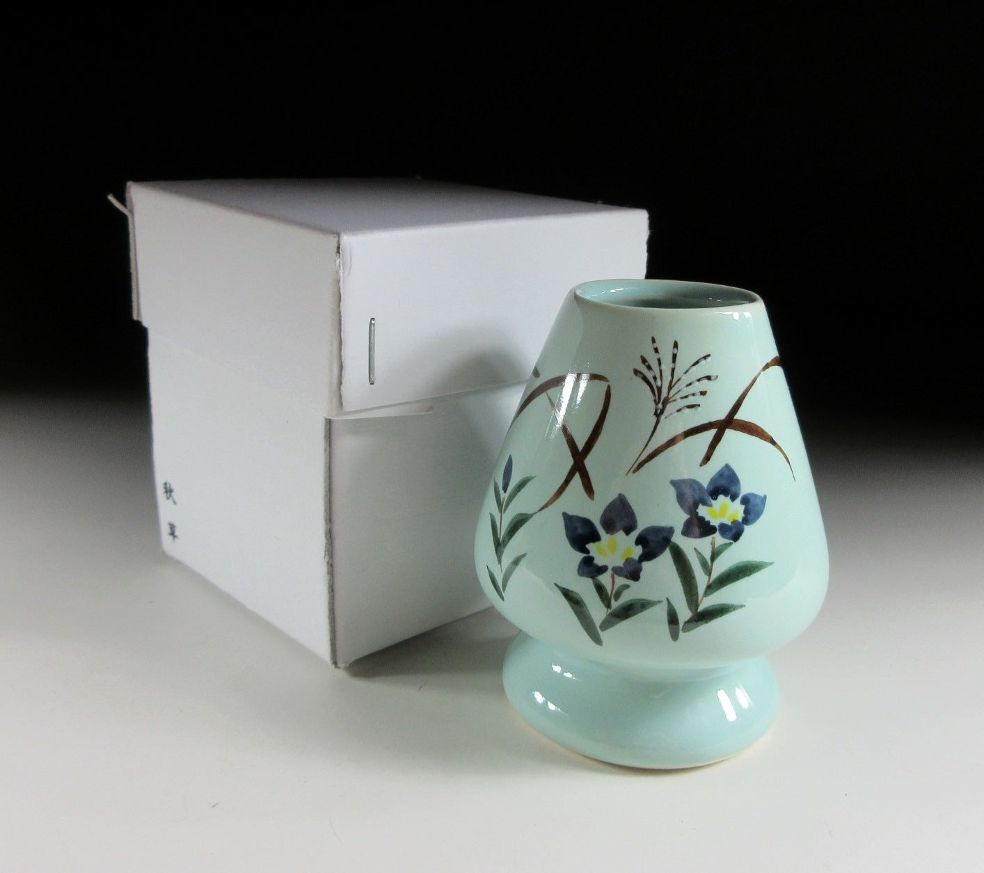 This listing is for a hand-painted chasen tea whisk shaper made by noted potter, Yagi Kaiho. The shaper’s job is to help your chasen maintain its shape whilst drying. After the tea whisk is dried it should be stored in a chasen zutsu. Care should be taken when placing your chasen on the shaper. Not placing the tines properly may result in broken ends. The shaper in this listing has a nice smooth surface which won’t snag the tines on your tea whisk, and it features hand-painted depictions of Japanese bellflowers. Bell flowers are one of the traditional seven flowers of autumn often depicted in haiku, kimono and scrolls. Ogata Kenzan, one of the greatest potters of the Tokugawa era, used this motif to decorate tea ware and tableware, and it’s still a very popular style of decoration today.