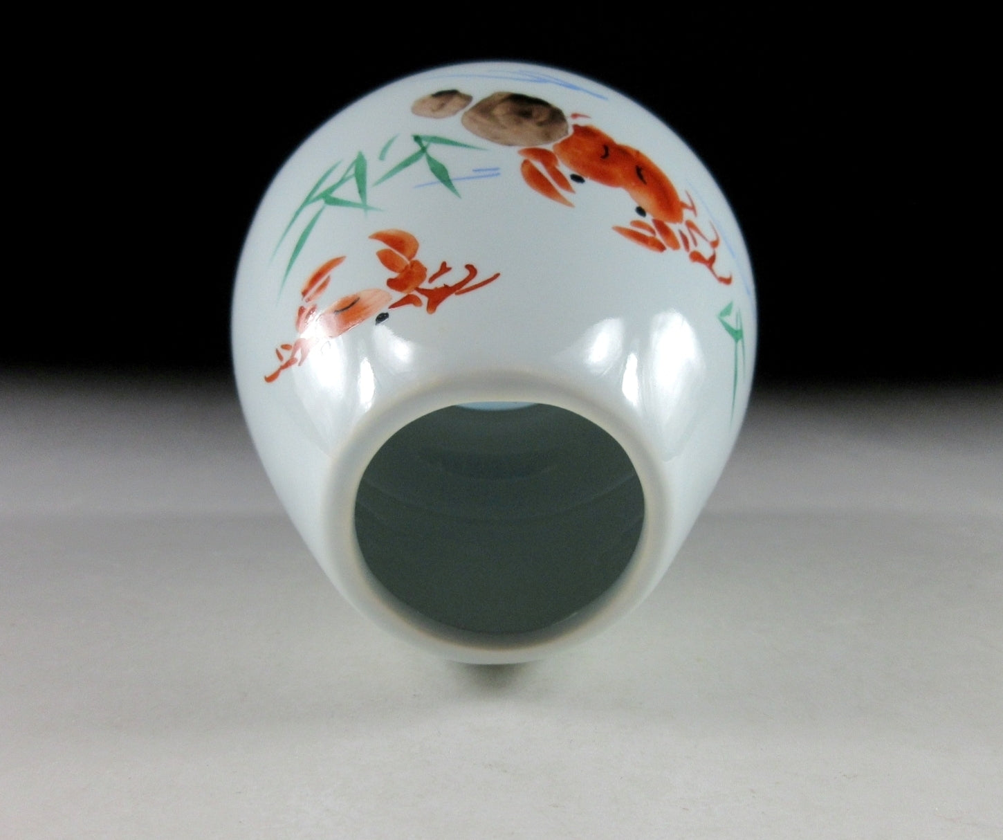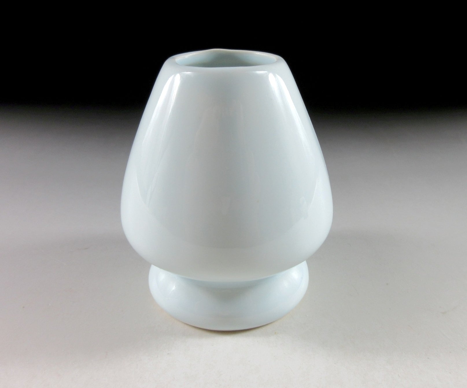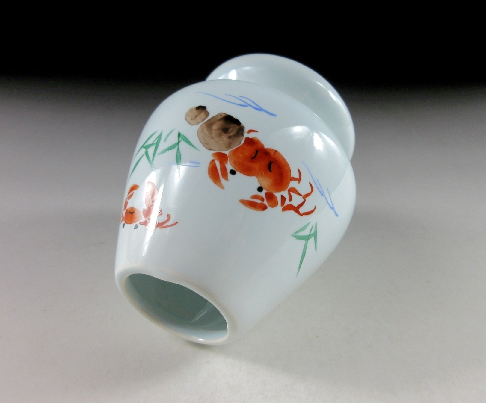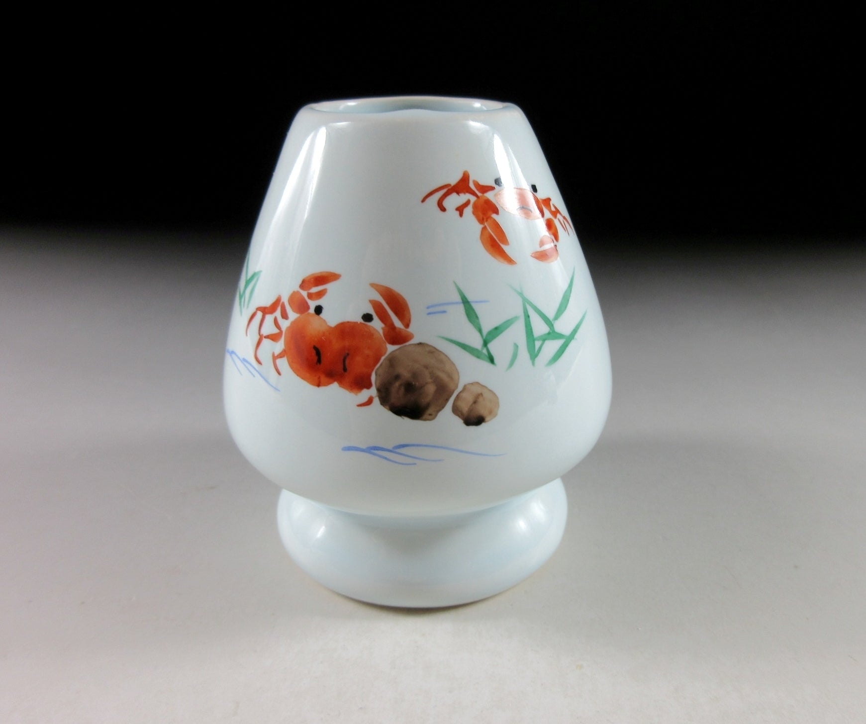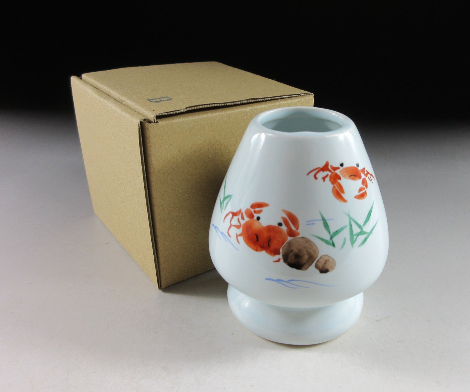 This listing is for a hand-painted chasen tea whisk shaper made by noted potter, Yagi Kaiho. The shaper’s job is to help your chasen maintain its shape whilst drying. After the tea whisk is dried it should be stored in a chasen zutsu. Care should be taken when placing your chasen on the shaper. Not placing the tines properly may result in broken ends. The shaper in this listing has a nice smooth surface that won’t snag the tines of your tea whisk, and the front is decorated with two red crabs. According to Japanese folklore, crabs are believed to embody the souls of fallen samurai and they’re a symbol of power and strength. This item comes with a paper storage box.