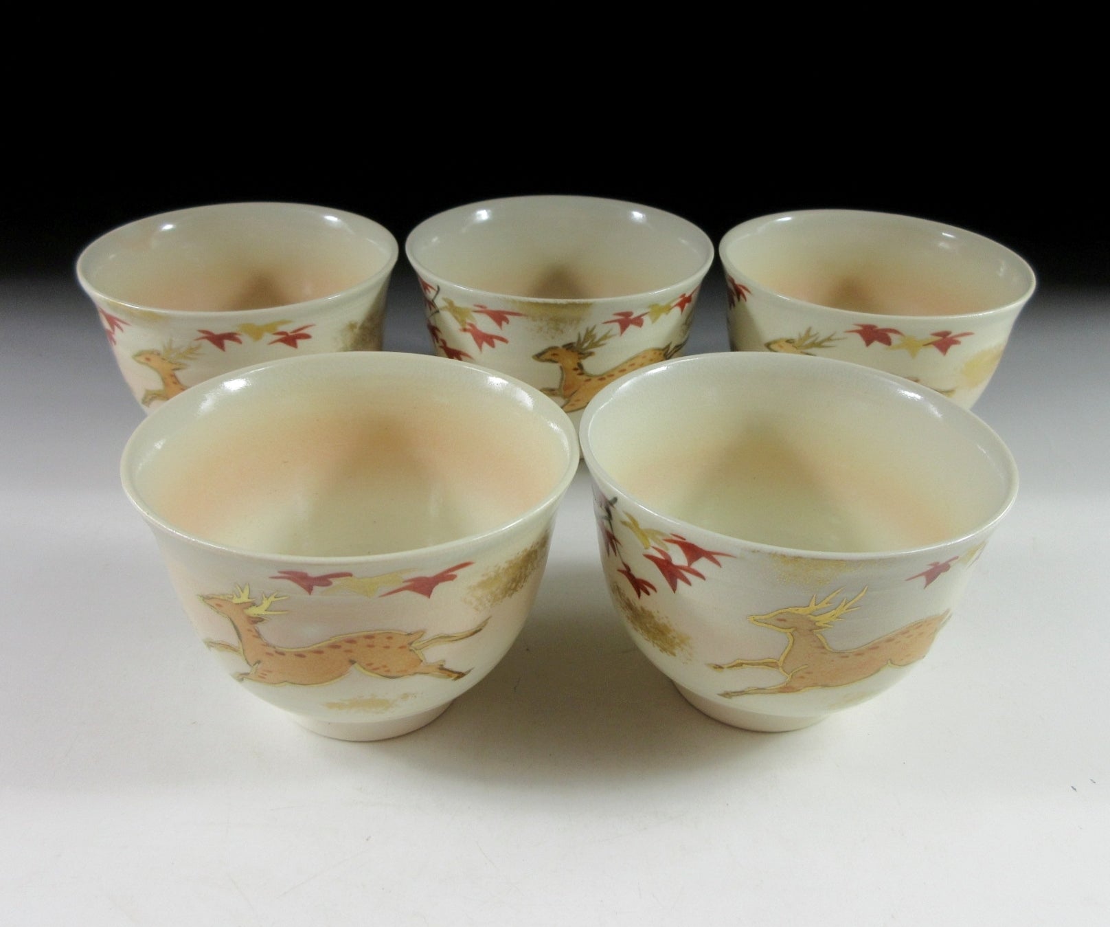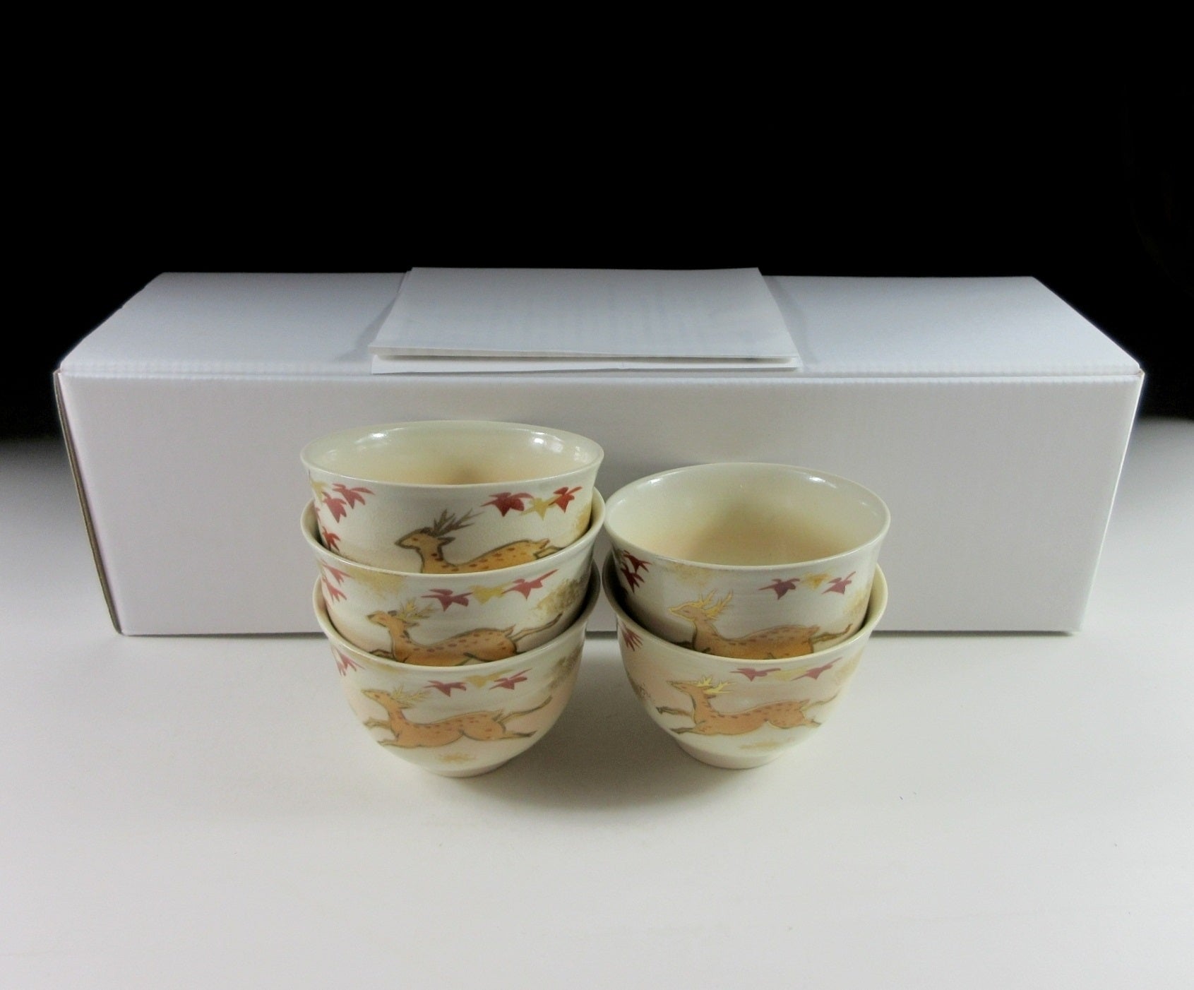 This listing is for a set of five Kyo-ware sencha teacups made by noted potter, Yagi Kaiho. They are wheel-thrown and the front of each cup is decorated with deer and red and gold momiji leaves. This set is ideal for serving sencha or bancha tea, and they are new and unused. The stamp of the potter can be found on the bottom of each cup, and they come with a paper storage box. The cups also come with a Japanese language profile paper about the potter.