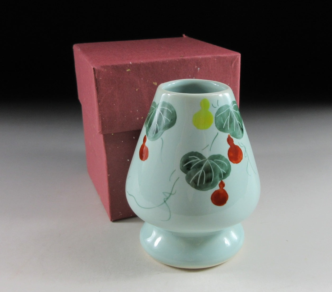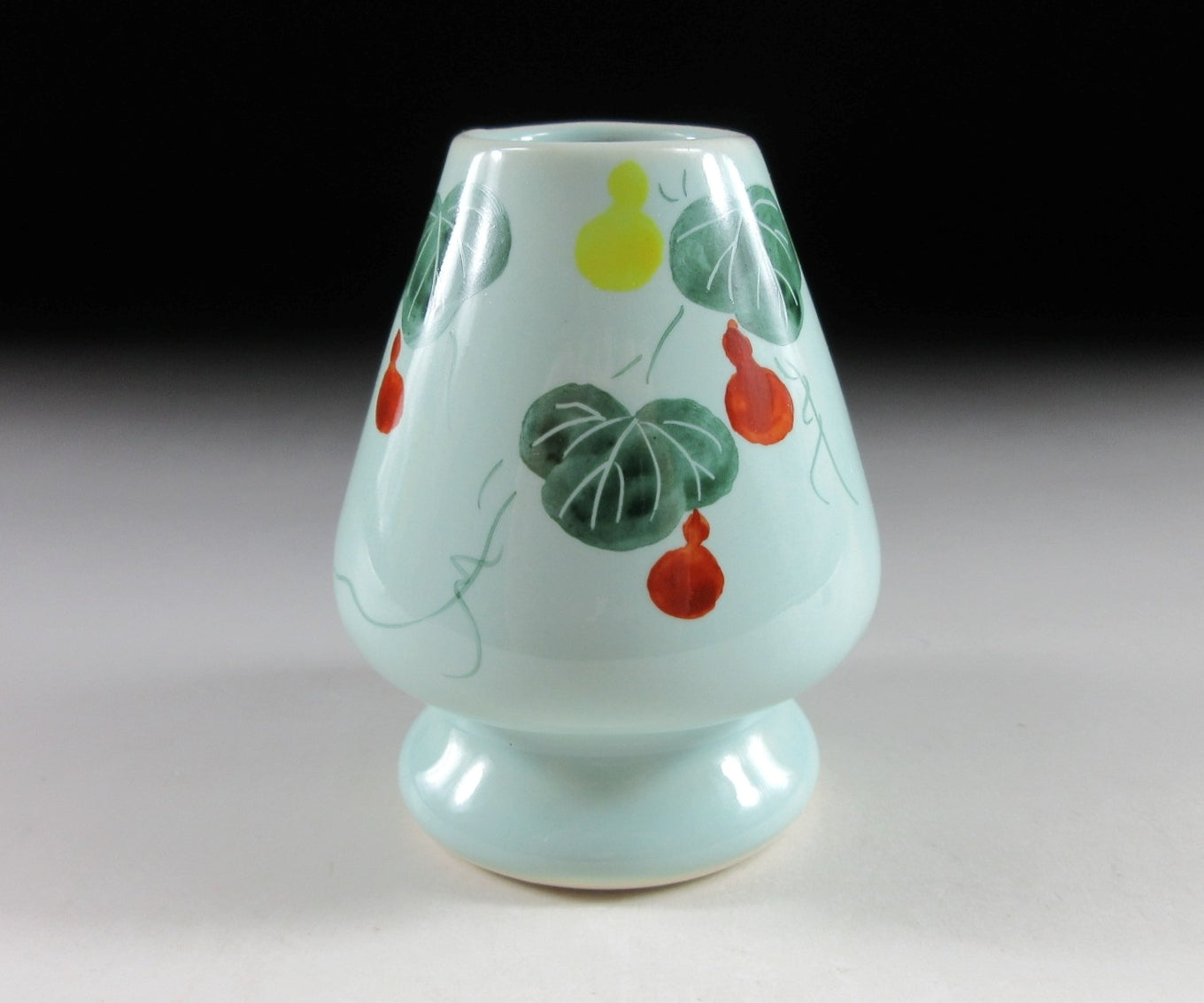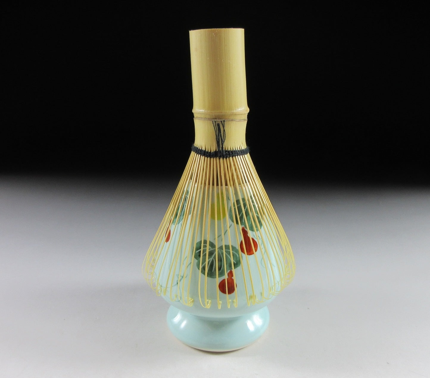 This listing is for a hand-painted chasen tea whisk shaper made by noted potter, Yagi Kaiho. The shaper’s job is to help your chasen maintain its shape whilst drying. After the tea whisk is dried it should be stored in a chasen zutsu. Care should be taken when placing your chasen on the shaper. Not placing the tines properly may result in broken ends. The shaper in this listing has a nice smooth surface which won’t snag the tines on your tea whisk, and it features hand-painted depictions of hyotan (gourds) over a pale blue base. Hyotan are an auspicious symbol linked to longevity and fertility. They are also thought to symbolize happiness and success, thus making them a popular motif during New Year.