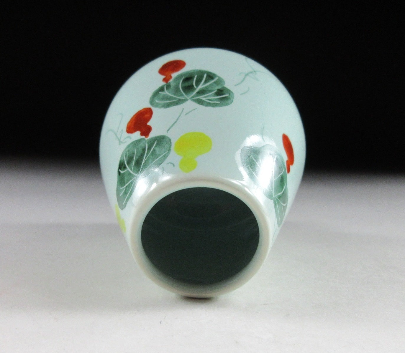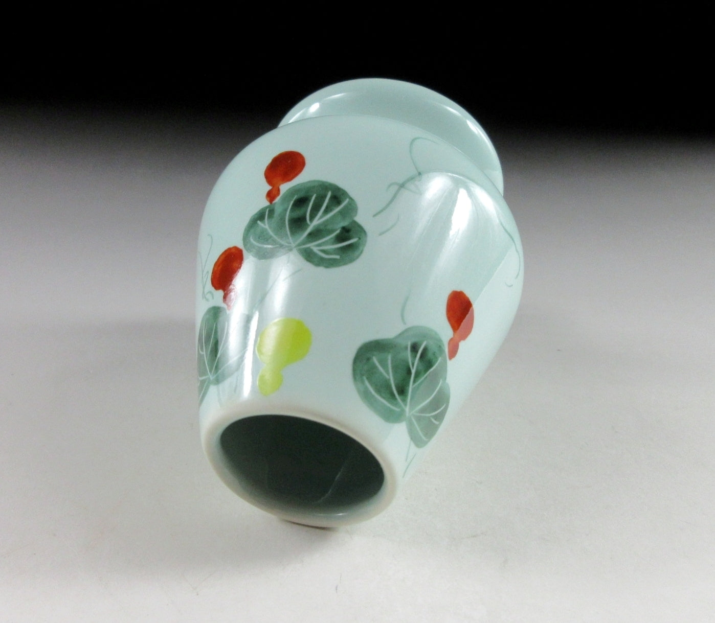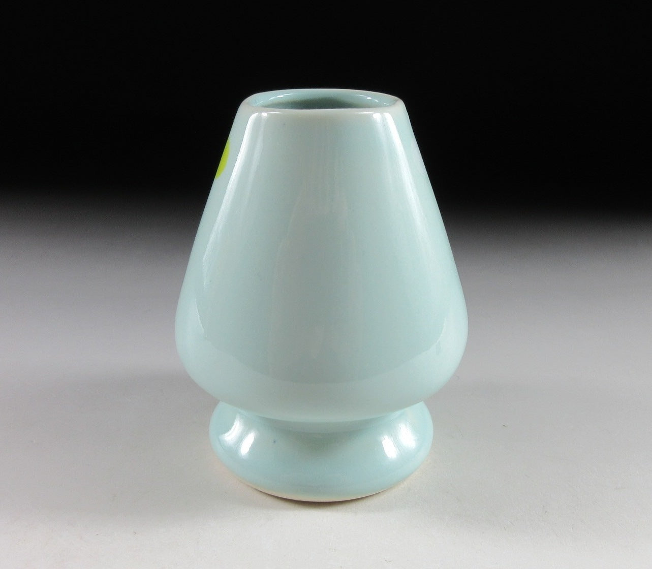 This listing is for a hand-painted chasen tea whisk shaper made by noted potter, Yagi Kaiho. The shaper’s job is to help your chasen maintain its shape whilst drying. After the tea whisk is dried it should be stored in a chasen zutsu. Care should be taken when placing your chasen on the shaper. Not placing the tines properly may result in broken ends. The shaper in this listing has a nice smooth surface which won’t snag the tines on your tea whisk, and it features hand-painted depictions of hyotan (gourds) over a pale blue base. Hyotan are an auspicious symbol linked to longevity and fertility. They are also thought to symbolize happiness and success, thus making them a popular motif during New Year.