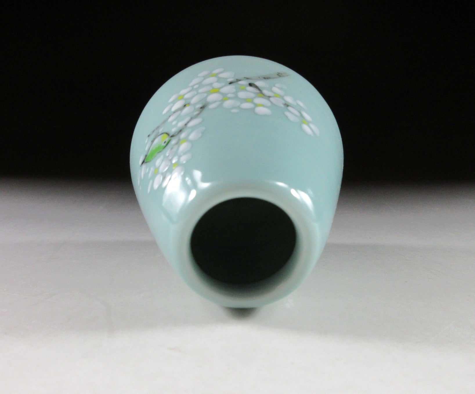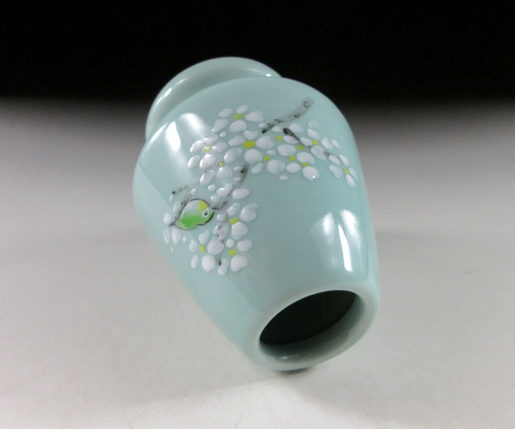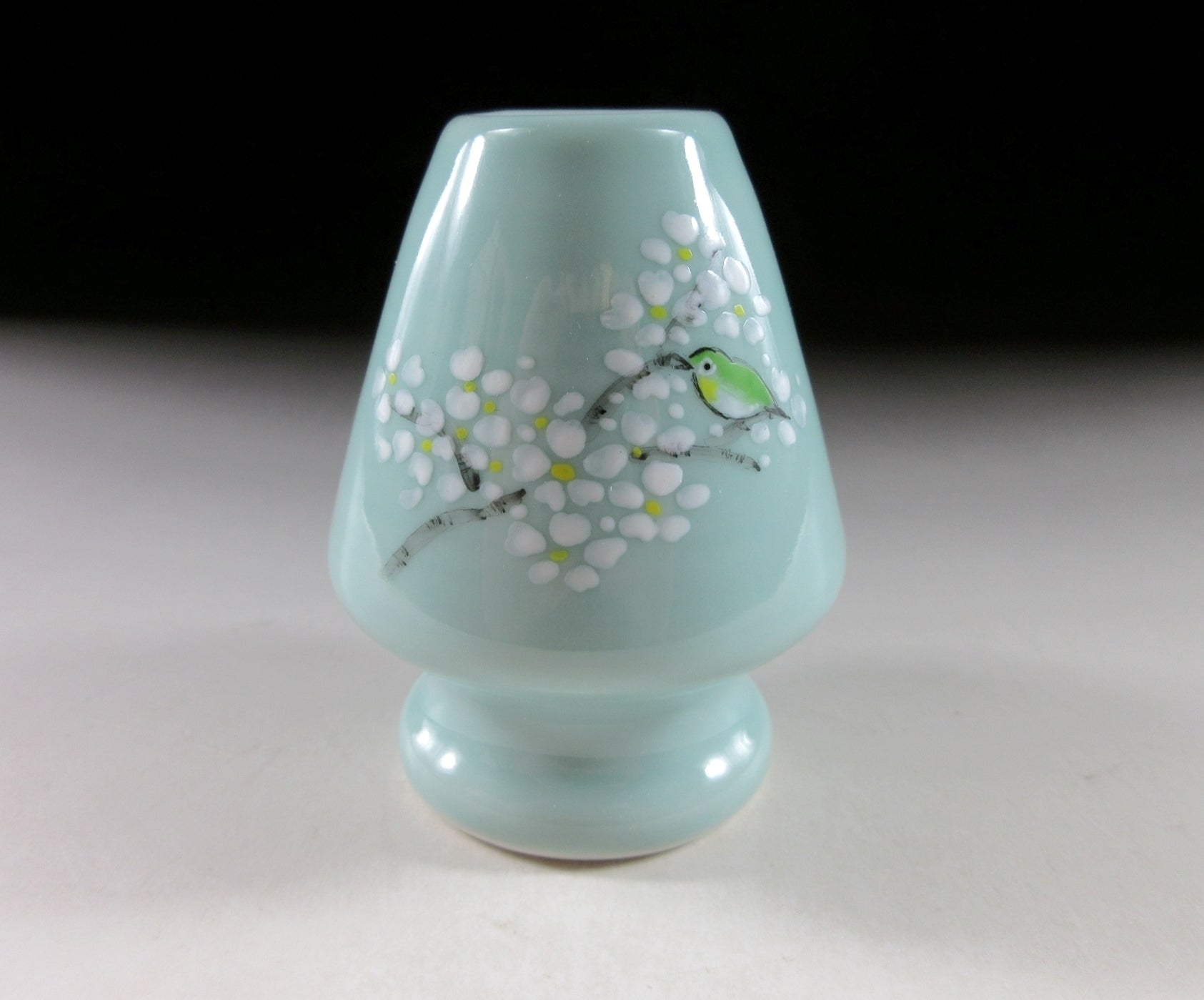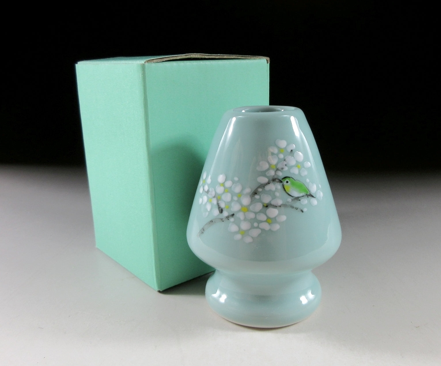 This listing is for a hand-painted chasen tea whisk shaper made by noted potter, Yagi Kaiho. The shaper’s job is to help your chasen maintain its shape whilst drying. After the tea whisk is dried it should be stored in a chasen zutsu. Care should be taken when placing your chasen on the shaper. Not placing the tines properly may result in broken ends. The shaper in this listing has a nice smooth surface that won’t snag the tines on your tea whisk, and it features a hand-painted depiction of a Japanese white-eye hunting for nectar among cherry blossoms. These small birds tend to gather around plum and cherry blossoms, so they are often associated with the arrival of spring. This item comes with a paper storage box.