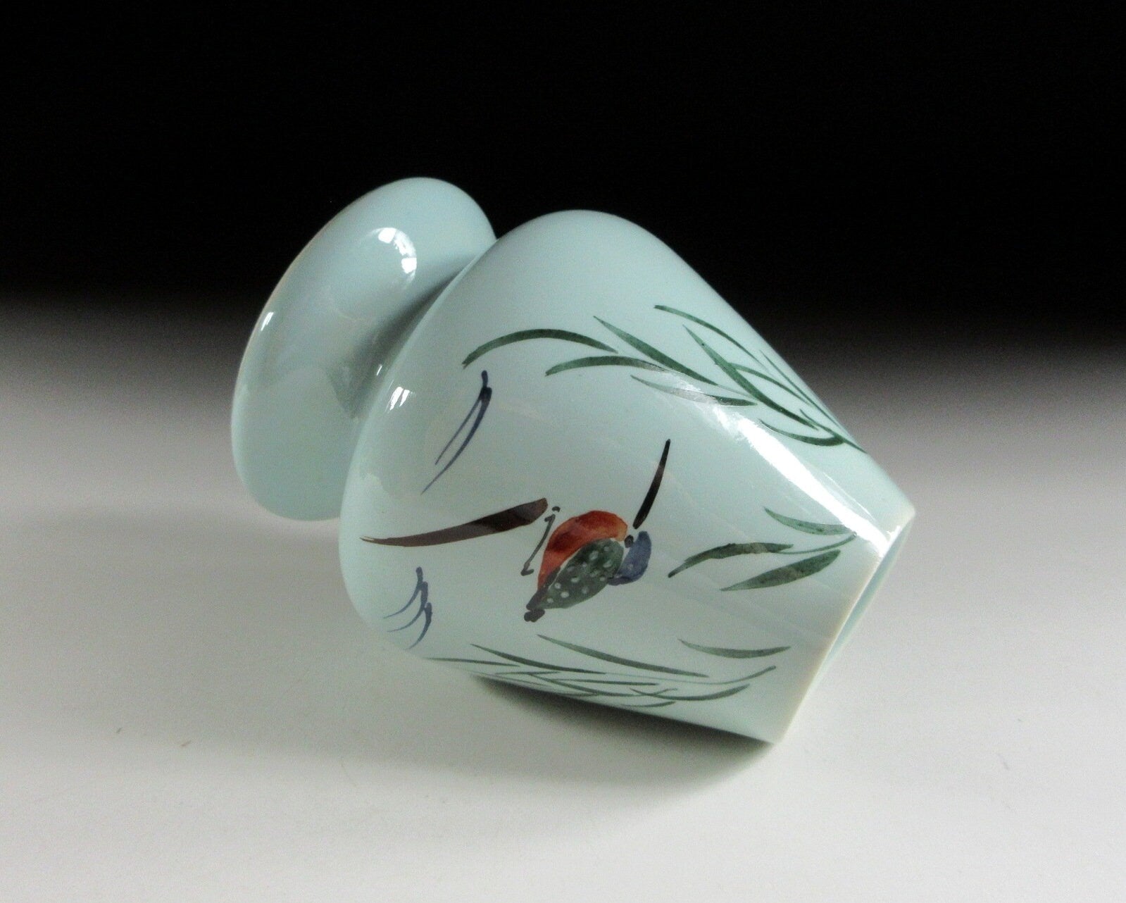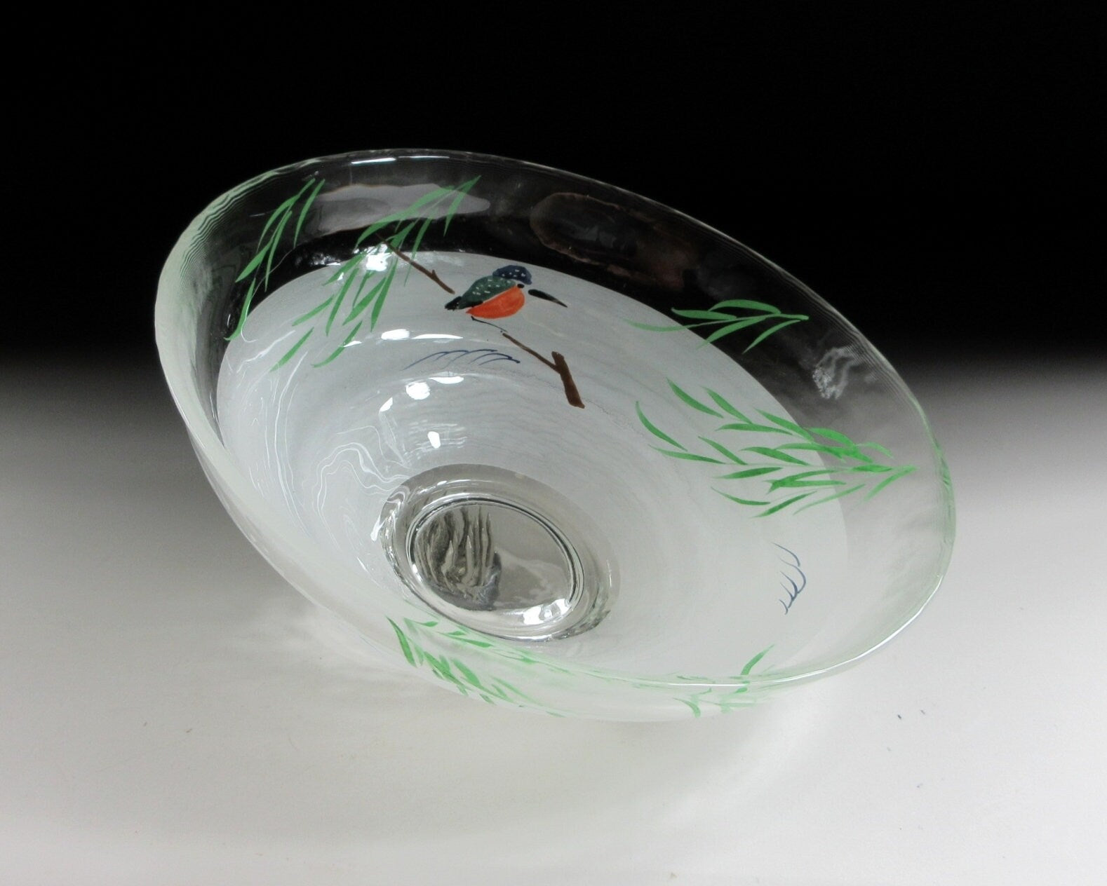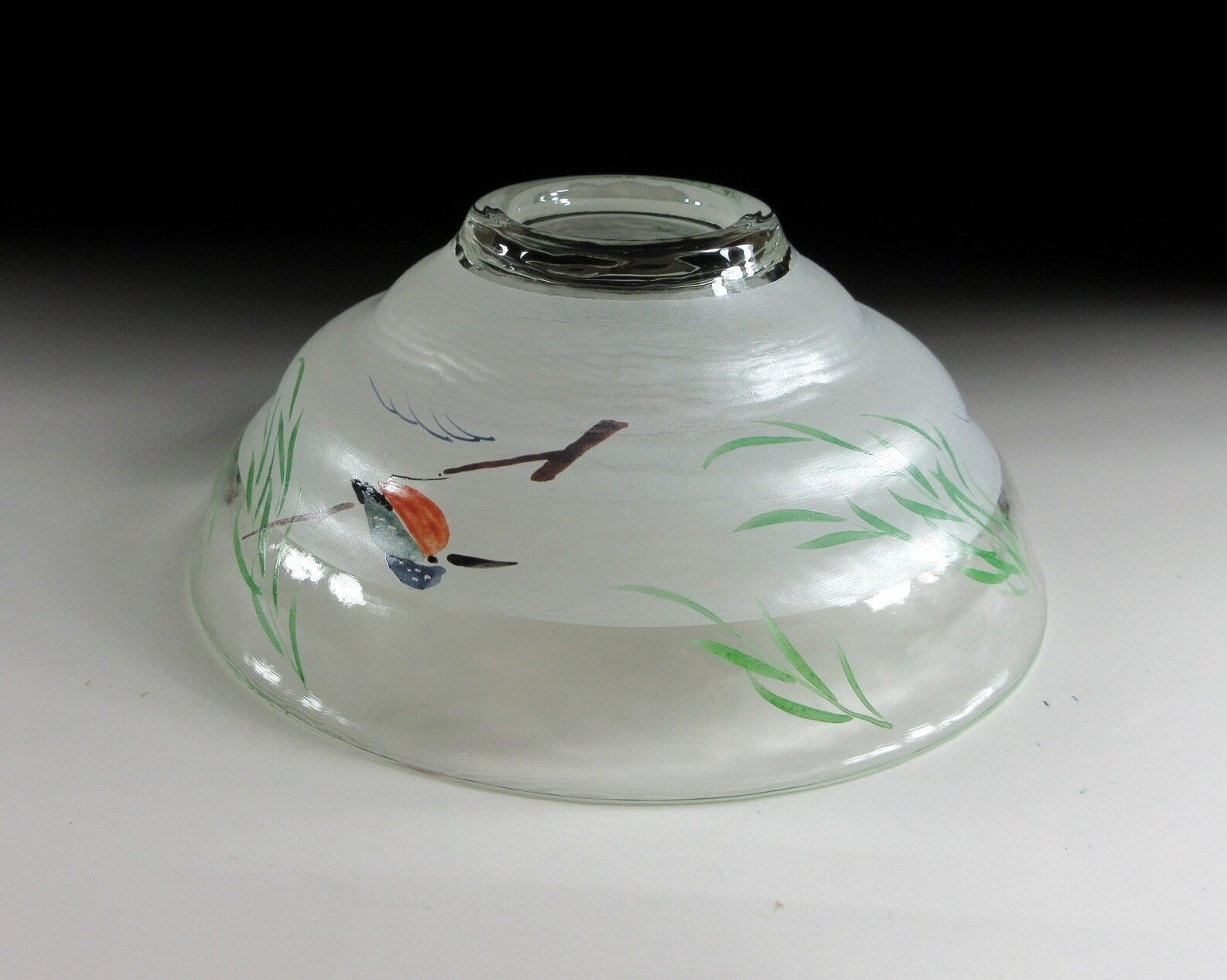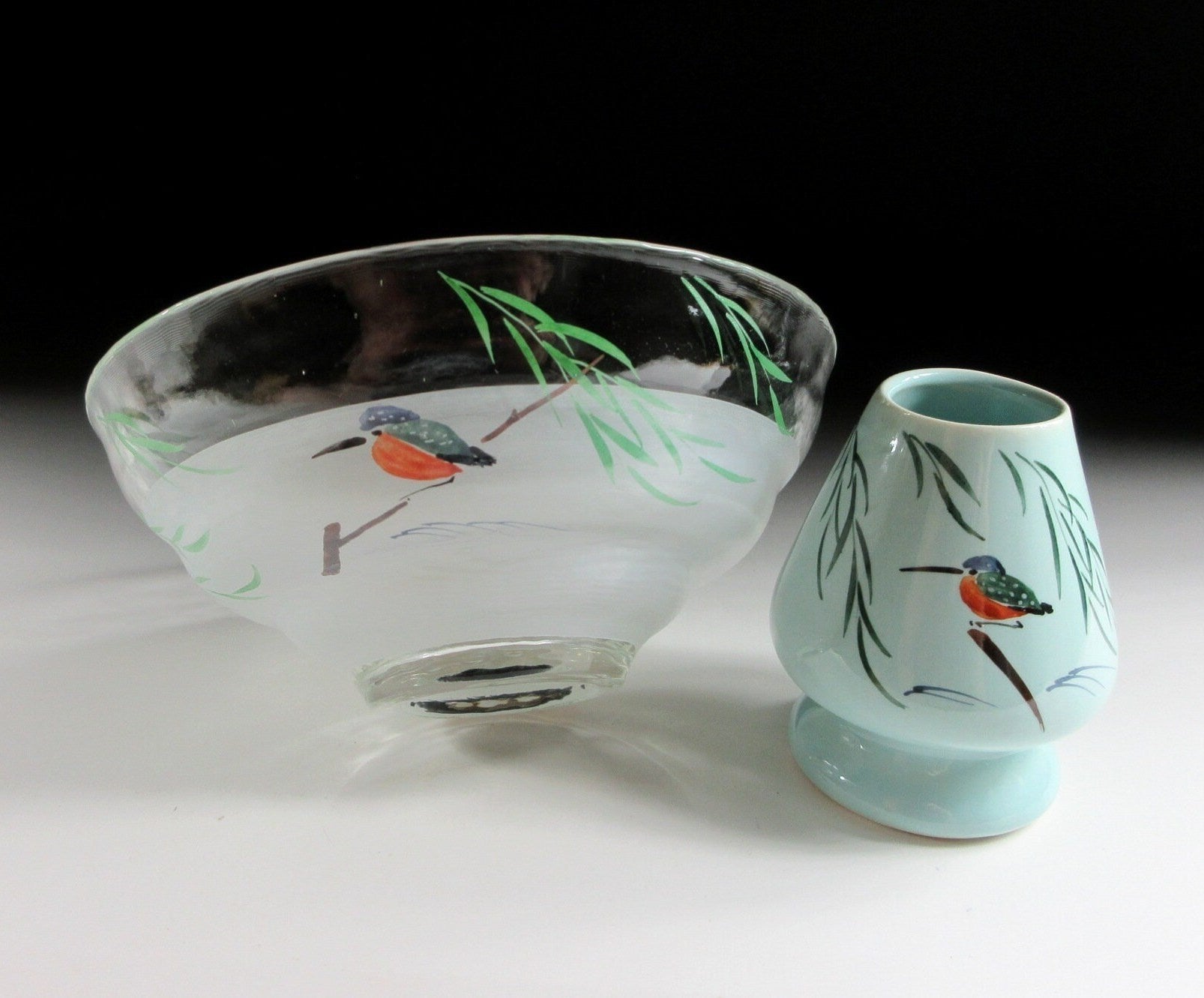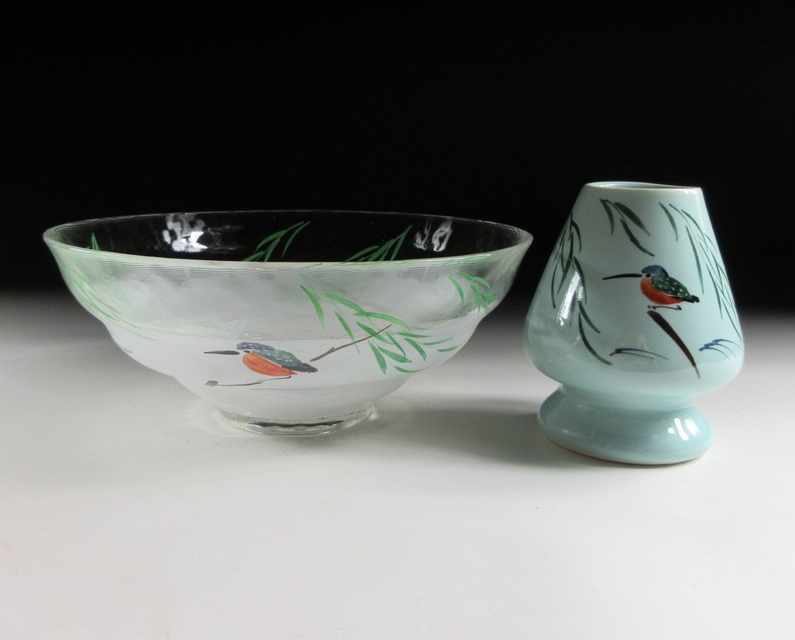 This listing is for a hand-painted glass hira chawan and matching chasen tea whisk shaper made by noted potter, Yagi Kaiho. The chawan is made from heat resistant glass and is the flat hira type used during the summer season. Hira chawan are shallow bowls with low sides designed to cool tea down faster. It is decorated with a hand-painted depiction of a ‘kawasemi’ (kingfisher). Kingfishers are a charming sight in summer as they dart around shallow streams and delight onlookers with their beautiful plumage. Kingfishers are thought to be an auspicious symbol for marital happiness, as well as an indicator of good water quality. This piece also comes with a ceramic chasen shaper. The shaper’s job is to help your chasen maintain its shape whilst drying. After the tea whisk is dried it should be stored in a chasen zutsu. Care should be taken when placing your chasen on the shaper. Not placing the tines properly may result in broken ends. The shaper in this listing has a nice smooth surface and features the same kingfisher design as the chawan.