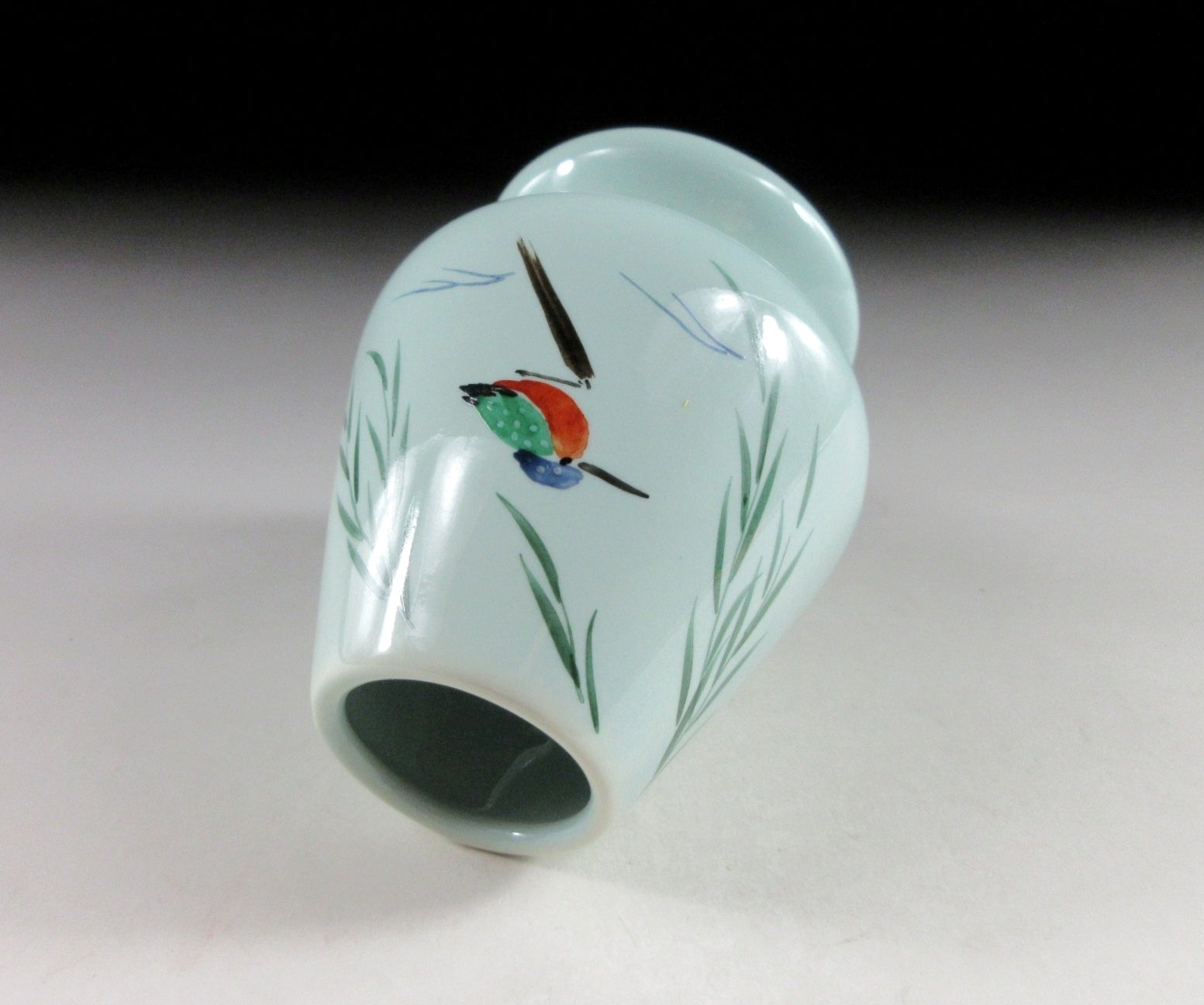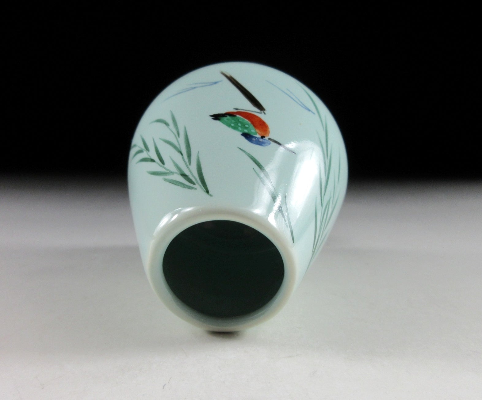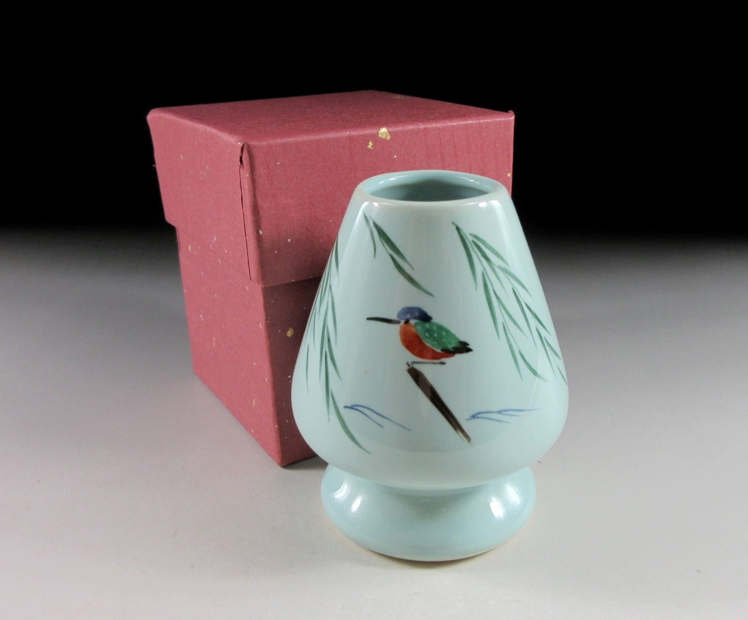 This listing is for a hand-painted chasen tea whisk shaper made by noted potter, Yagi Kaiho. The shaper’s job is to help your chasen maintain its shape whilst drying. After the tea whisk is dried it should be stored in a chasen zutsu. Care should be taken when placing your chasen on the shaper. Not placing the tines properly may result in broken ends. The shaper in this listing has a nice smooth surface which won’t snag the tines on your tea whisk, and it features a hand-painted depiction of a ‘kawasemi’ (kingfisher). Kingfishers are a charming sight in summer as they dart around shallow streams and delight onlookers with their beautiful plumage. Kingfishers are thought to be an auspicious symbol for marital happiness, as well as an indicator of good water quality.