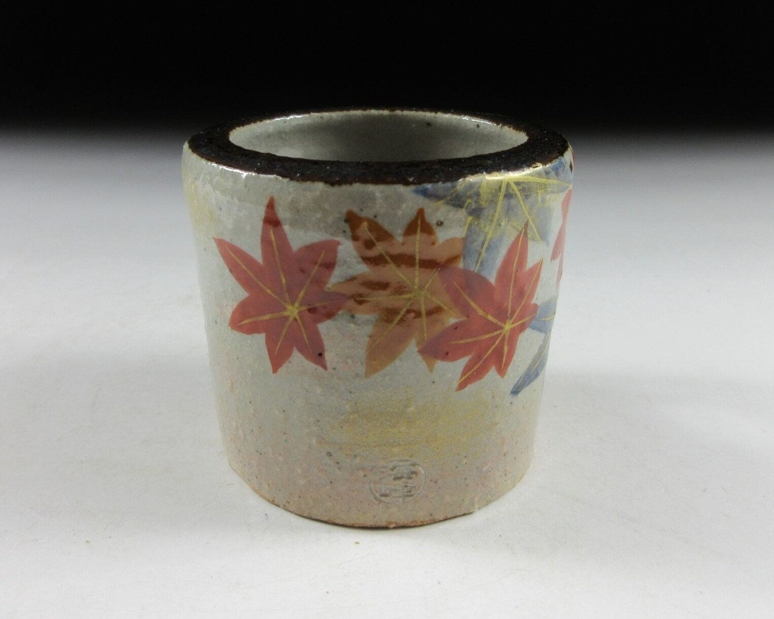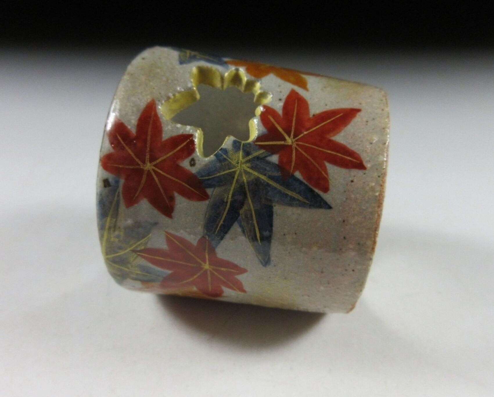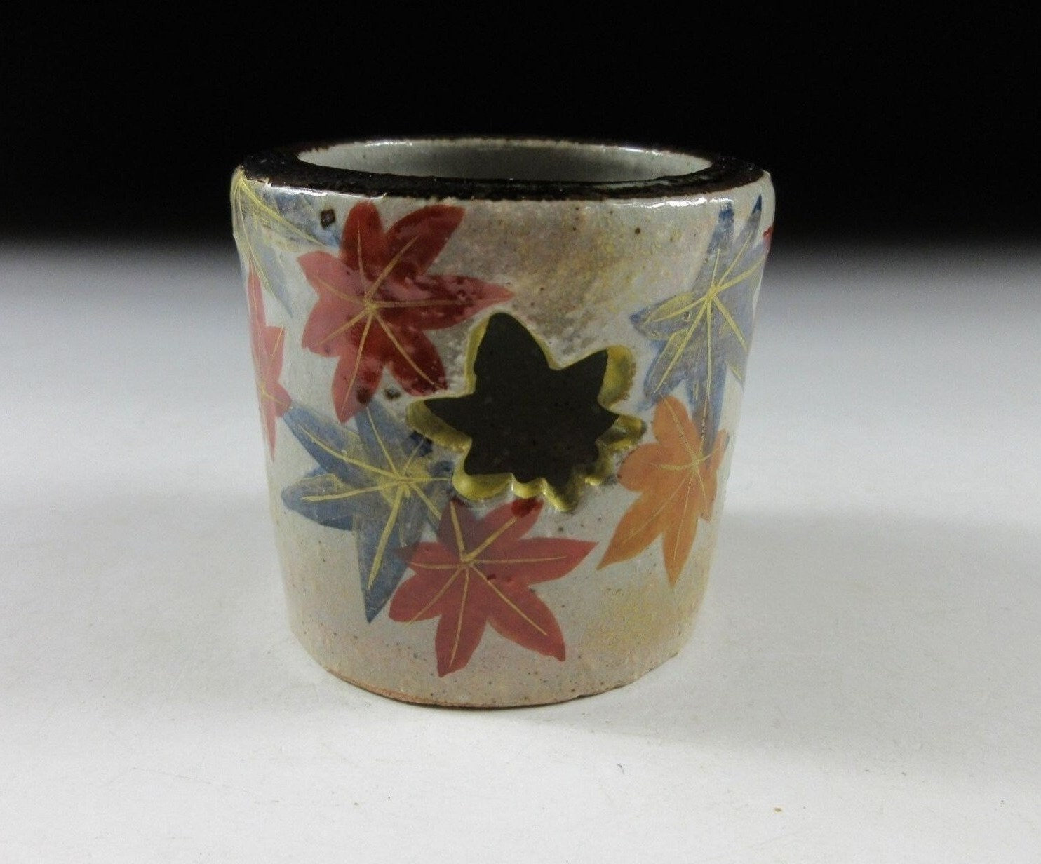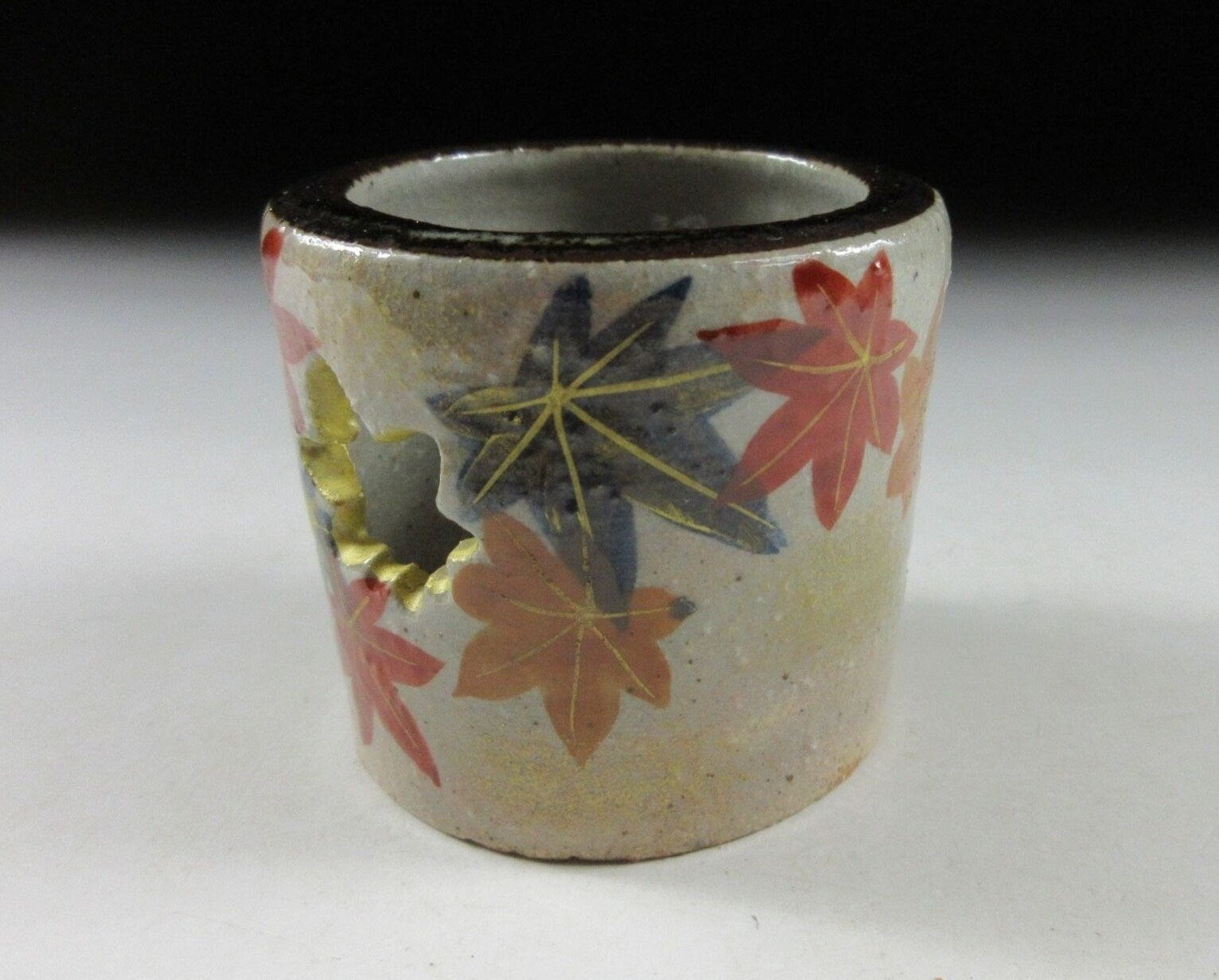 This listing is for a Kyo-ware futaoki made around 20 years ago by noted potter, Yagi Kaiho. A futaoki functions as a lid rest during the tea ceremony. The lid of the kama is placed on the futaoki when hot water needs to be drawn from the kettle. The bamboo water ladle rests there up until the lid of the kama is removed. The futaoki featured in this listing is wheel-thrown and decorated with hand-painted momiji leaves over a transparent white glazed background. There’s also a momiji leaf carved out of the front trimmed with gold glaze. The stamp of the potter can be found near the base, and it comes with its original paper storage box. It also comes with a Japanese language profile about the potter.