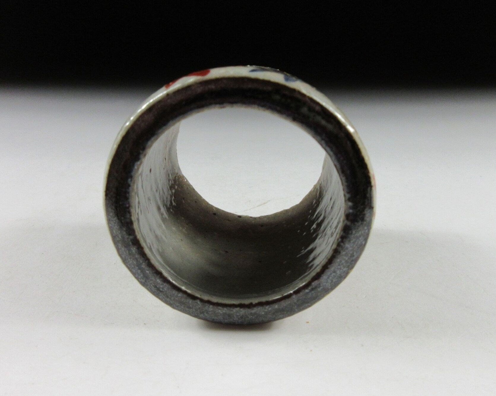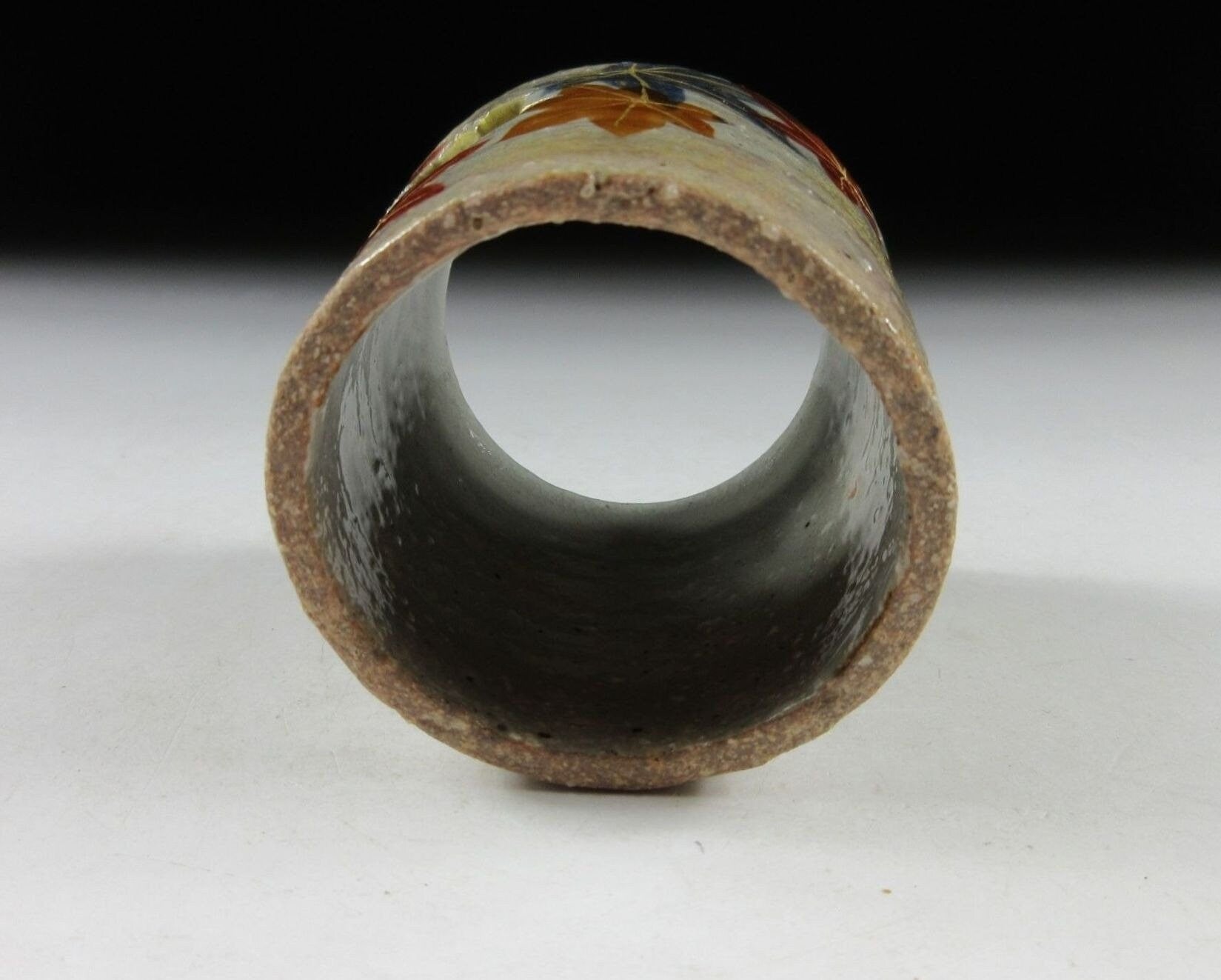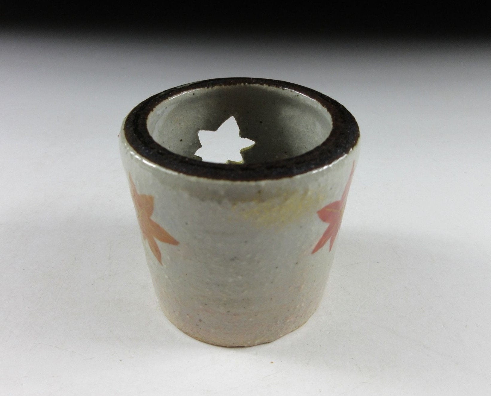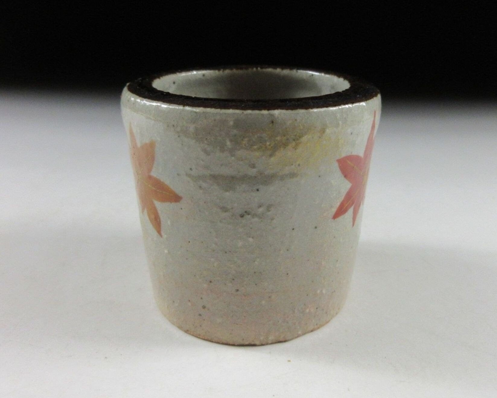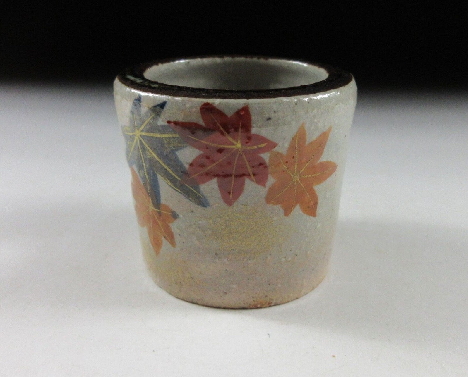 This listing is for a Kyo-ware futaoki made around 20 years ago by noted potter, Yagi Kaiho. A futaoki functions as a lid rest during the tea ceremony. The lid of the kama is placed on the futaoki when hot water needs to be drawn from the kettle. The bamboo water ladle rests there up until the lid of the kama is removed. The futaoki featured in this listing is wheel-thrown and decorated with hand-painted momiji leaves over a transparent white glazed background. There’s also a momiji leaf carved out of the front trimmed with gold glaze. The stamp of the potter can be found near the base, and it comes with its original paper storage box. It also comes with a Japanese language profile about the potter.