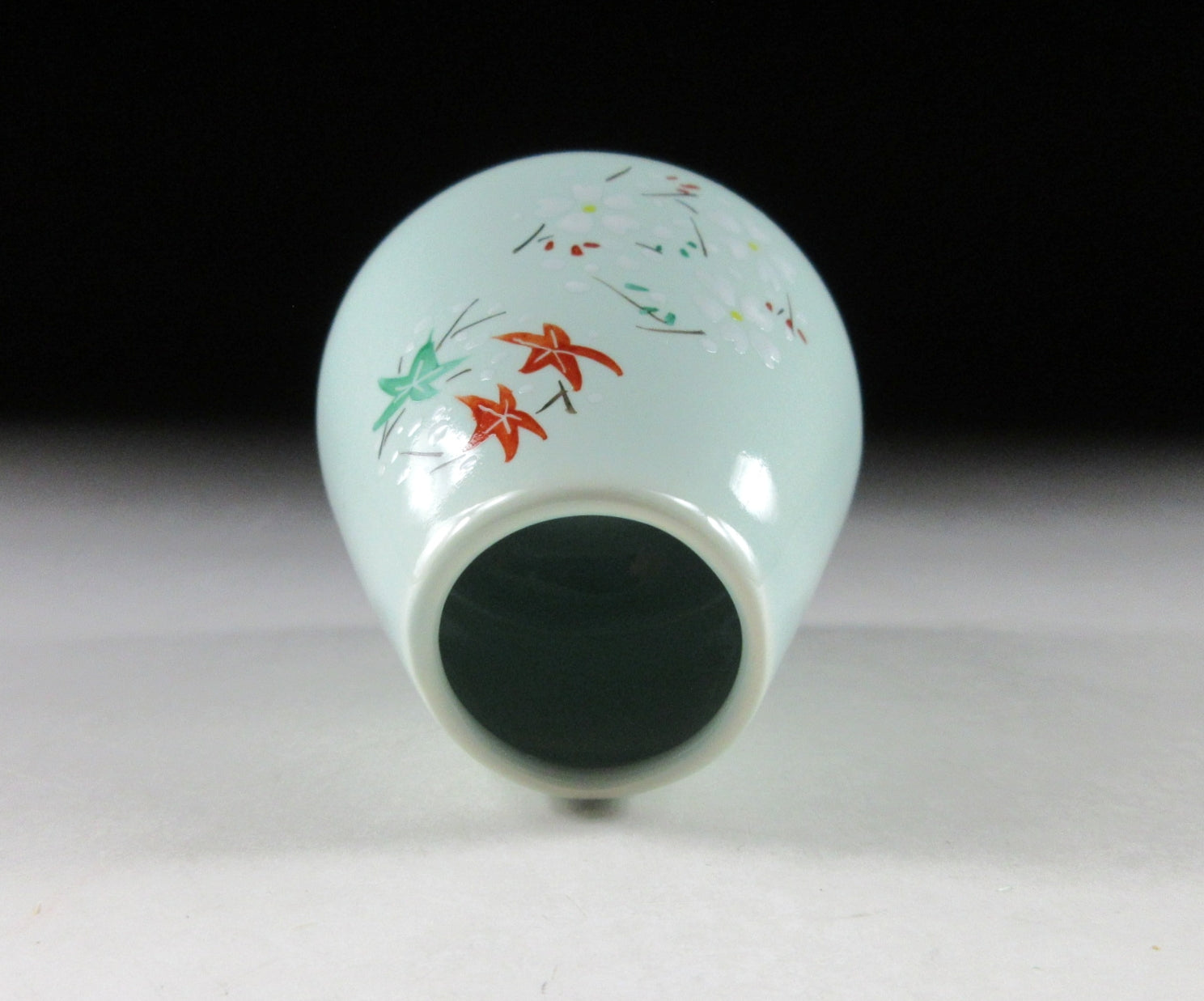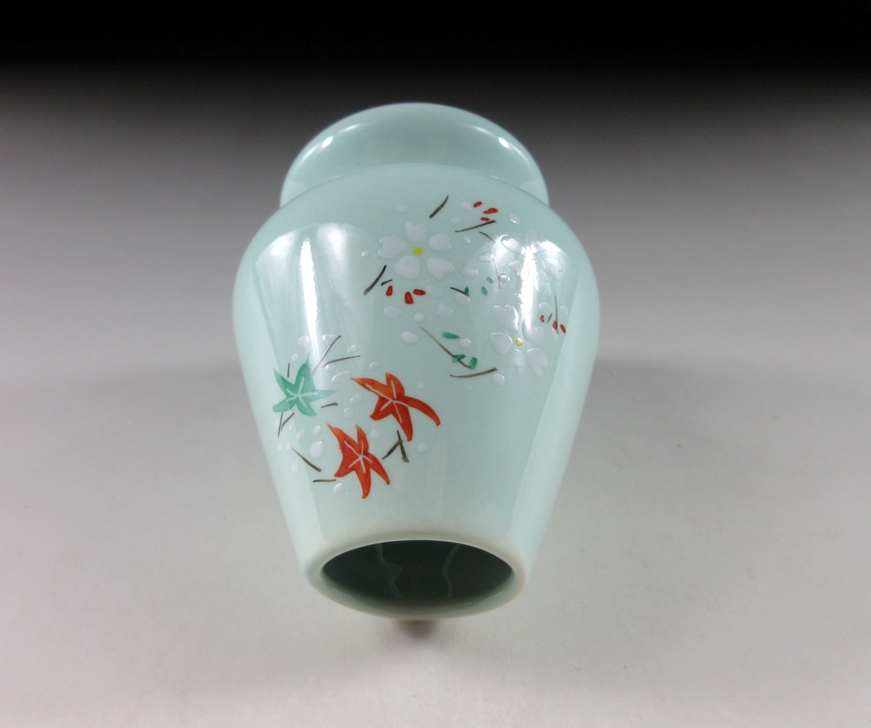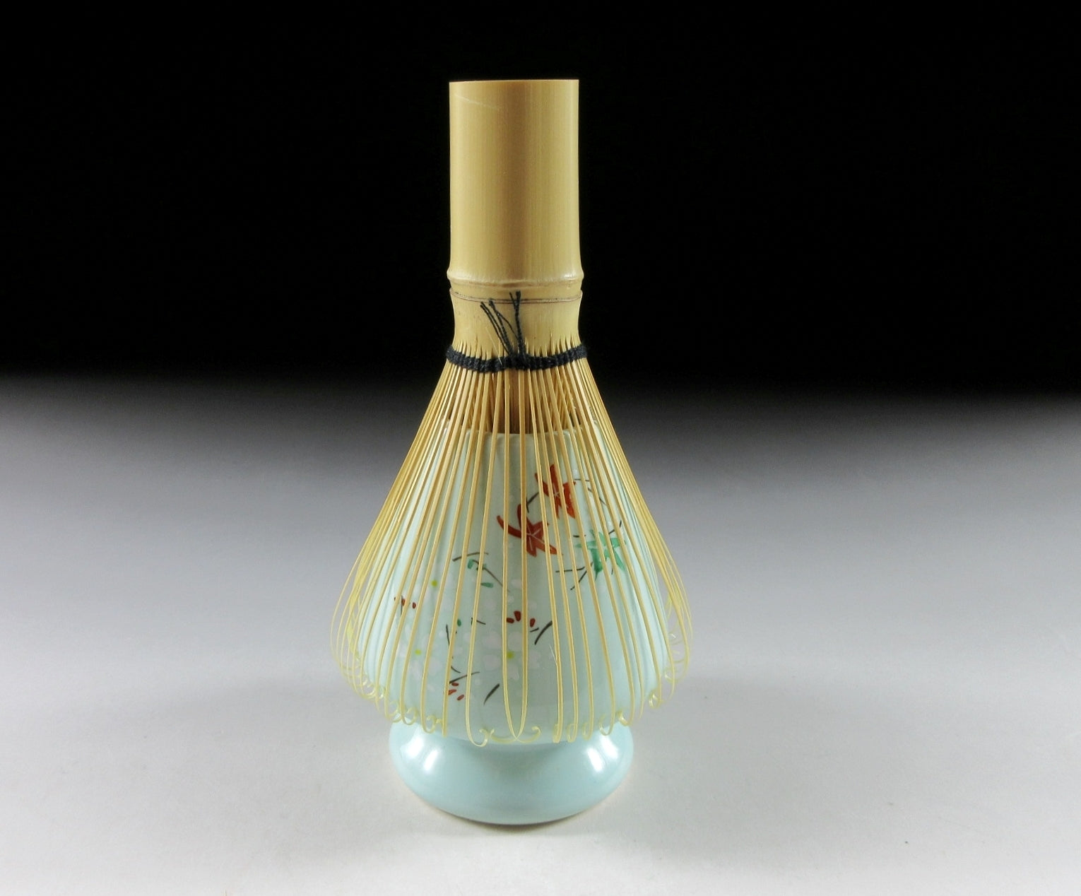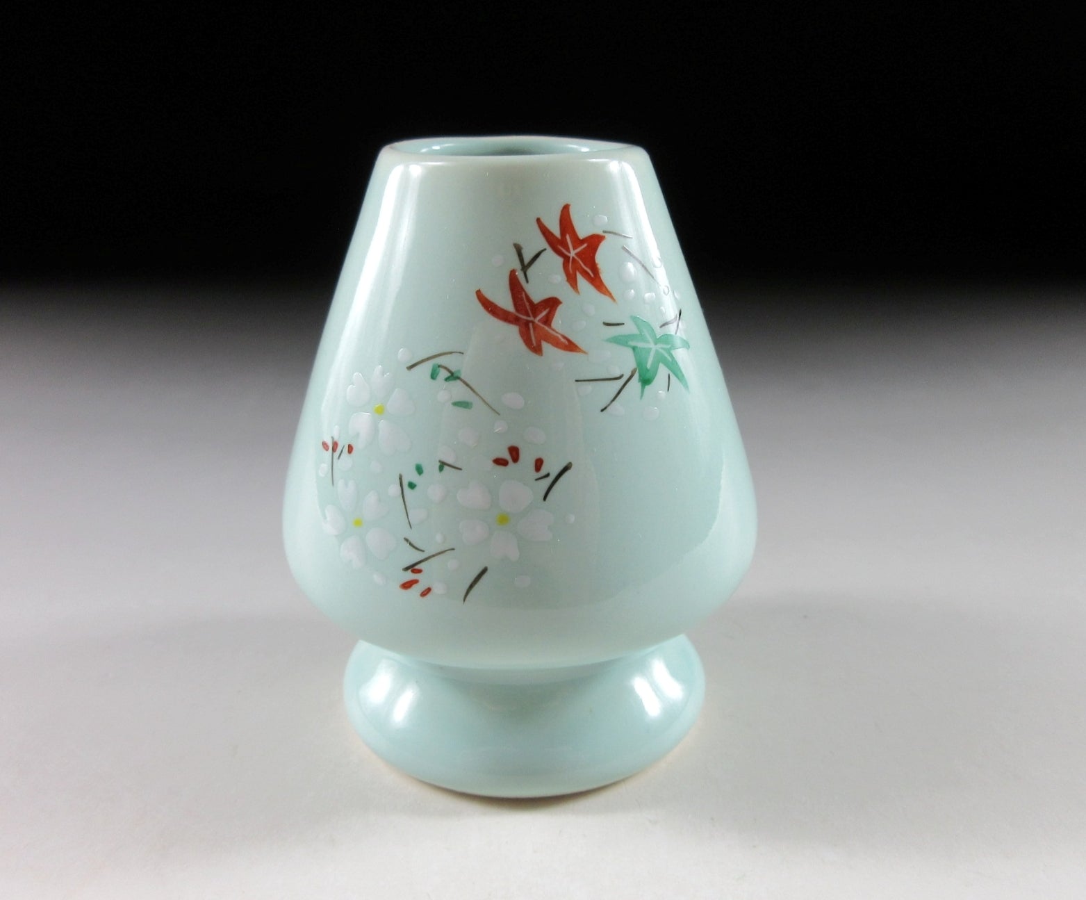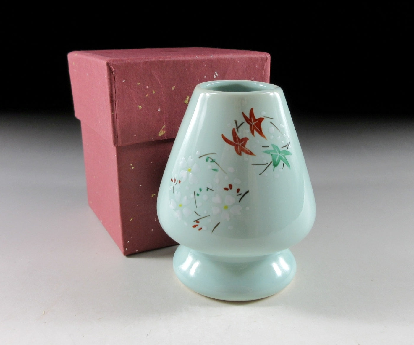 This listing is for a hand-painted chasen tea whisk shaper made by noted potter, Yagi Kaiho. The shaper’s job is to help your chasen maintain its shape whilst drying. After the tea whisk is dried it should be stored in a chasen zutsu. Care should be taken when placing your chasen on the shaper. Not placing the tines properly may result in broken ends. The shaper in this listing has a nice smooth surface which won’t snag the tines on your tea whisk, and it features hand-painted depictions of red momiji leaves and white sakura blossoms. Viewing autumn leaves and cherry blossoms are traditional leisure activities dating back to the Heian Period. The vibrant red and yellow colours of autumn and dainty pink in spring delight people of all ages, and outdoor tea ceremonies are particularly enjoyable during this time.